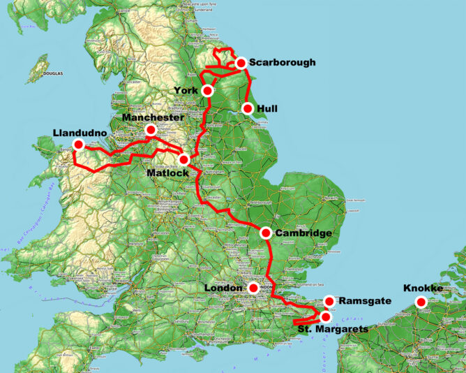 Dieses Jahr gab es Urlaub in England. Na h einem Stop in Knokke in Belgien geht es mit der Fähre nach Hull, und dann langsam südwärts nach Dover, von woraus wir wieder aufs Festland übersetzen