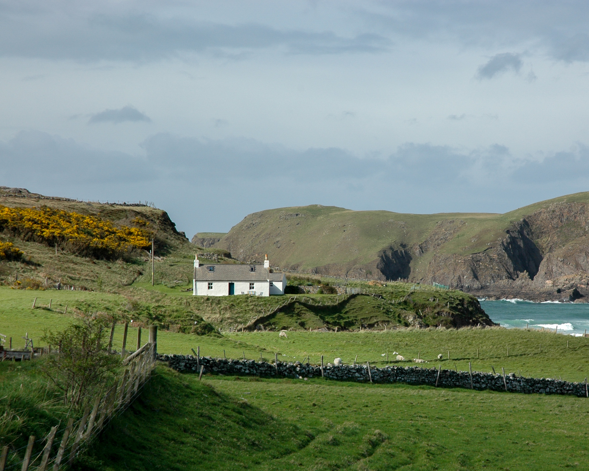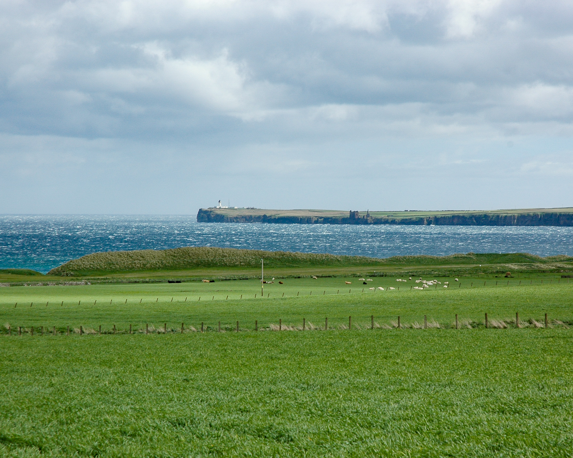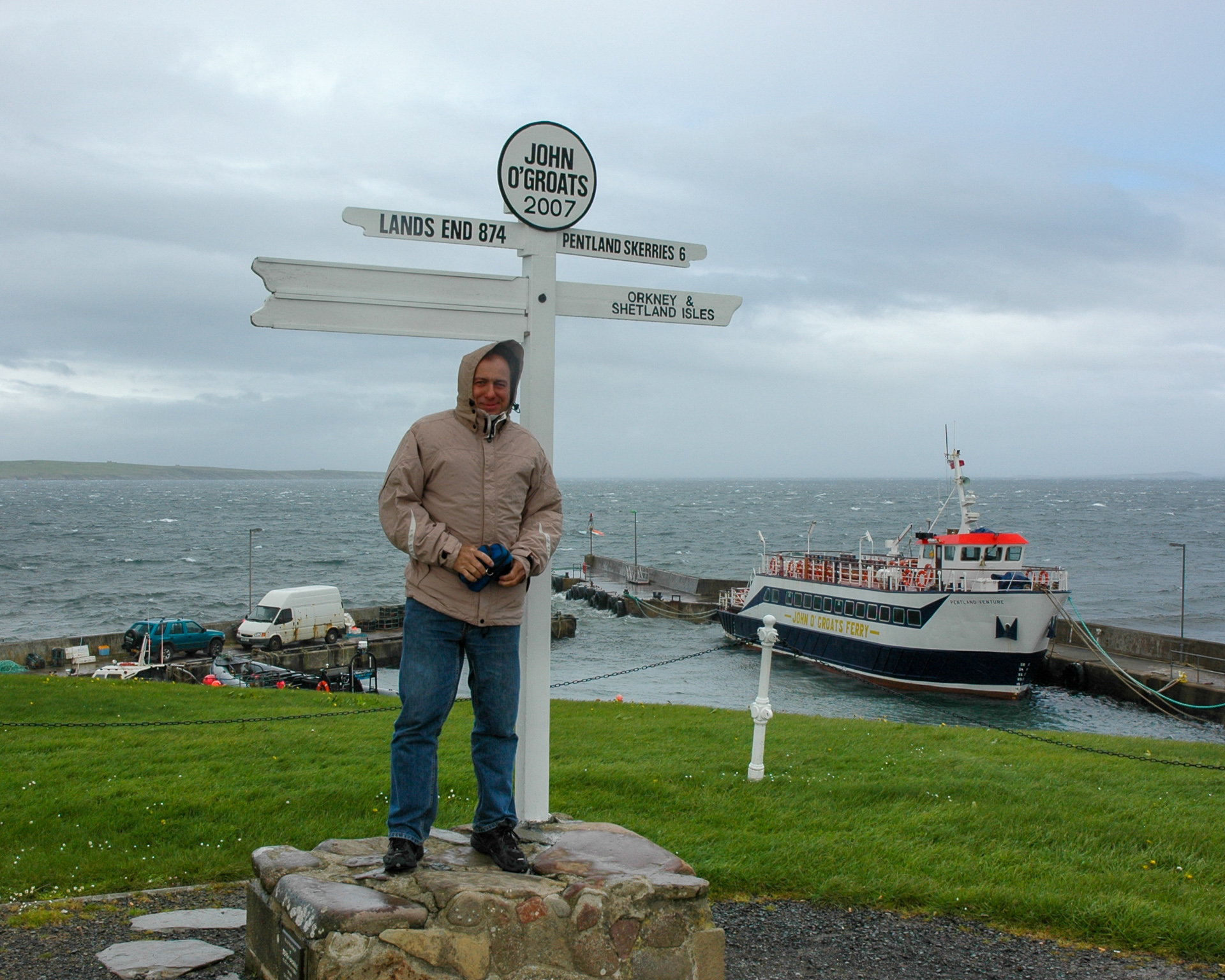 Da sind wir nun, in John O’Groats am Fotopunkt oberhalb des kleinen Hafen, während eines der vielen Regenschauer. Im Pub dort machten wir Pause, und dann ging es weiter, zunächst zum Duncansby Head Lighthouse und anschliessend entlang der Nordküste Richtung Osten.