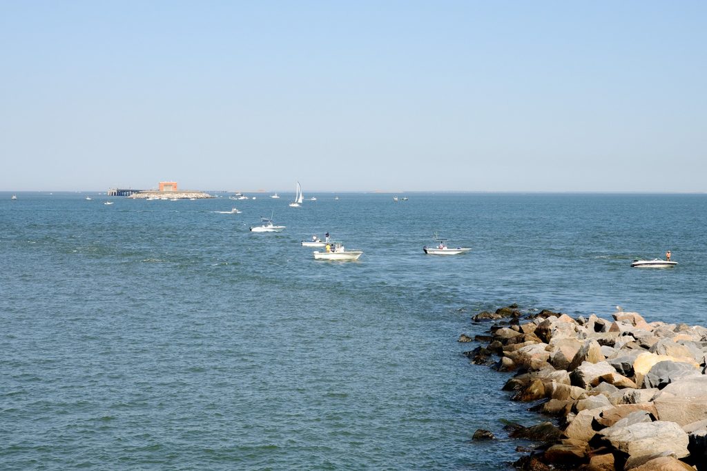 Sonntag Morgens gibt es Brunch im Restaurant und es ist ziemlich voll, die Pier komplett mit Anglern besetzt. Norfolk ist ein großer Marinestützpunkt, und durchs Fernglas sieht man in den Häfen einige große Kriegsschiffe liegen.