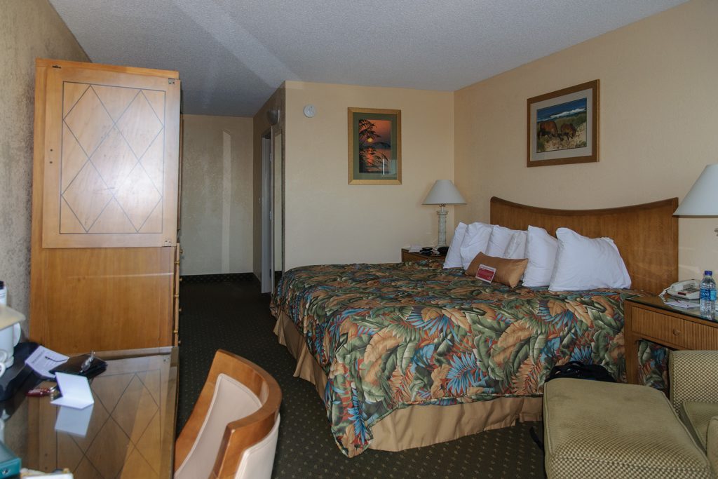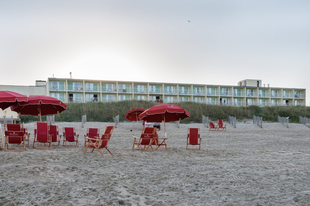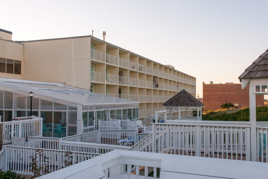 Wir leisten uns ein Eis, das etwas größer ausfällt, da ich die Wörter für Waffel und Kugel verwechsel, und dann geht es wieder weiter bis zum Ziel auf den Outer Banks, Nags Head. Einquartiert haben wir und im Ramada Plaza. ‚Fading Glory‘ kann man zu dem Hotel sagen, früher war es wohl mal das erste Haus am Platze, jetzt ist es ein bisschen abgewohnt. Wir haben „Dune View“ gebucht, d.h. den zweiten Stock hinter den Dünen, bekommen aber das Eckzimmer, von dem man auch ein bisschen Ozean sehen kann.