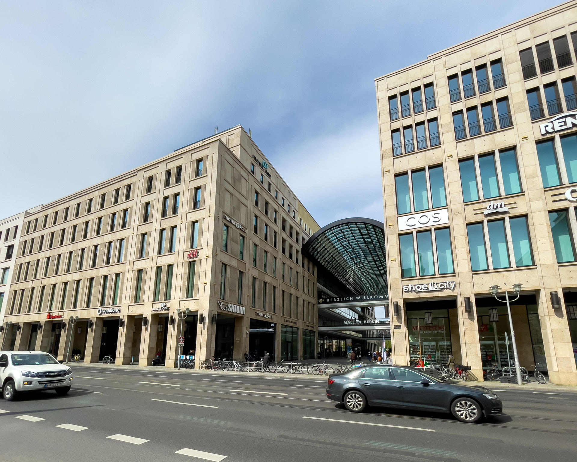 Jetzt bin ich die Leipziger Straße entlang gelaufen, auf der südlichen Seite, und in Höhe des Bundesrats steht man dann auch gegenüber meinem Hotel, dem Motel One. Es liegt in einem Eckgebäude am Eingang der Mall of Berlin.