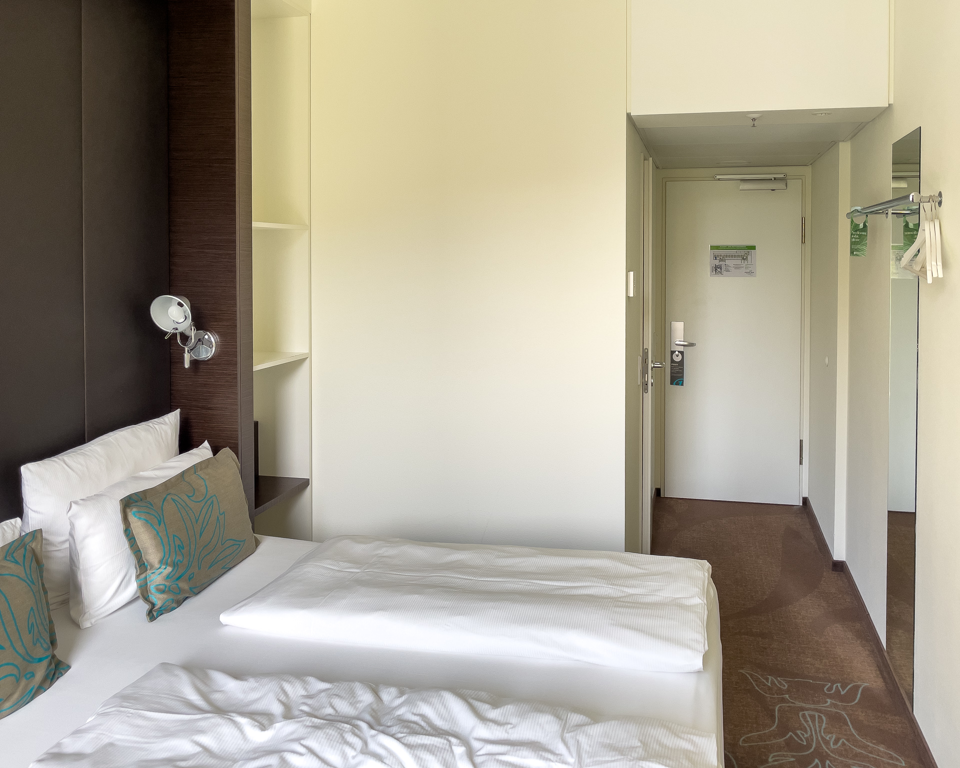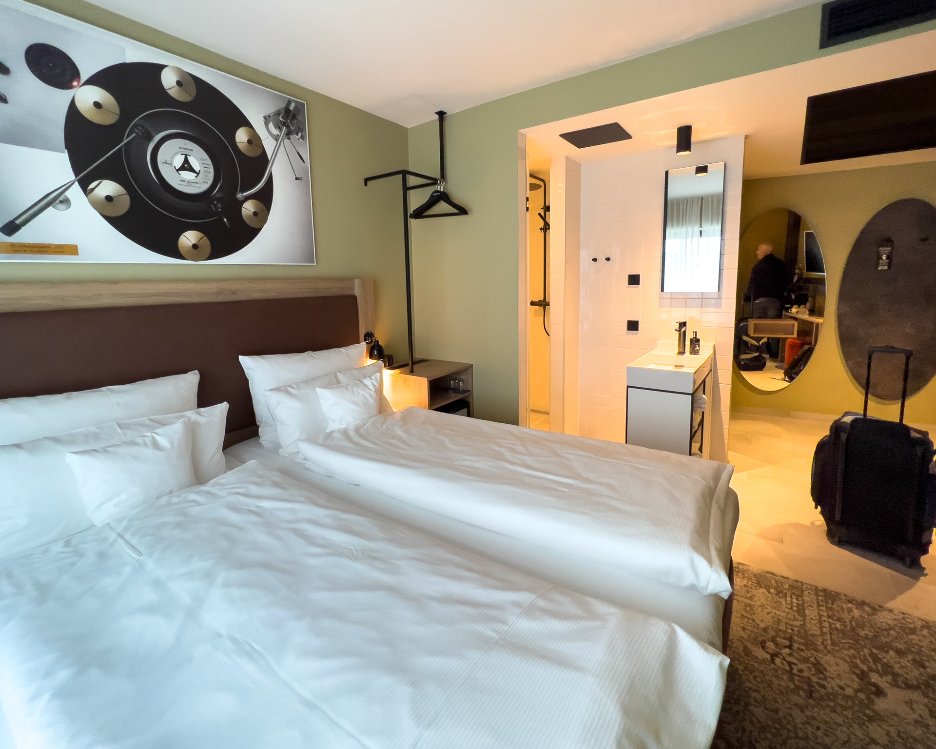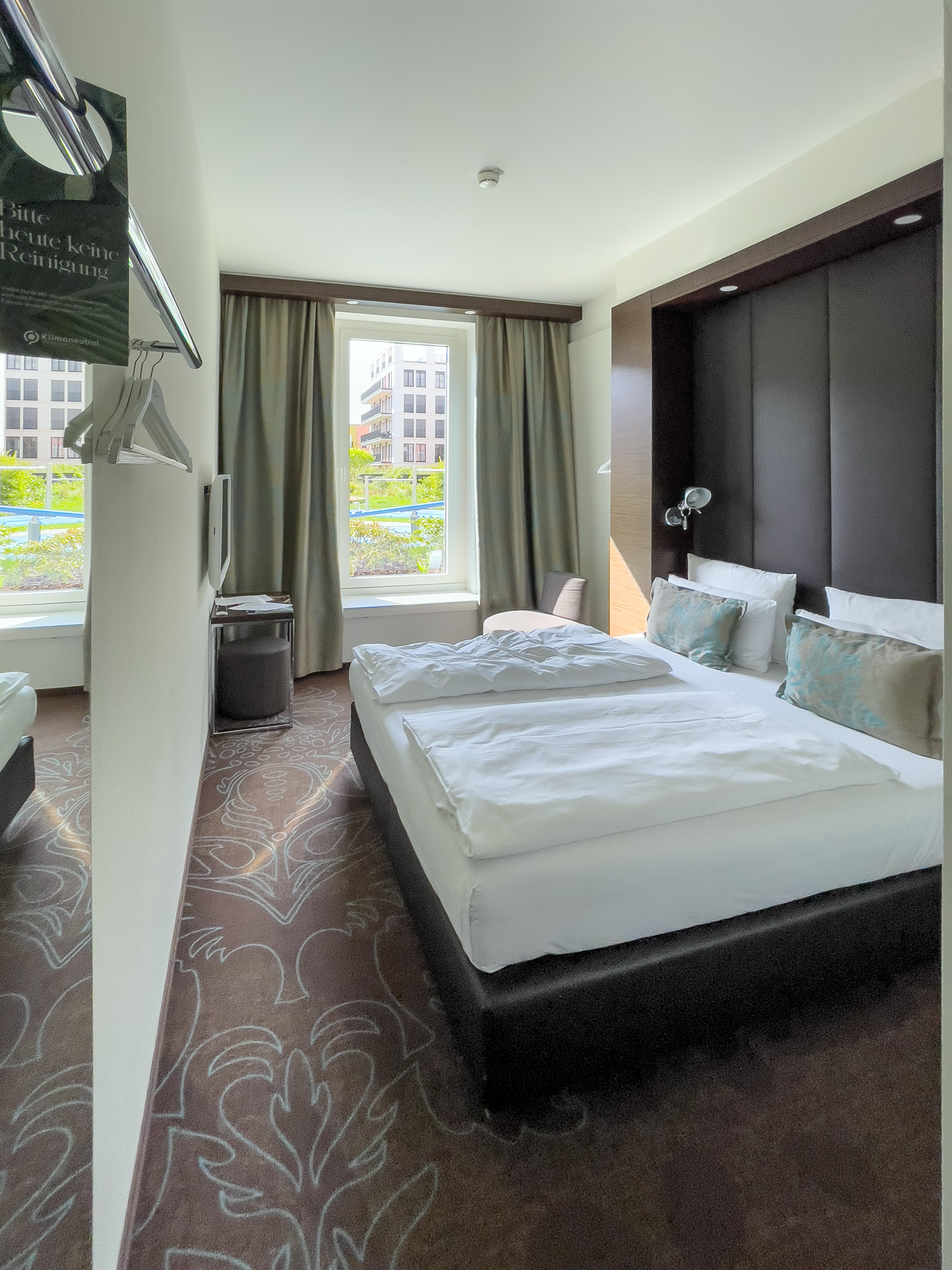 Nun, in Hannover hat man dieser Begeisterung einen guten Dämpfer verpasst. Das lag zum einen am Zimmer, das wir diesmal sehr unpraktisch fanden. Durch einen hereinragenden Lüftungsschacht war es am Bett ziemlich eng, während es an der Tür eine große und eigentlich nutzlose Freifläche gab. Und der ins Zimmer ragende freistehende Waschtisch viel auch nur als Hindernis auf. Und was uns in Kiel nicht aufgefallen war, da wir dort am Montag angereist waren: Sonntags ist der Service in den ‚me and all‘ Hotels wohl überall stark eingeschränkt, selbst einen Drink haben wir nur ausnahmsweise bekommen, da vorher eine Veranstaltung war, wie man mir umfangreich erklärte. Und, machen wir die Liste voll, das Frühstück war auch nicht so besonders.