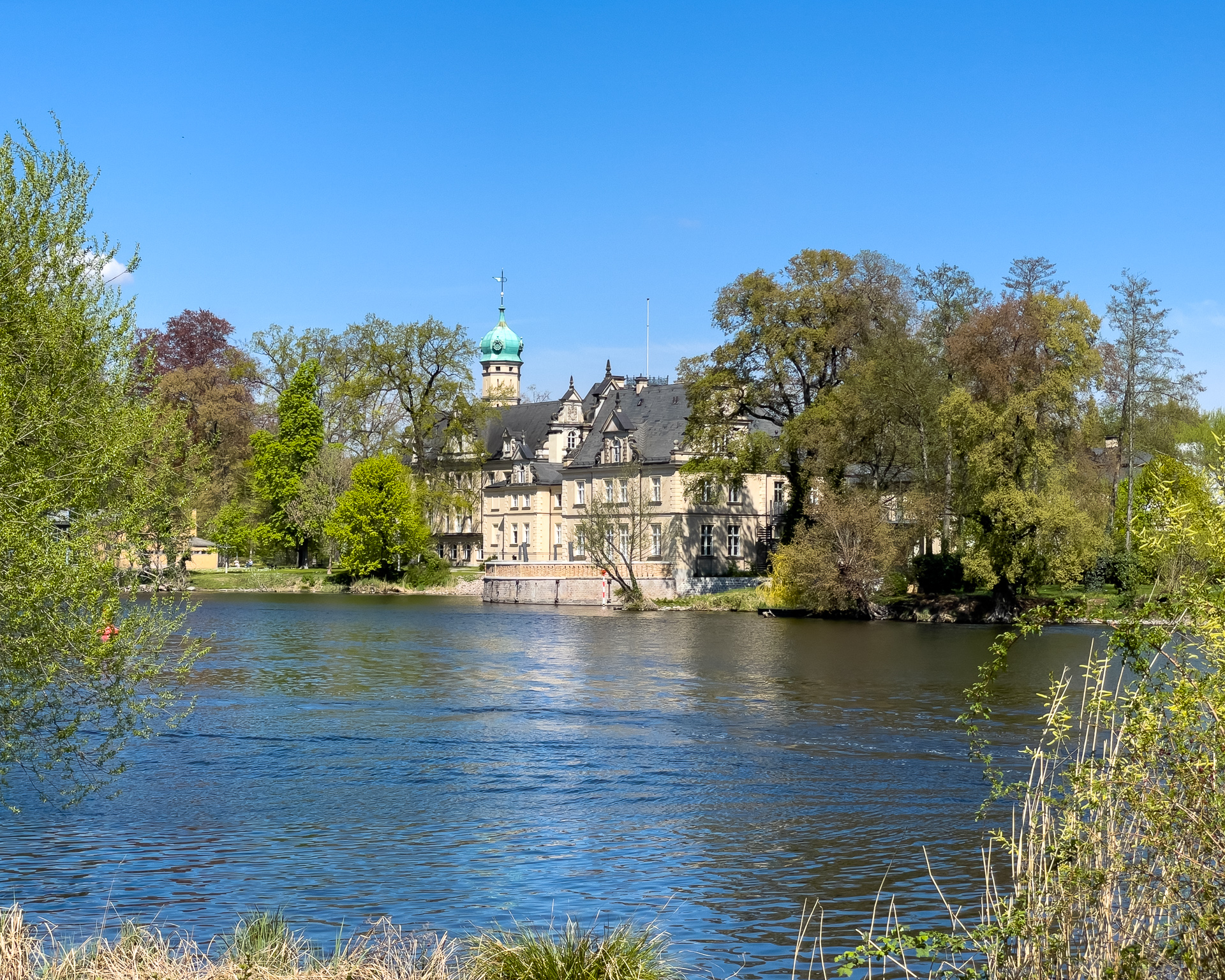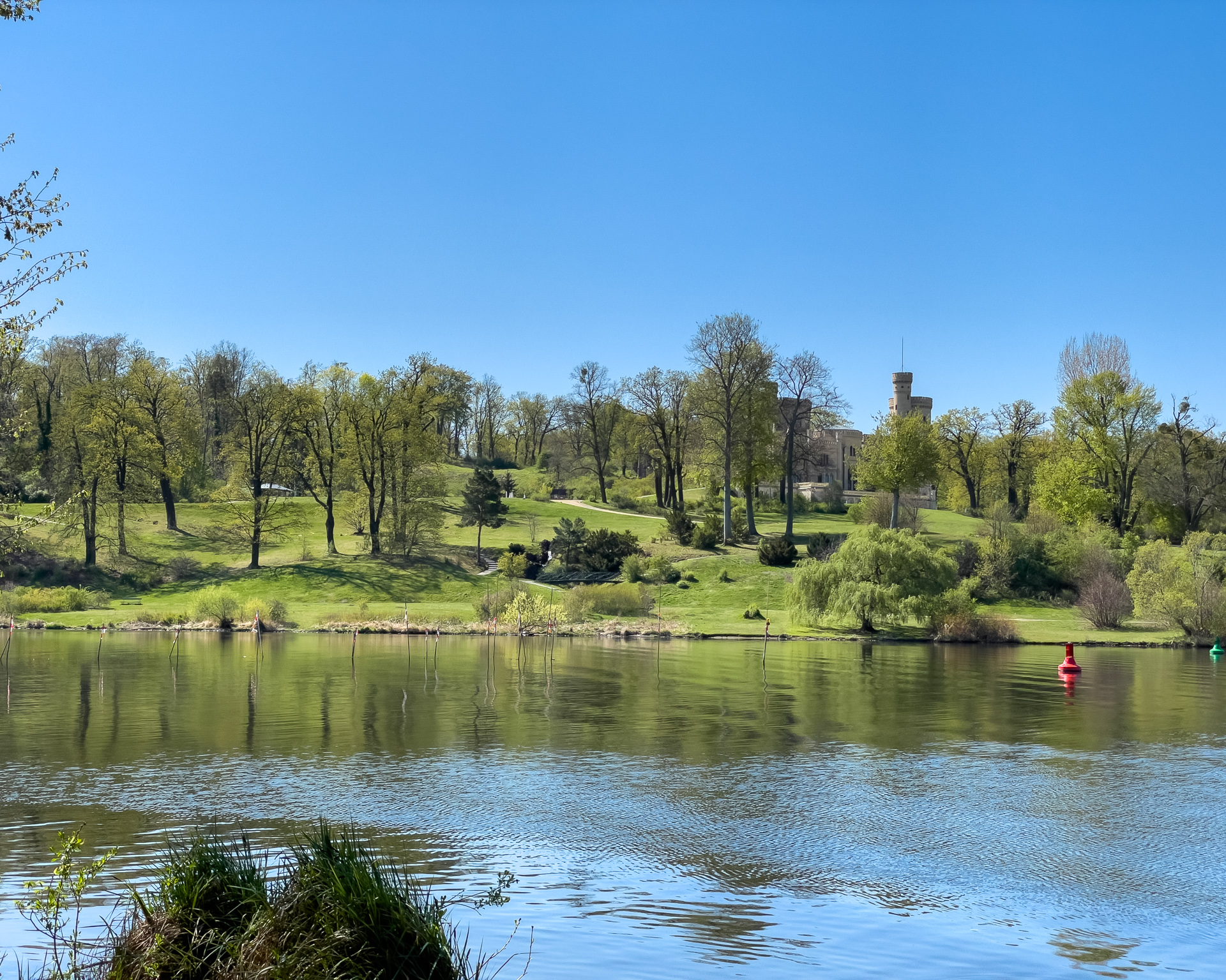 Über die Parkbrücke gehe ich jetzt wie geplant nach Babelsberg und dort zunächst auf dem Uferweg Richtung Dampfmaschinenhaus. Nun gibt es endlich gute Blicke auf das Jagdschloss.