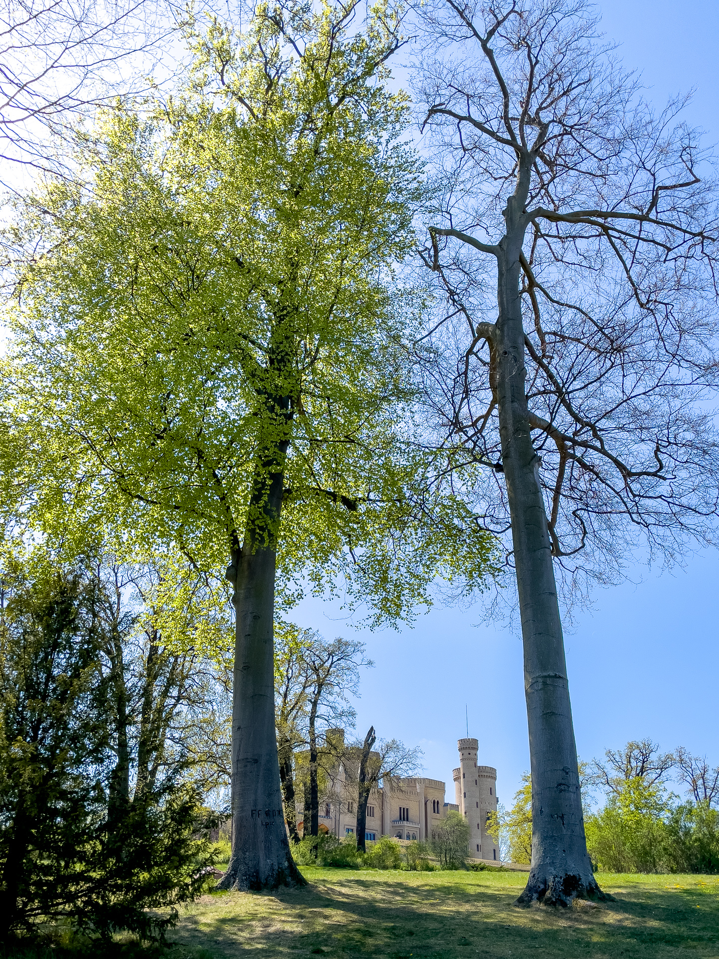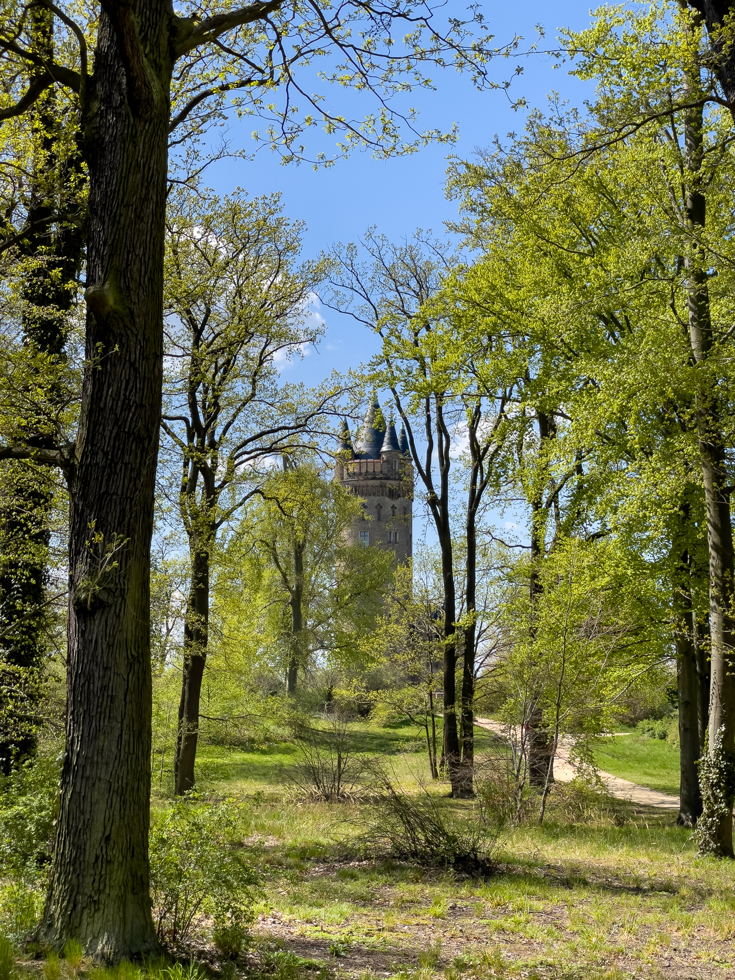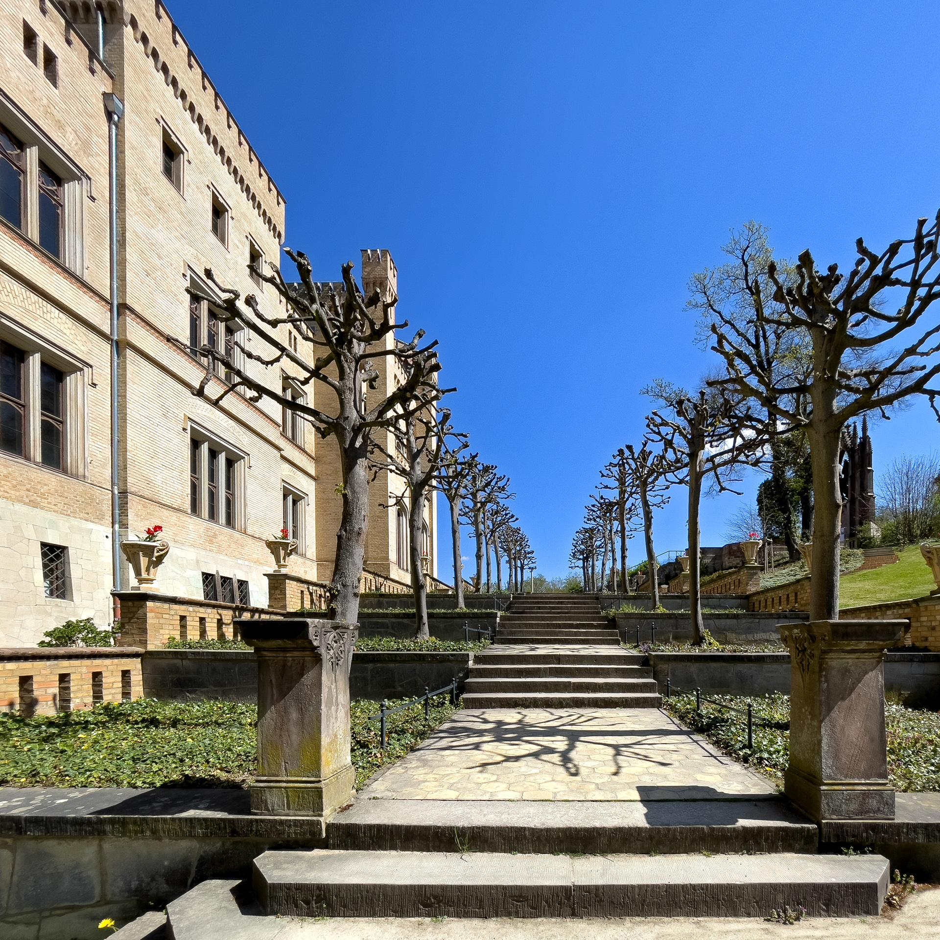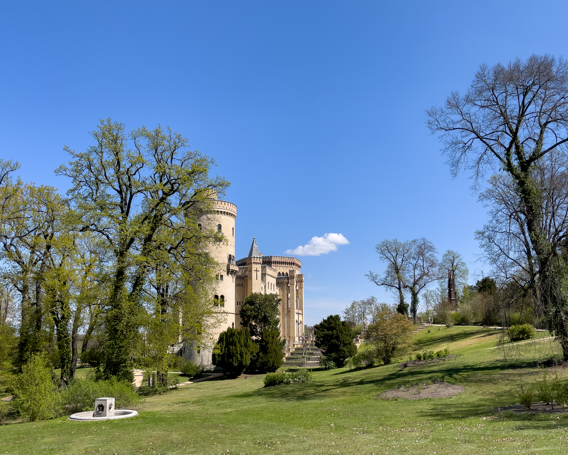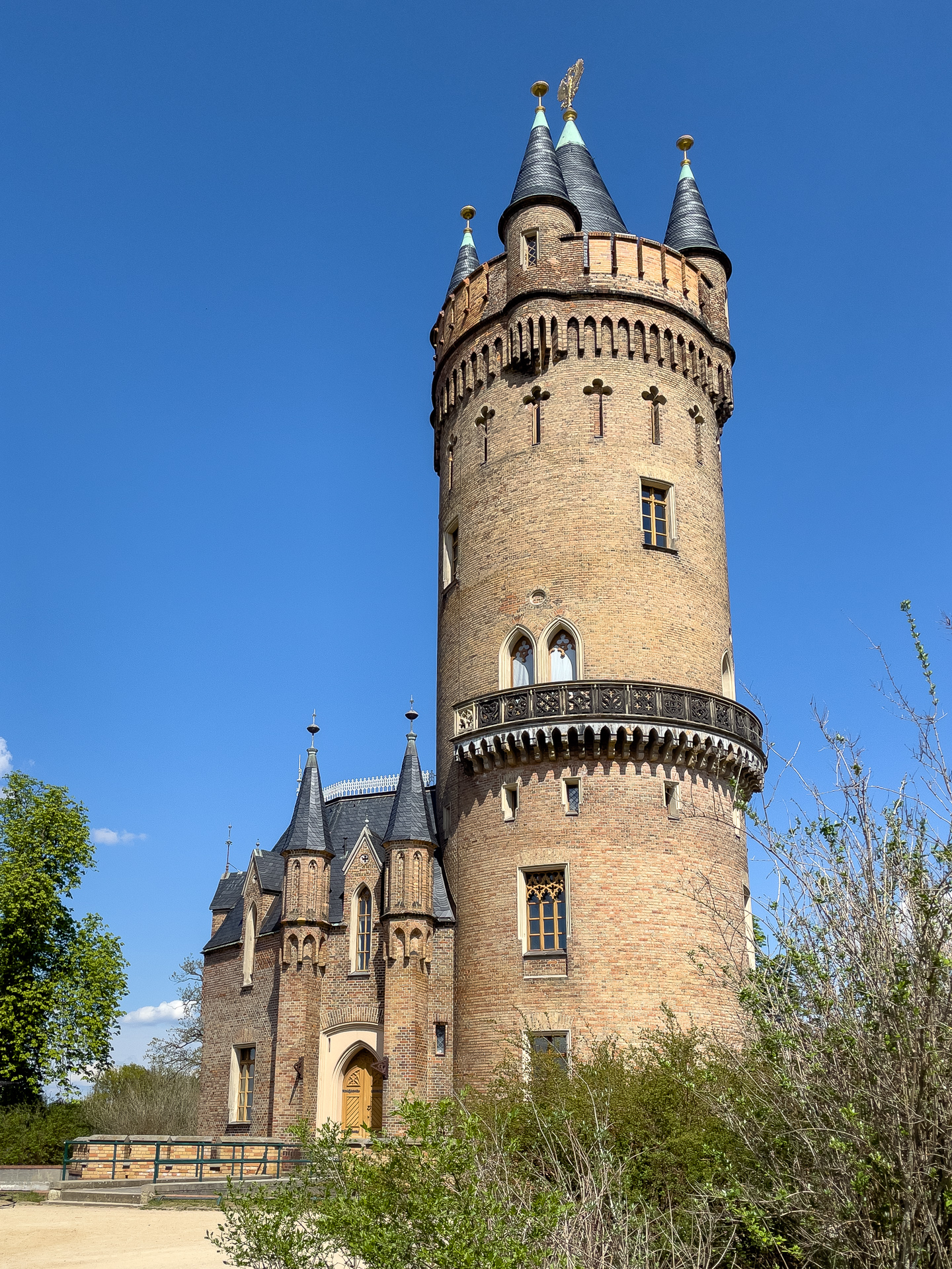 Ein paar Meter höher liegt das Schloss Babelsberg, also verlasse ich den Uferweg am Wilhelm-Wasserfall, der sich leider fotografisch nicht umsetzen lässt, und mache mich an den Aufstieg. Schloß Babelsberg wird dann einmal von Ost nach West umrundet: