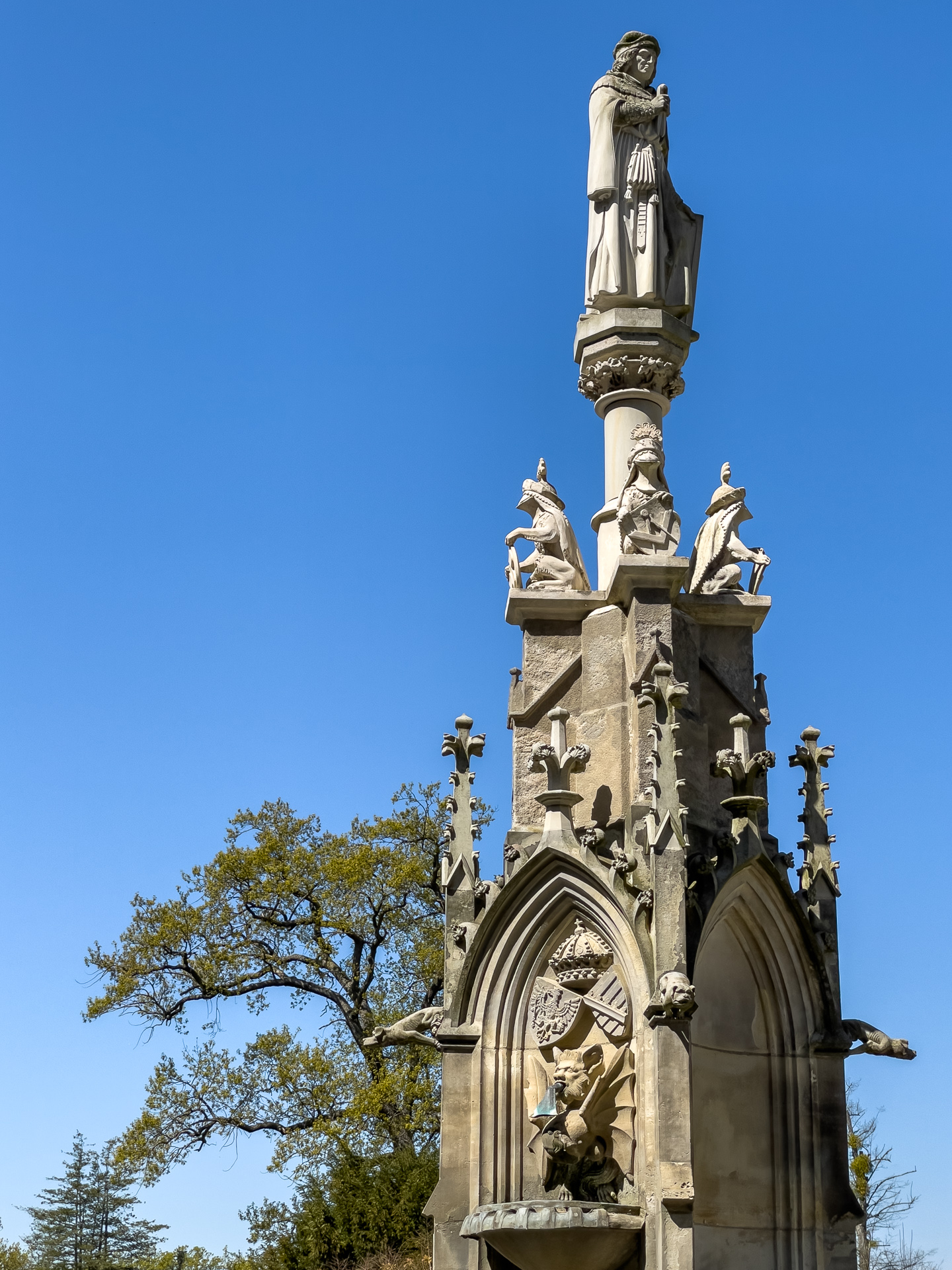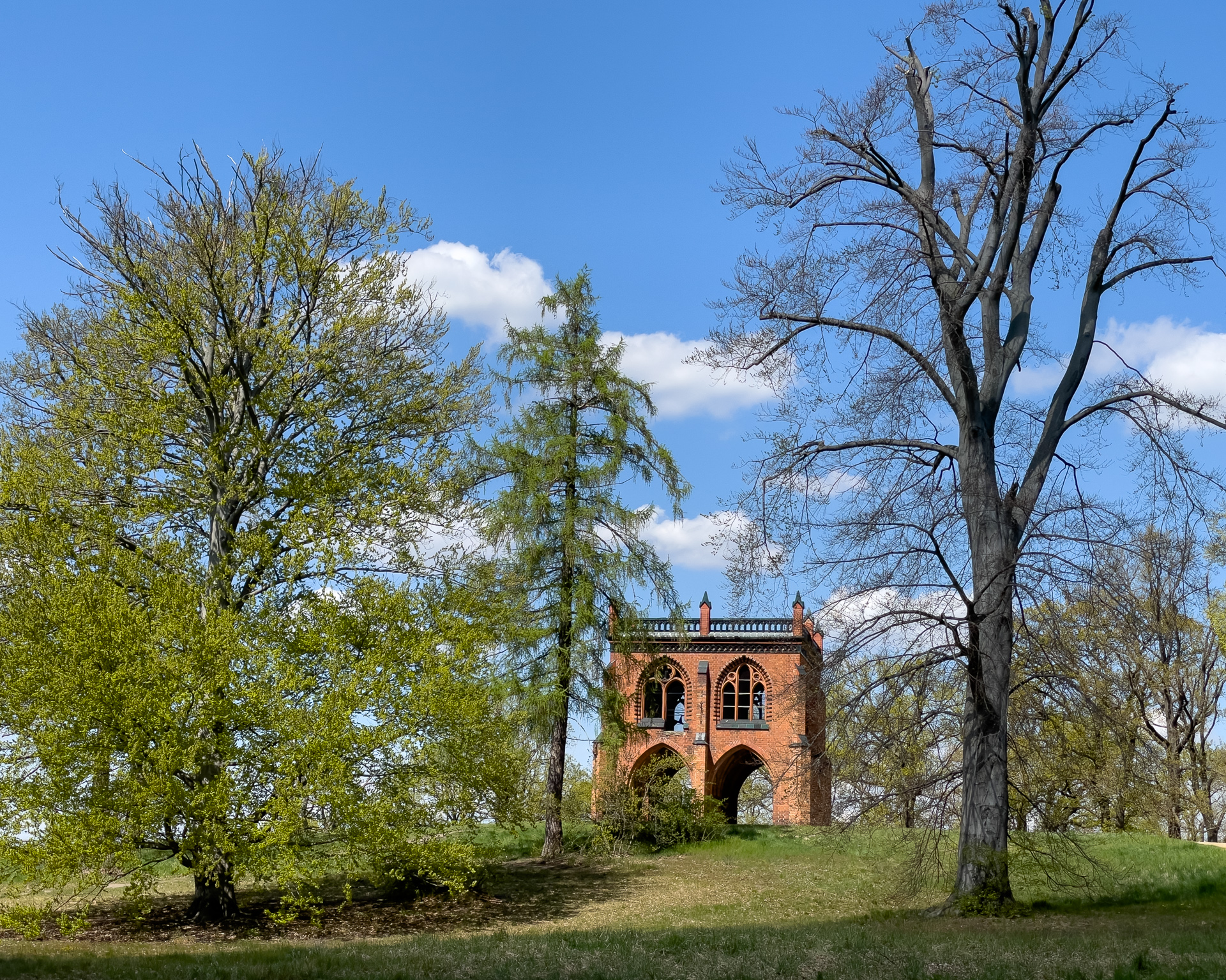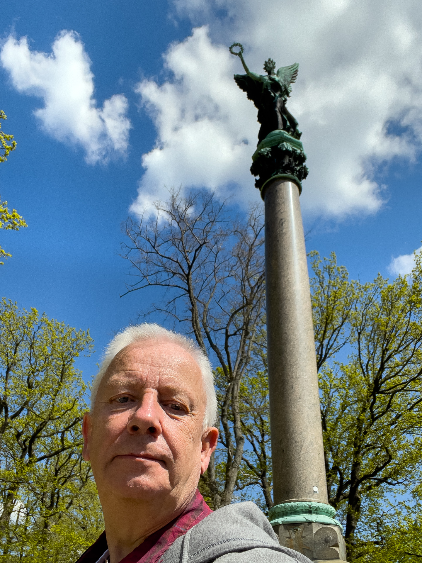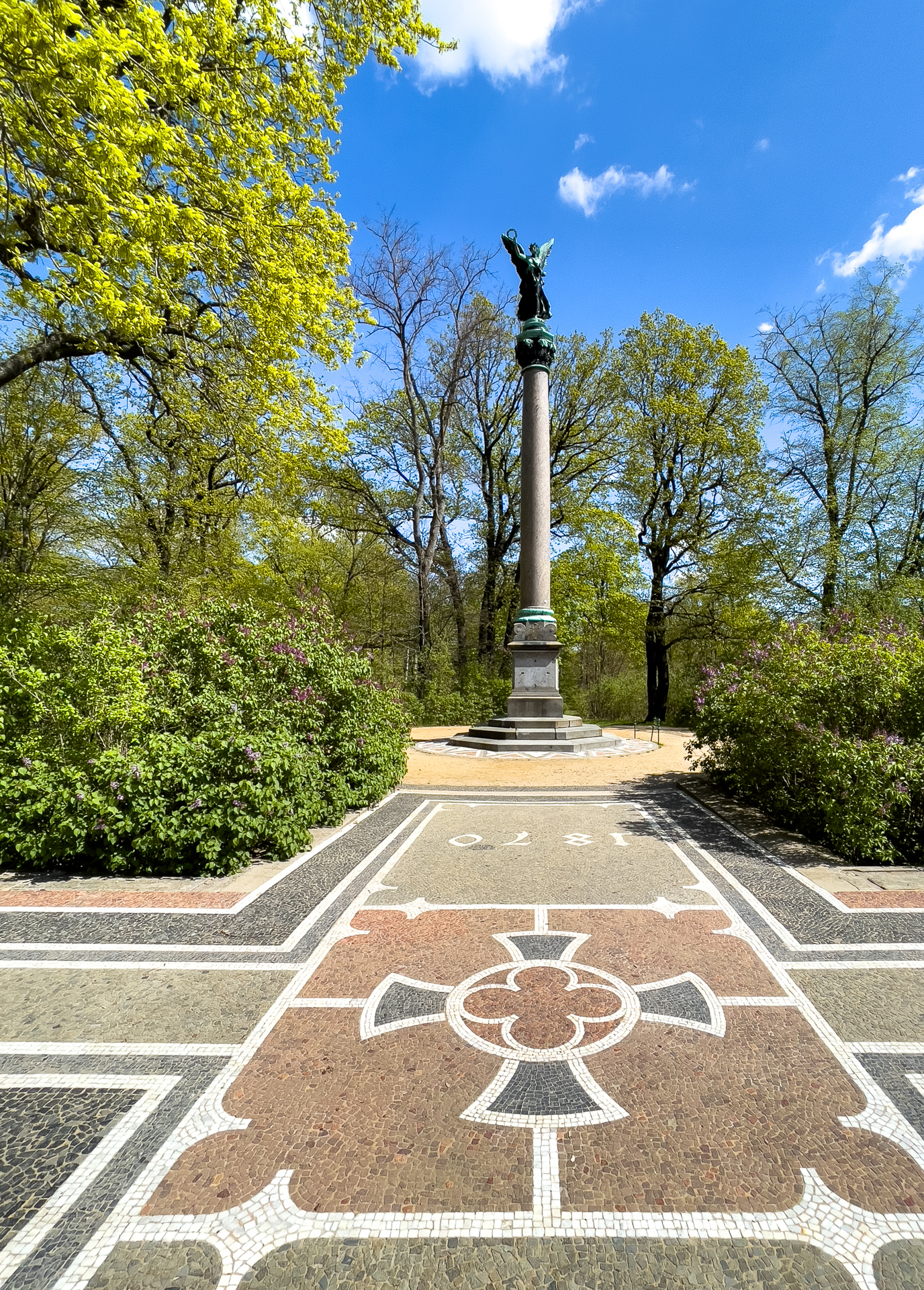Meine Idee war, jetzt so langsam in Richtung Potsdam weiterzugehen und dabei noch an ein paar „Attraktionen“ (d.h. Gebäuden) des Parks vorbeizugehen. Der Flatowturm bot sich dazu an. Zwar gibt es Eine freigehaltene direkte Sichtachse vom Schloss zum Turm, aber keinen direkten Weg. Wie in solchen Parks üblich, waren die Wege eher unübersichtlich und verschlungen. Irgendwie lief ich also weiter den Berg hoch und hab es tatsächlich geschafft, den höchsten Punkt des Parks zu erreichen, laut Openstreetmap ist dies der „Gipfel“ des Babelsbergs auf 77,4 Meter Höhe. Um meine „Leistung“ einzuschätzen: Die Havel bei Potsdam liegt auf ca. 30 Meter Höhe. Jedenfalls, dort oben hat man „zu Kaisers Zeiten“ (ganz genau 1866, und ja, da gab es noch keinen Kaiser, sondern nur einen preussischen König) gleich eine Siegessäule hingestellt. Sie soll an den Sieg Preussens über Österreich erinnern.