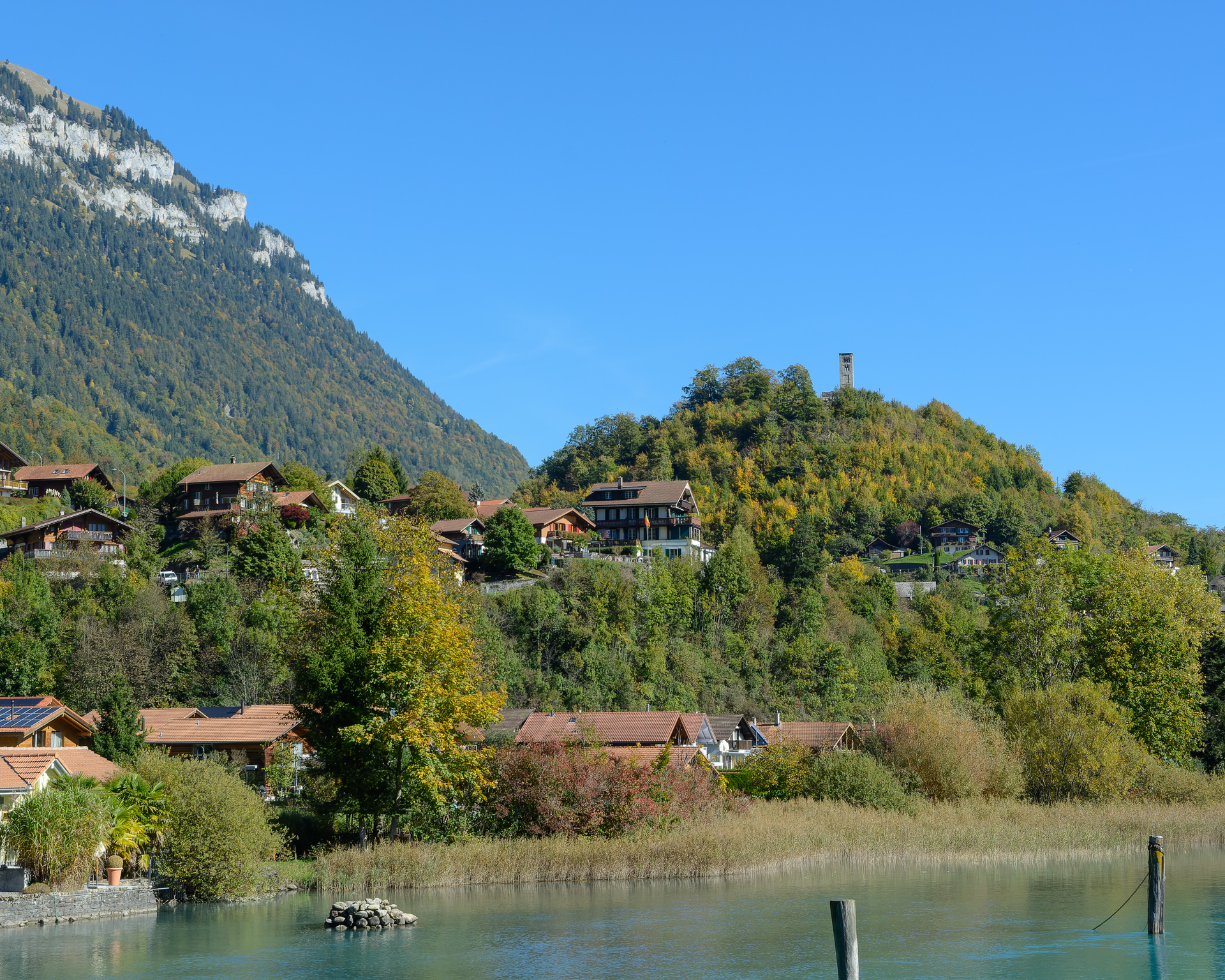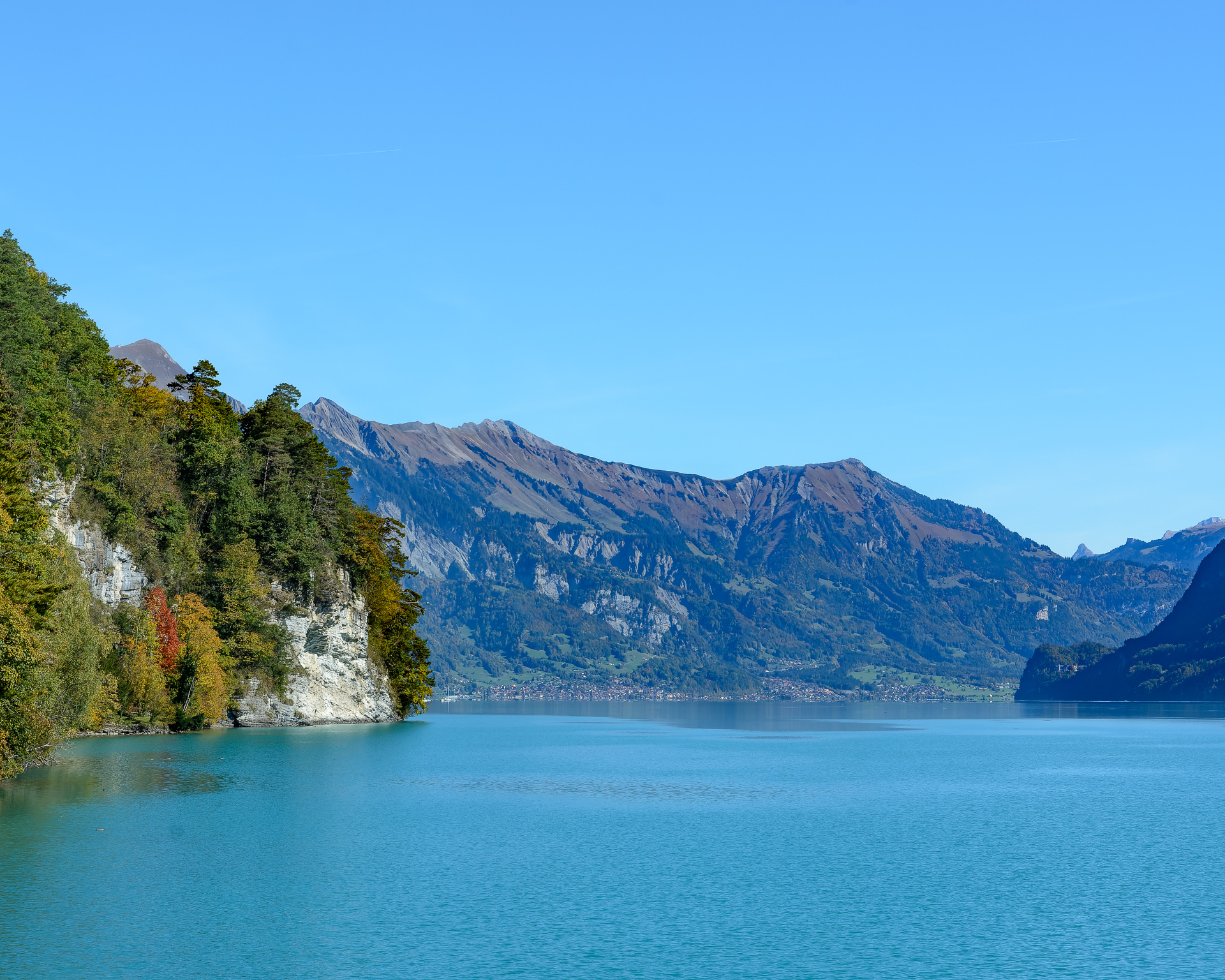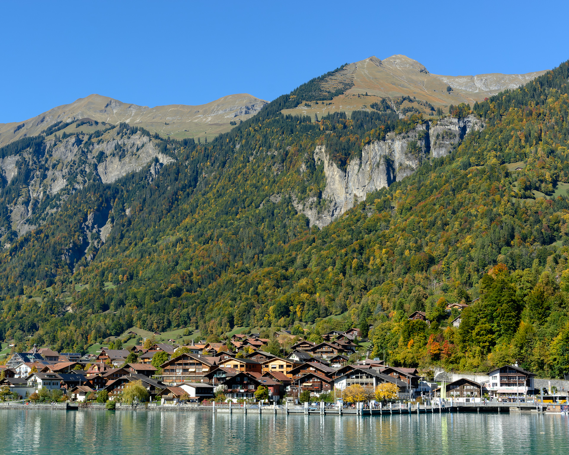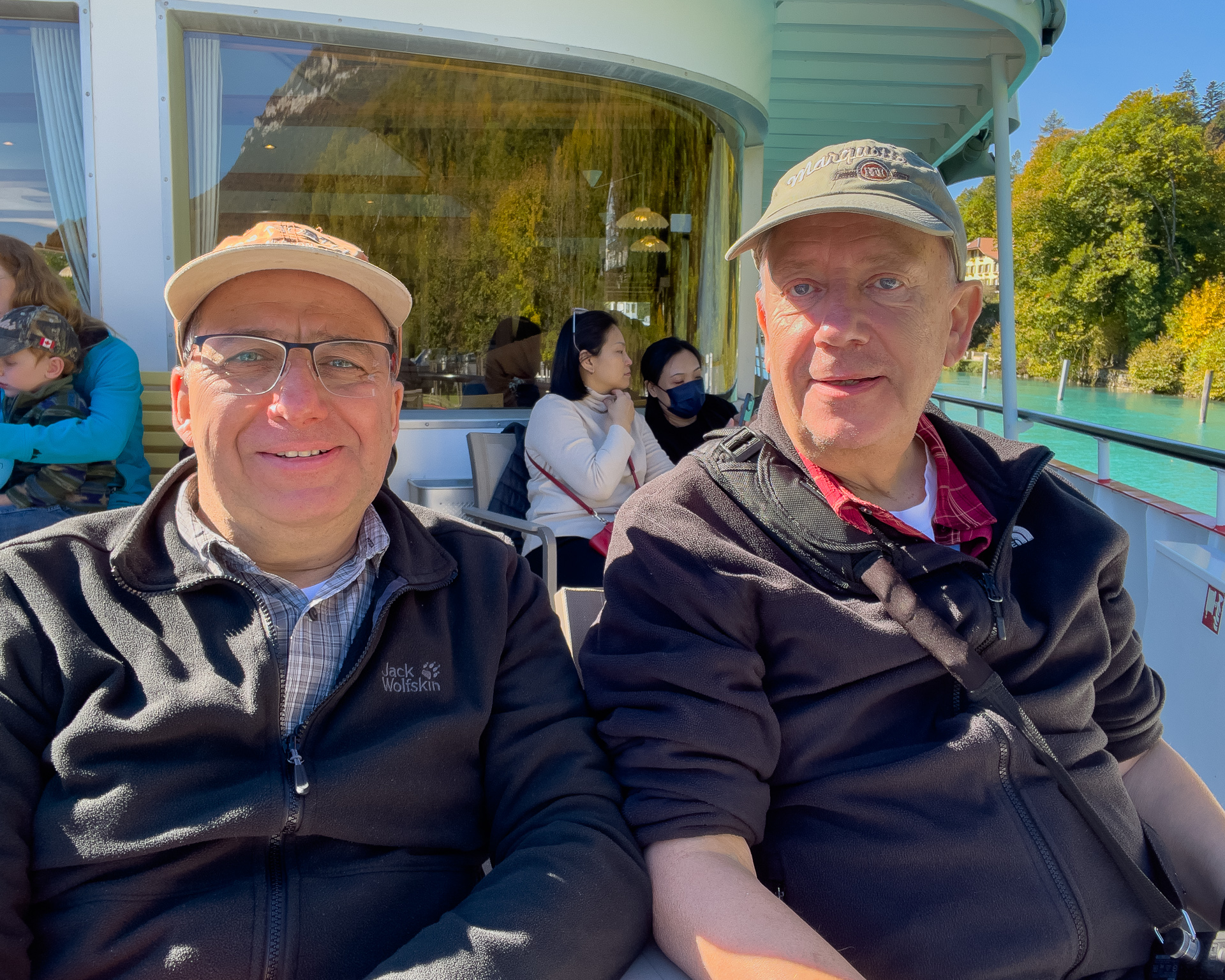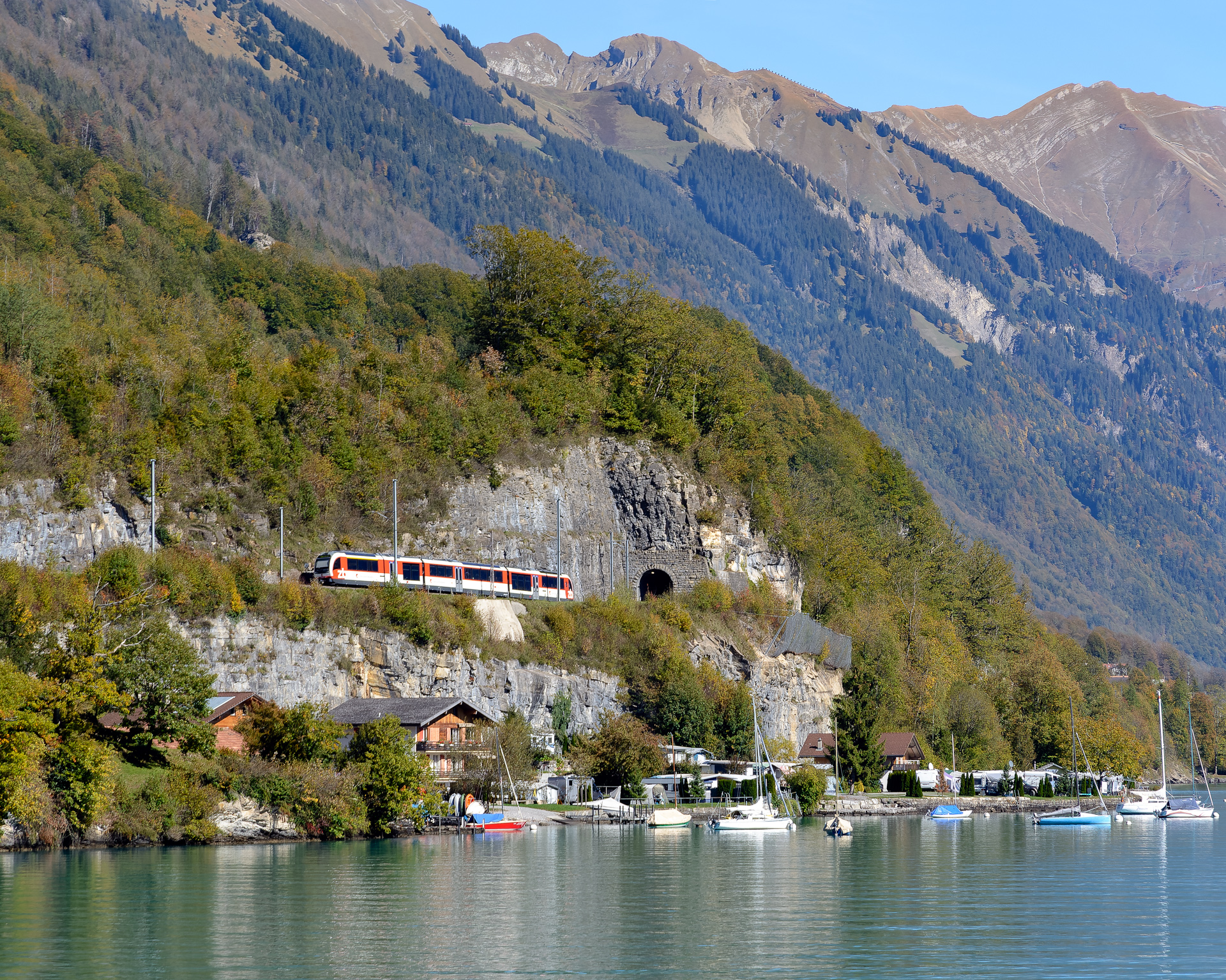 In Interlaken gibt es wieder etwas Hetze. Die Schiffe aus Thun enden in Interlaken West, die Richtung Brienz fahren in Interlaken Ost ab. Dazwischen liegt der Ort Interlaken. Die Strecke ist zwar nicht lang, aber in 15 Minuten nicht zu Fuß zu bewältigen, wir müssen dafür die Bahn nehmen. Und die Umsteigezeiten im Schweizer Taktfahrplan sind leider manchmal etwas kurz. Aber wir brauchen uns nicht zu sorgen, auch der Zug fährt untypisch mit mehreren Minuten Verspätung, und nutzlos war das ganze sowieso, denn an der Anlegestelle angekommen stellen wir fest, dass der Herbstfahrplan gilt und um 12 Uhr kein Schiff fährt. Wir müssen eine Stunde warten, da hätten wir auch gemütlich zu Fuß gehen können.