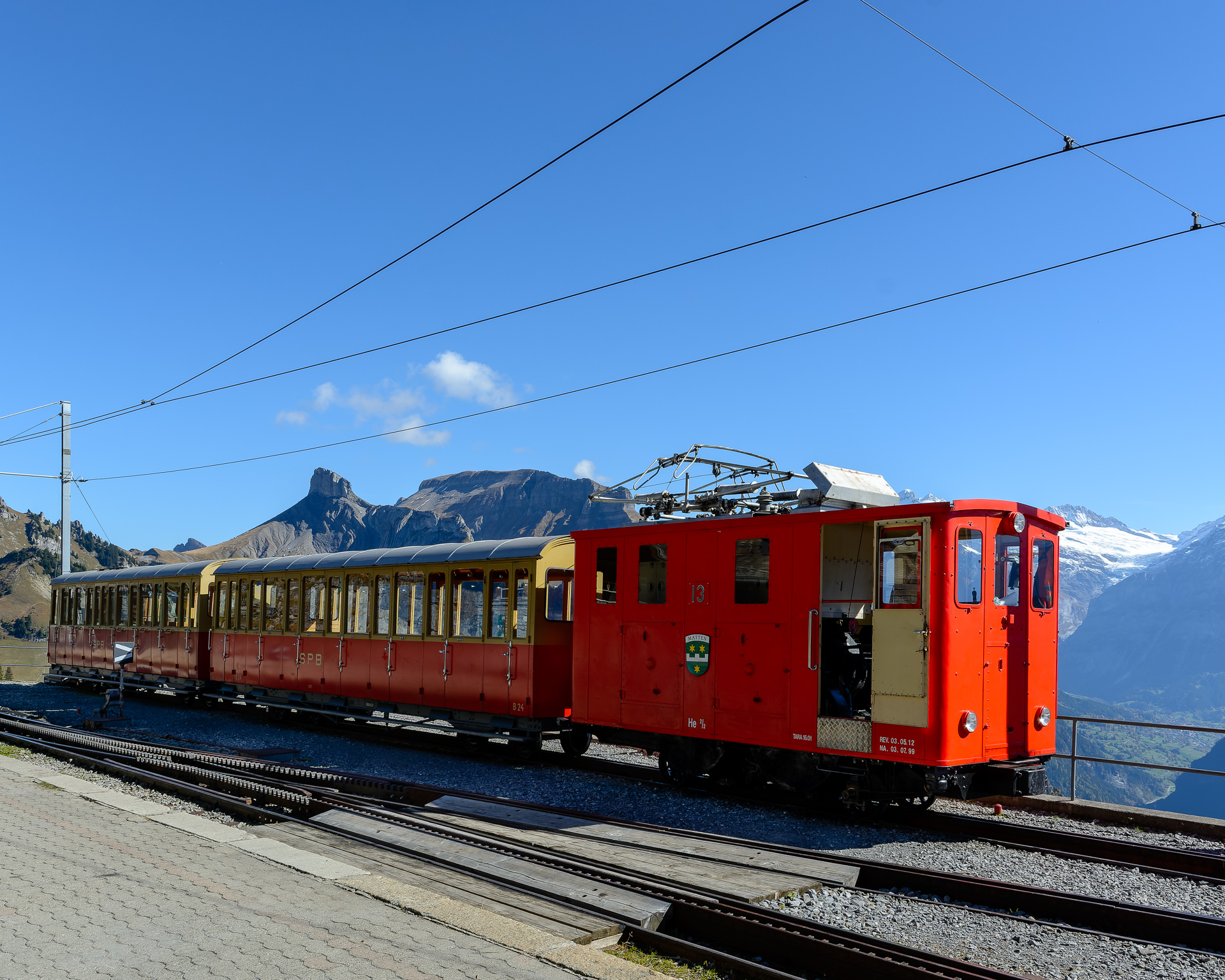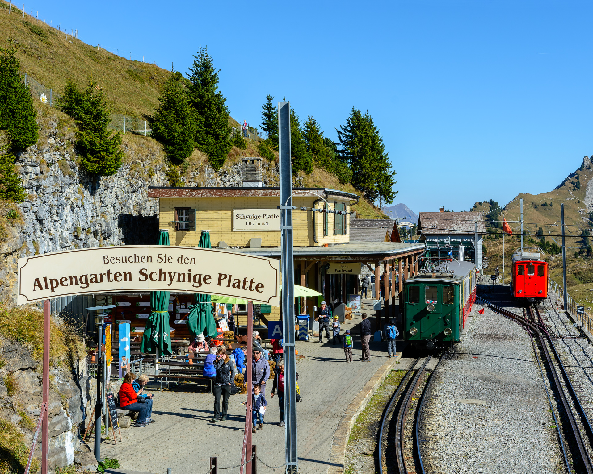 Heute wurden wir zu Gipfelstürmern. Natürlich nicht zu Fuß, sondern mit einer Bergbahn. Davon hat man hier mehr als genug zur Auswahl, ich hatte mich für eine Fahrt auf die Schynige Platte entschieden. Der Weg von Spiez dahin ist recht einfach mit zweimal Umsteigen. Zunächst nach Interlaken, dann mit der Berner Oberland Bahn eine Station weit nach Wilderswil. Dort startet dann die Schynige Platte Bahn, eine 7,3 Kilometer lange Zahnradstrecke. Die braucht ca. 1 Stunde bis zur Bergstation auf 1967 Meter Höhe. Die Bahn wird als Nostalgiebahn vermarktet, tatsächlich stammen die Loks alle aus der Zeit der Elektrifizierung ab 1911, die meisten Personenwagen sind allerdings Neuaufbauten (im historischen Design) auf alten Untergestellen.