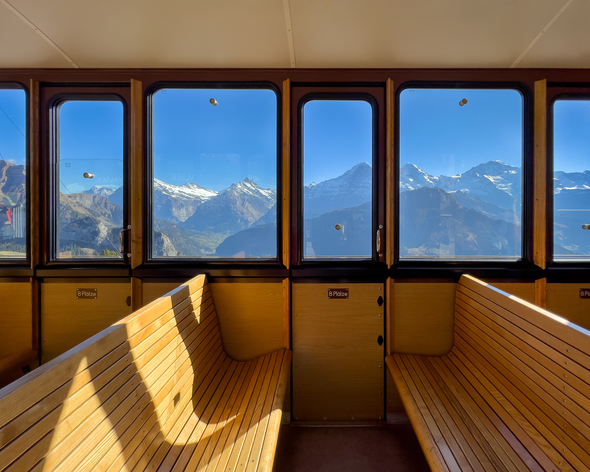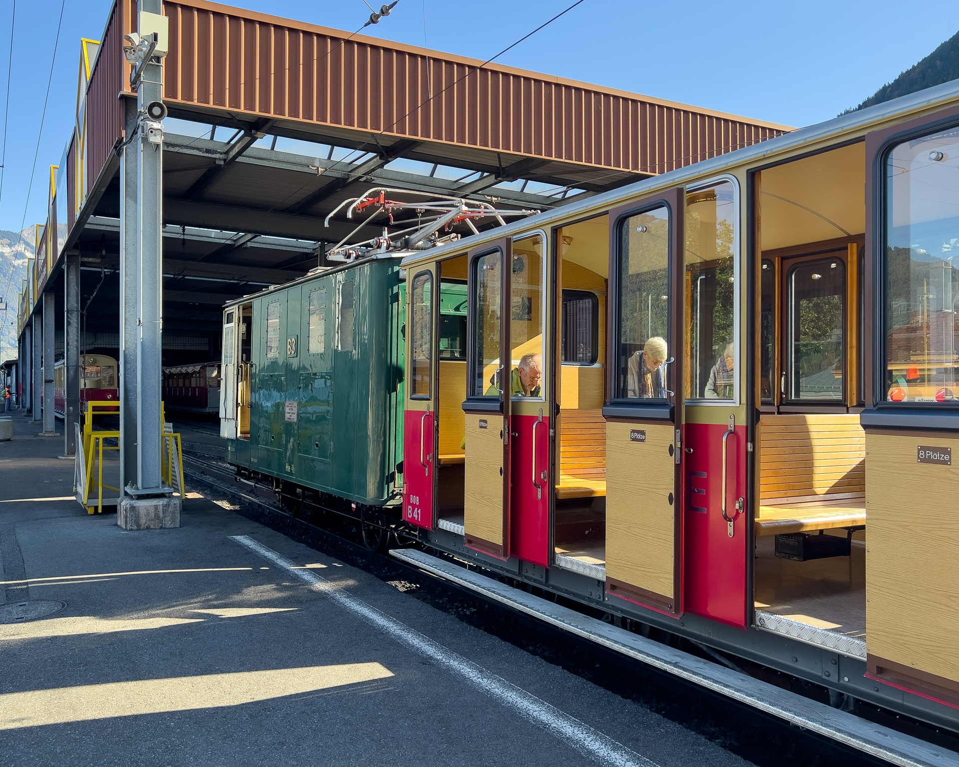 Die Fahrkarten kaufen wir nach dem gestrigen Erlebnis mit der Internetbuchung ganz klassisch am Schalter im Bahnhof, und dann geht es mit dem ellenlangen Intercity nach Interlaken Ost. Wir finden einen bequemen Platz vorne im Verstärkermodul. In Interlaken wird die BOB von Menschenmassen gestürmt, aber wir können einen Sitzplatz ergattern. Nötig war das nicht, denn nach nur fünf Minuten Fahrt sind wir in WIlderswil und müssen schon wieder aussteigen. Hier haben wir etwas Zeit, die Schynige Platte Bahn schafft nur einen 40 Minuten Takt und deshalb passen die Anschlüsse nicht immer.