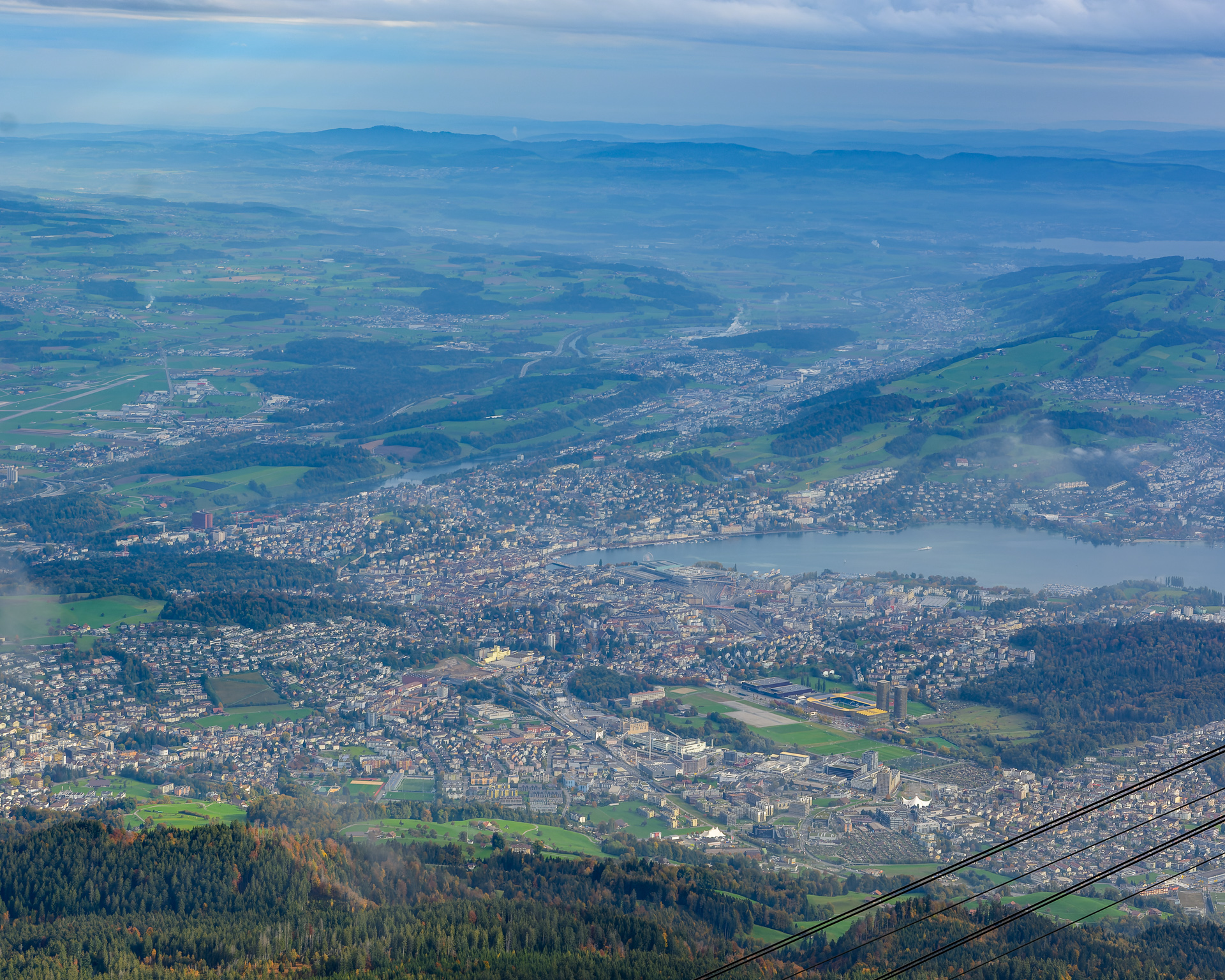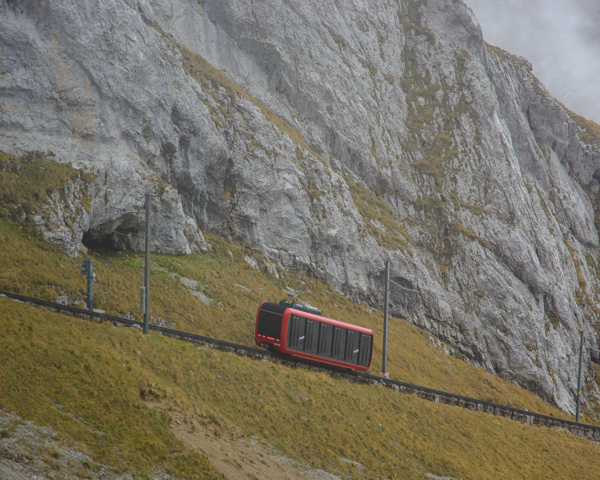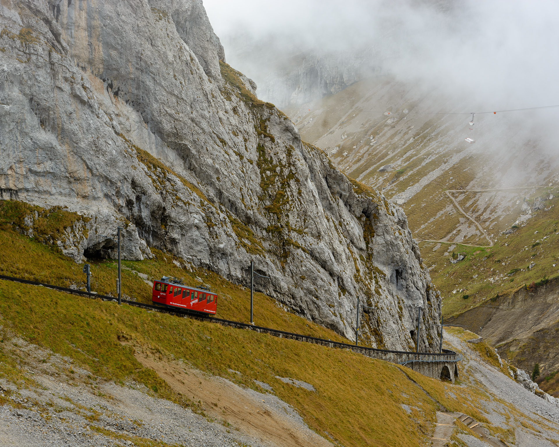 Damit beenden wir unseren Besuch und wollen wieder mit der Zahnradbahn nach Alpnachstad fahren. Es ist gerade wieder eine Lücke im Fahrplan und wir sitzen etwa 30 Minuten auf einer Bank in der Station ohne Sicht nach draußen. Und als es dann los geht und der Triebwagen ins Freie kommt, wundern wir uns: Die Wolken sind weg, wir haben wieder freie Aussicht.