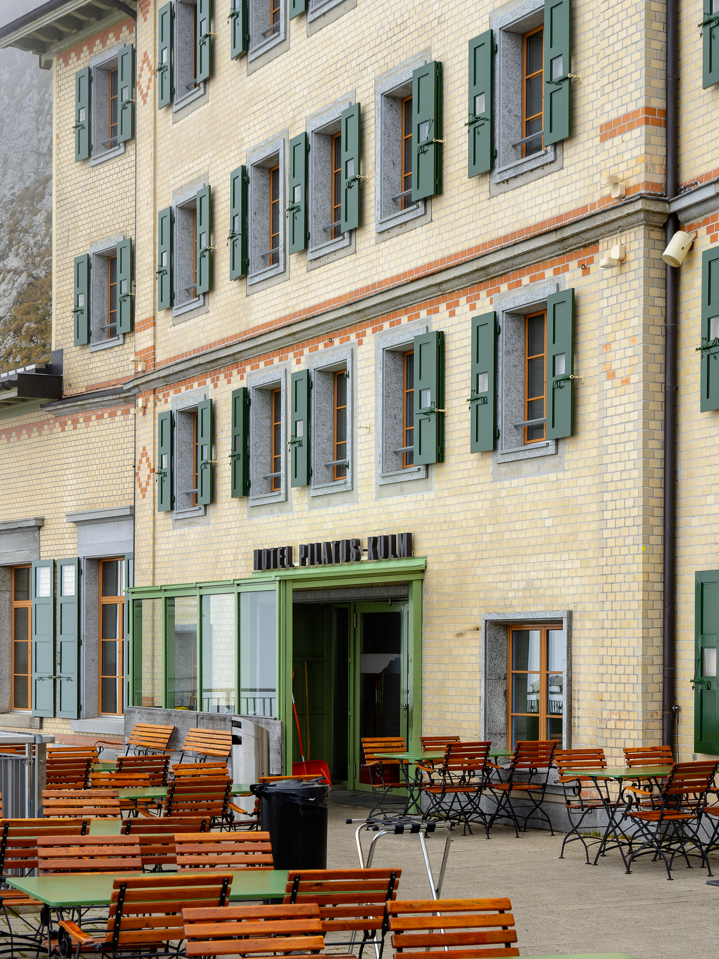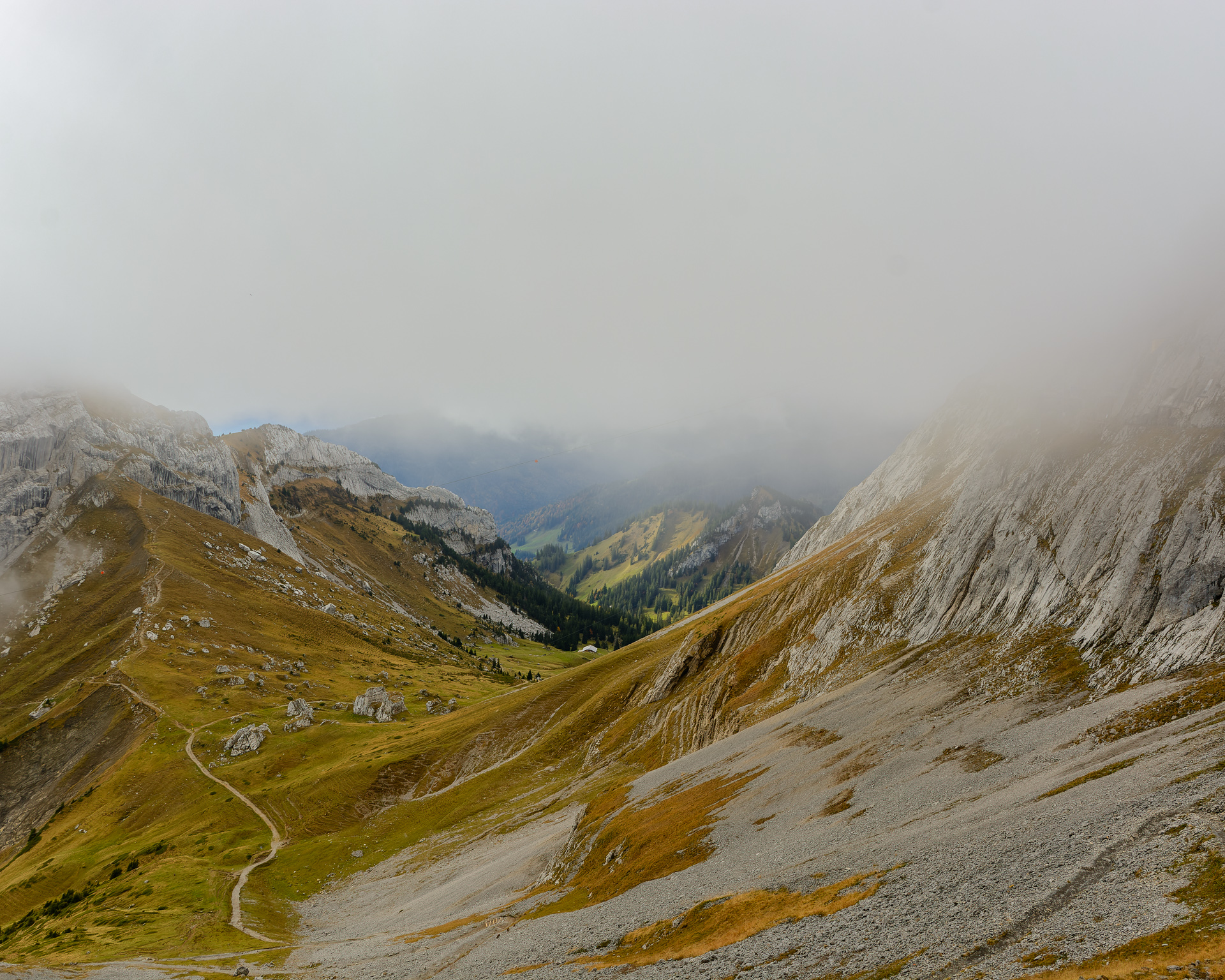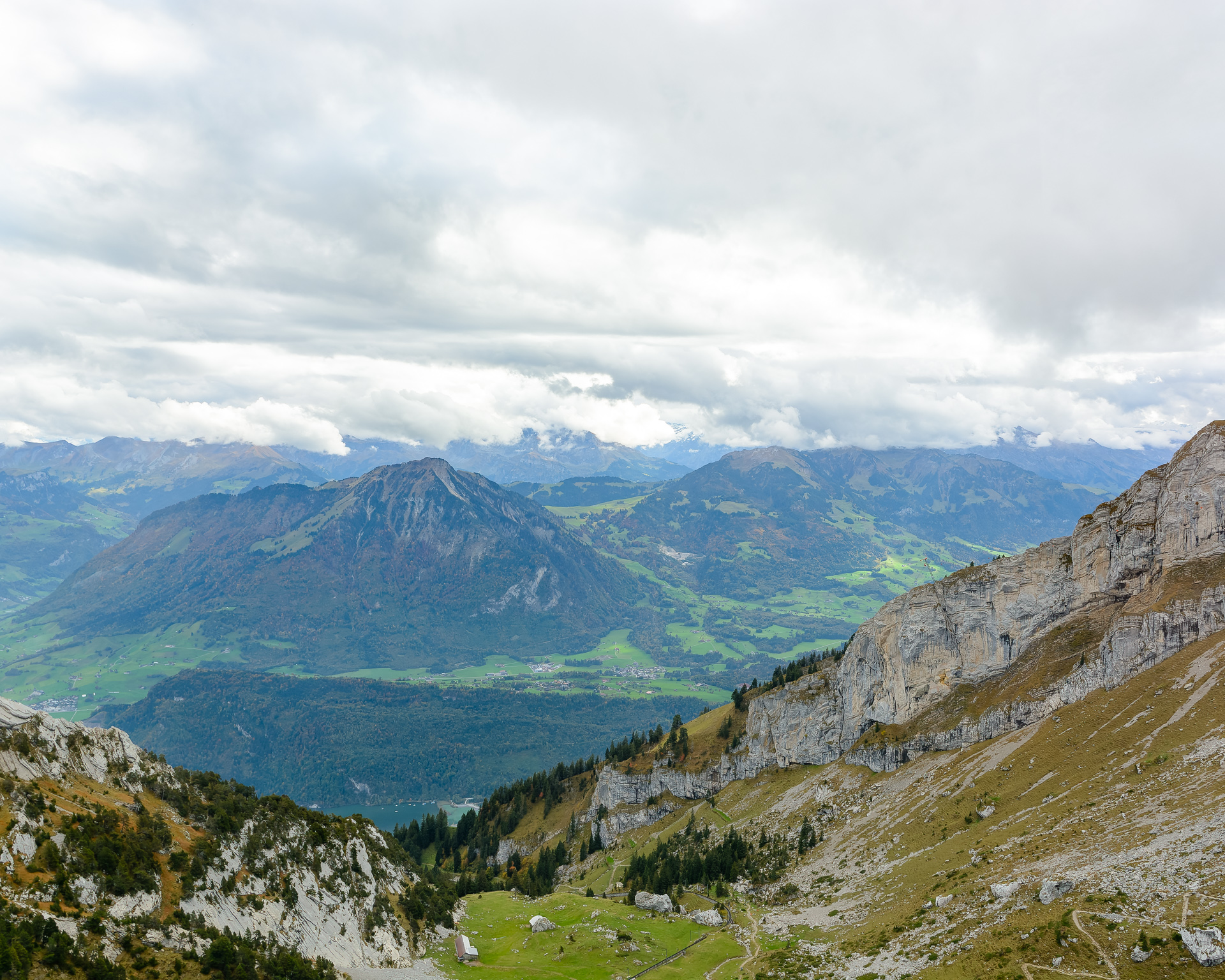 Damit beenden wir unseren Besuch und wollen wieder mit der Zahnradbahn nach Alpnachstad fahren. Es ist gerade wieder eine Lücke im Fahrplan und wir sitzen etwa 30 Minuten auf einer Bank in der Station ohne Sicht nach draußen. Und als es dann los geht und der Triebwagen ins Freie kommt, wundern wir uns: Die Wolken sind weg, wir haben wieder freie Aussicht.