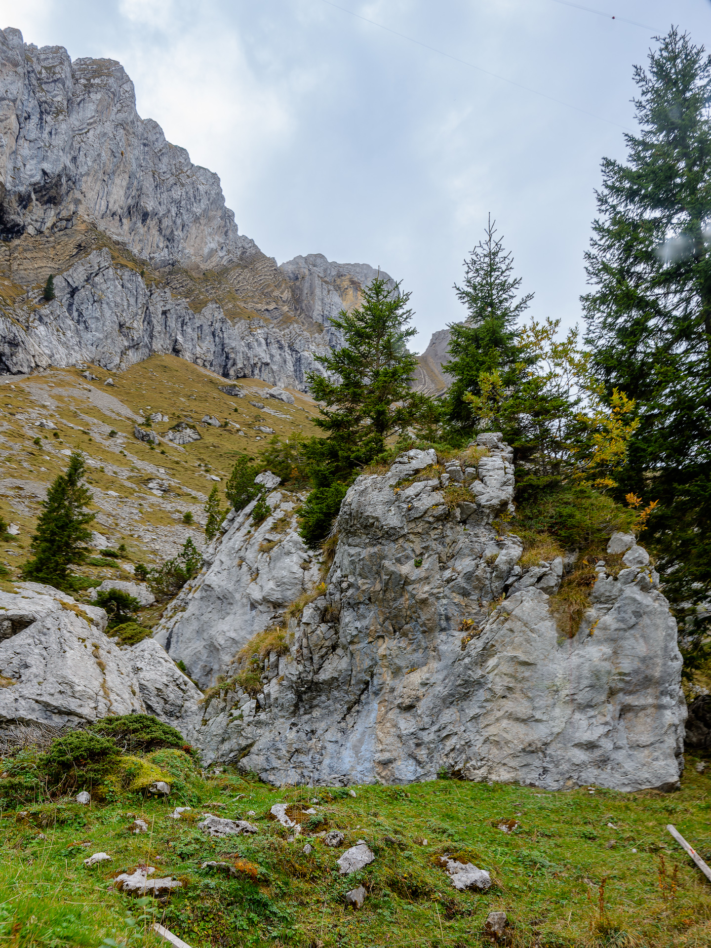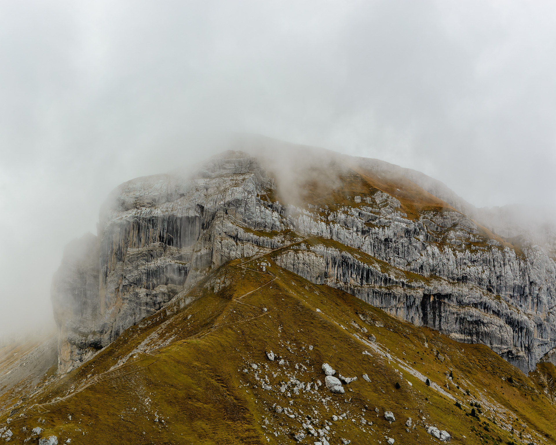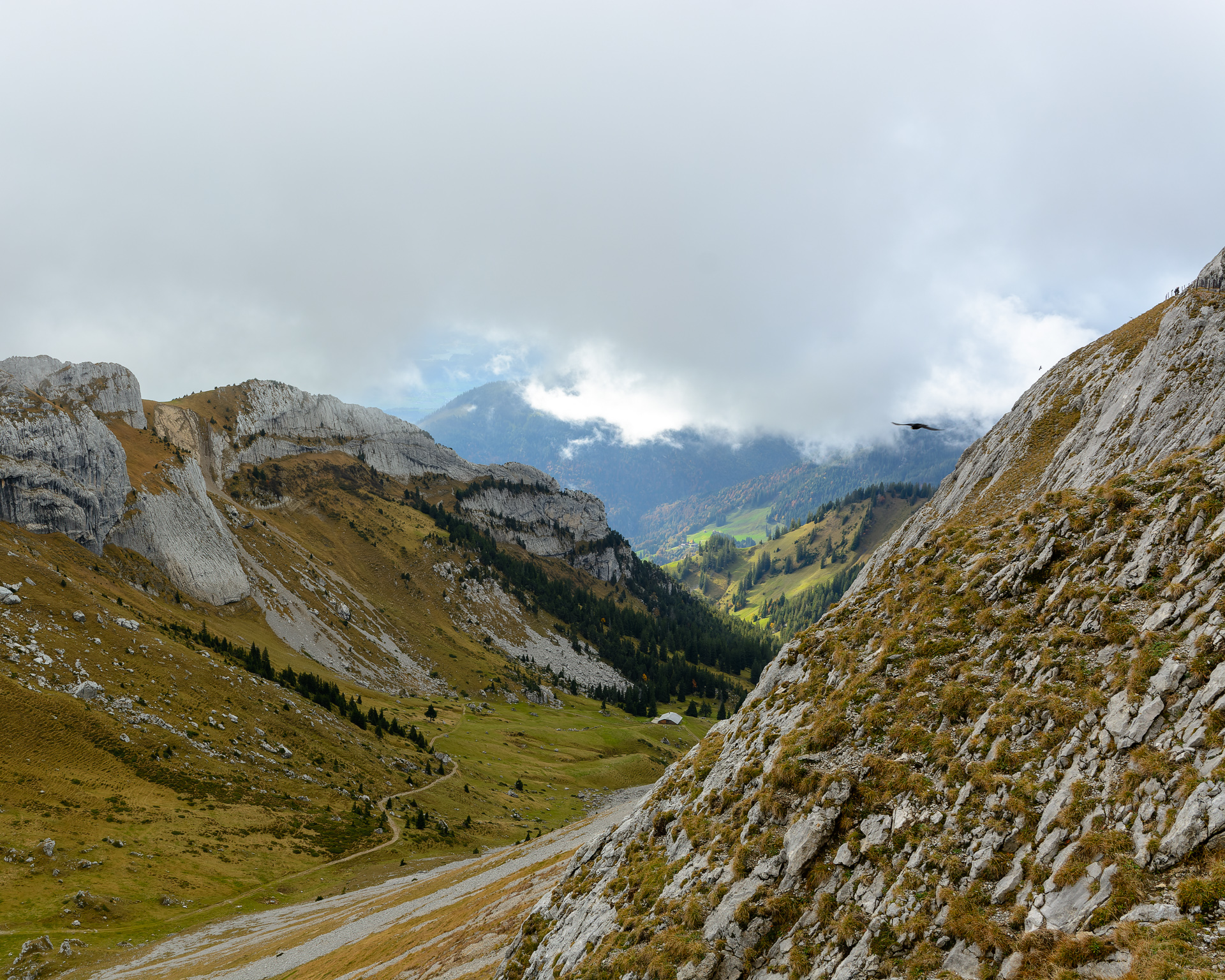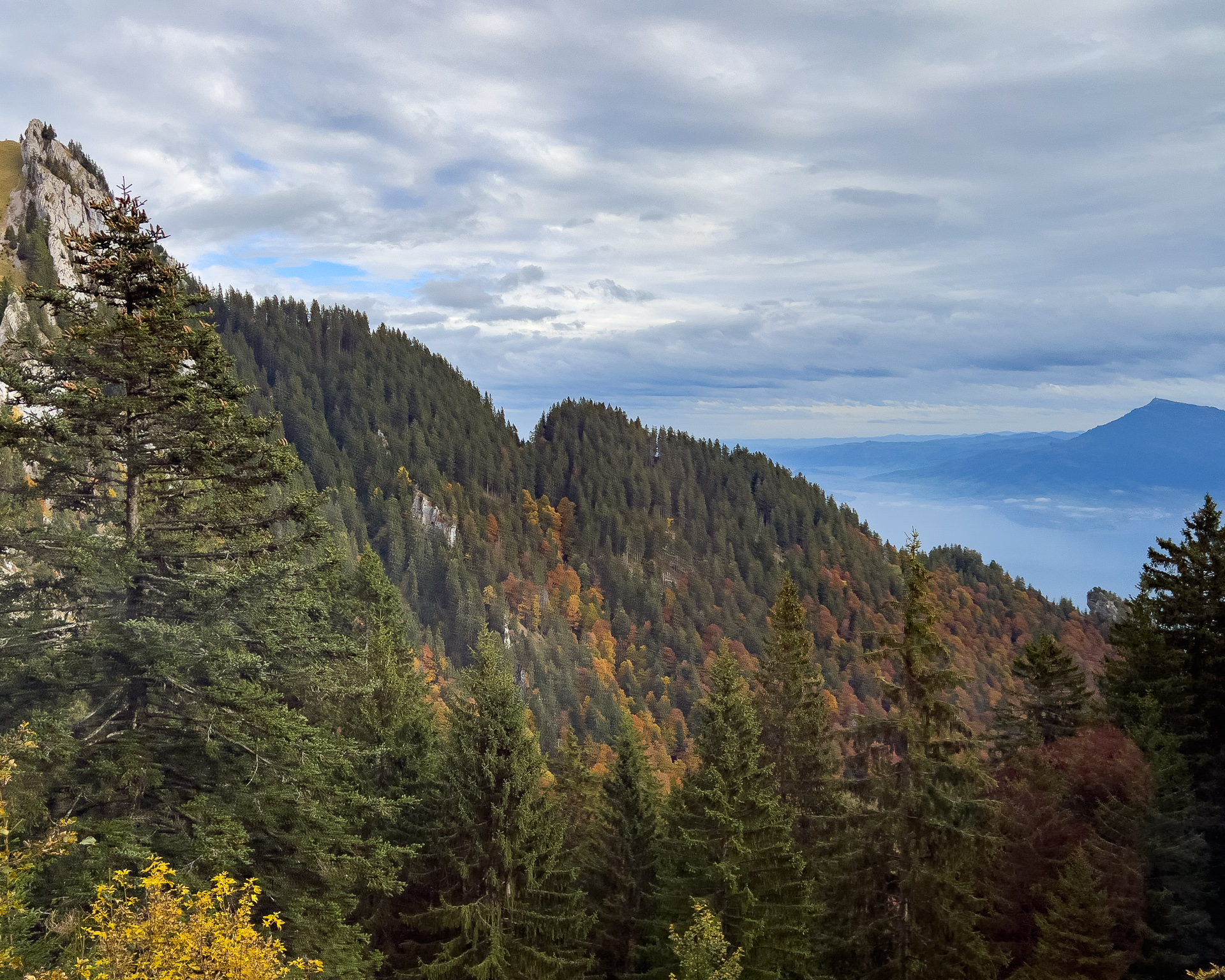 Auf dem Rückweg biegen wir ab und gehen entlang des in den Felsen gehauenen Drachenweges. Dabei gibt es dann und wann einen Blick durch die Wolken aufs Voralpenland