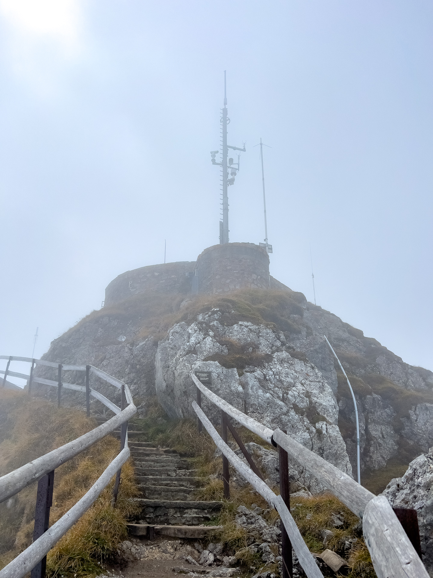 Oben angekommen, machen wir uns zügig auf zur Aussichtsterrasse, und das ist auch gut so. Innerhalb weniger Minuten verschwindet der Sonnenschein und der Fernblick und wir befinden uns innerhalb der Wolken.