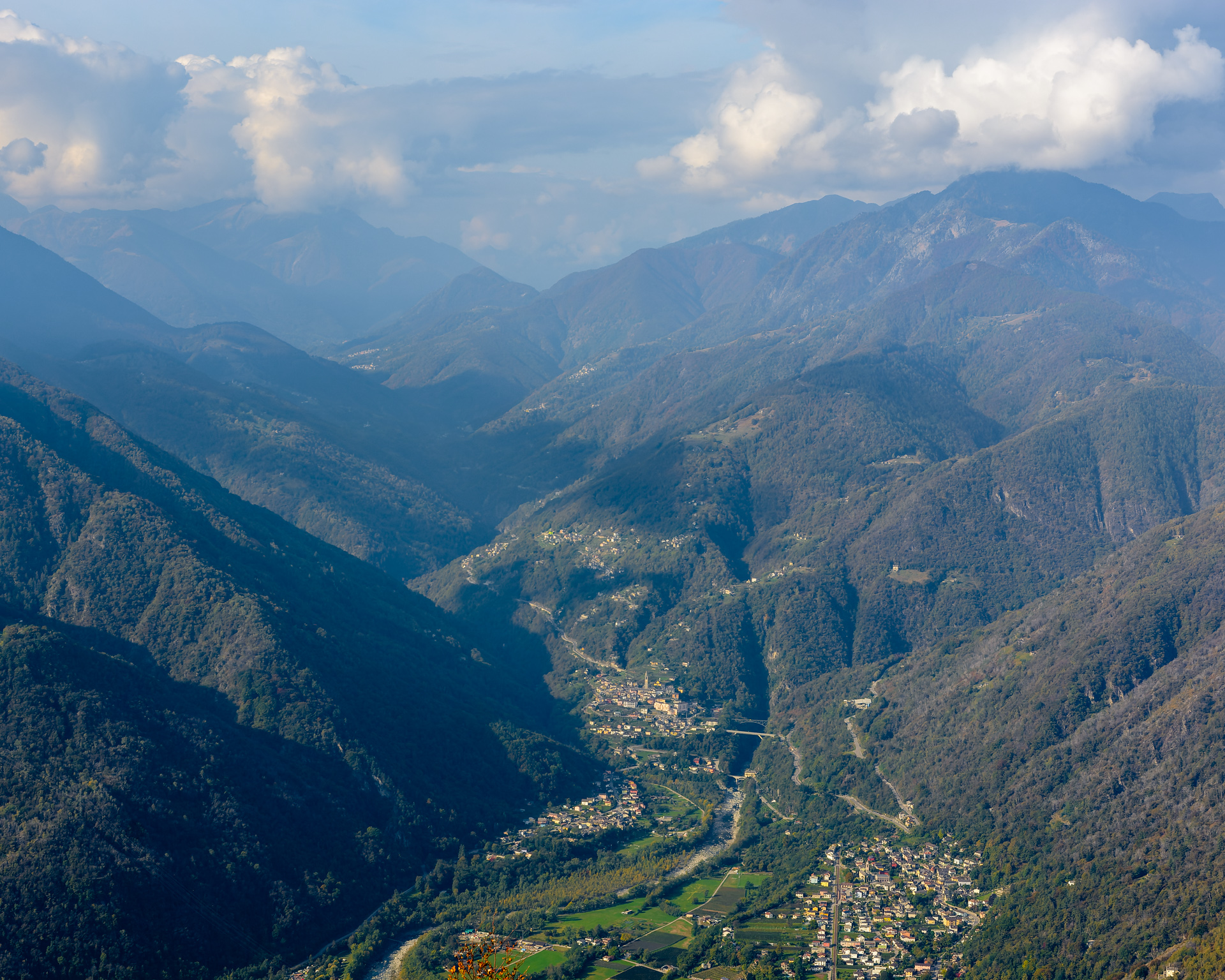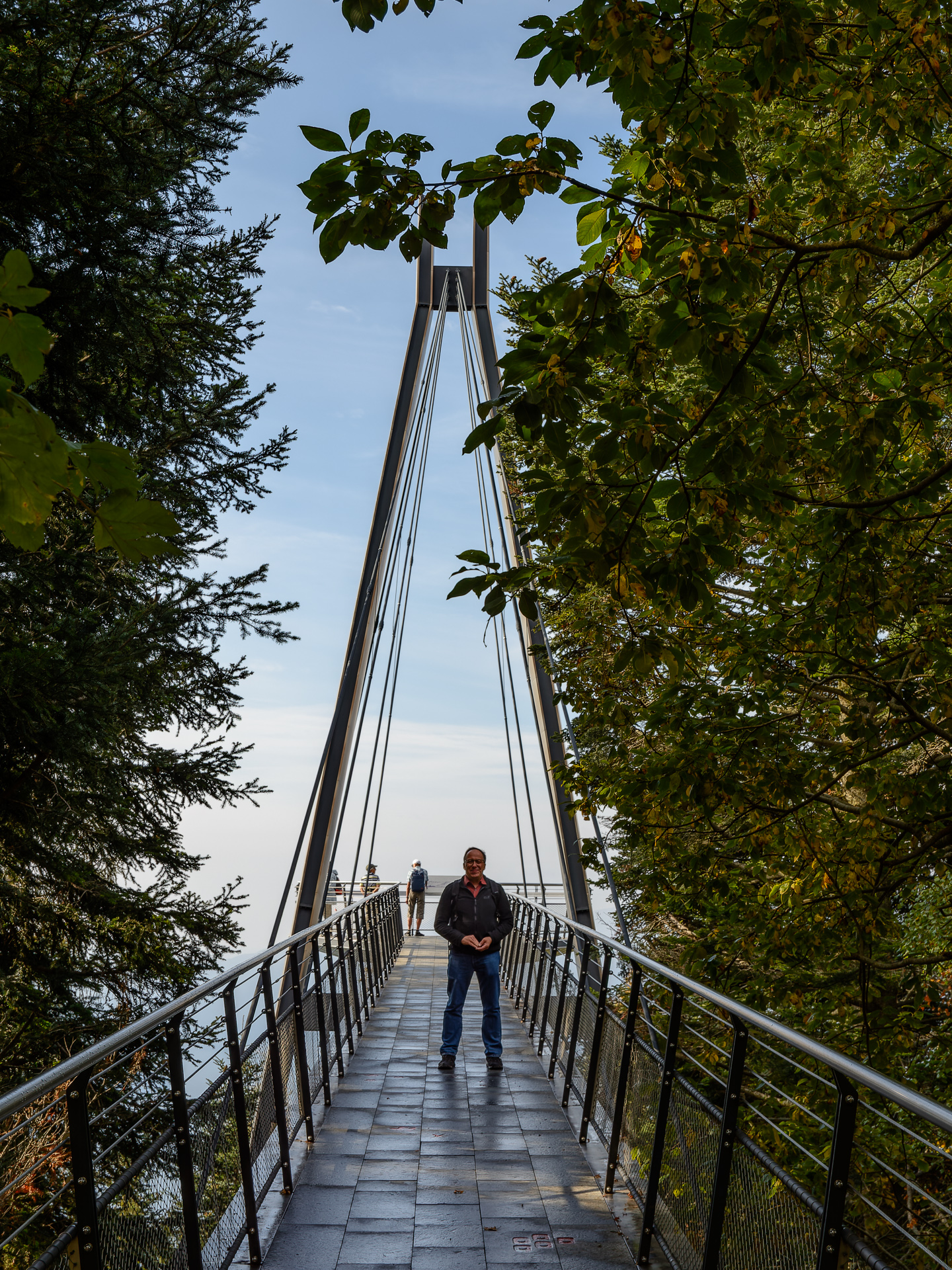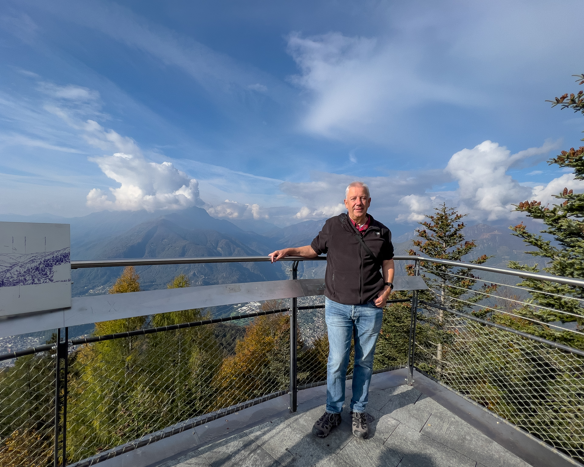 In Cardada angekommen laufen wir zunächst die paar Meter zur „Panorama-Passerelle“, wie man eine über den Berghang heraushängende Aussichtsplattform nennt. Die Aussicht ist im Prinzip grandios, wird aber durch das Gegenlicht und den starken Dunst, der uns auch in den nächsten Tagen ärgert, etwas behindert.
