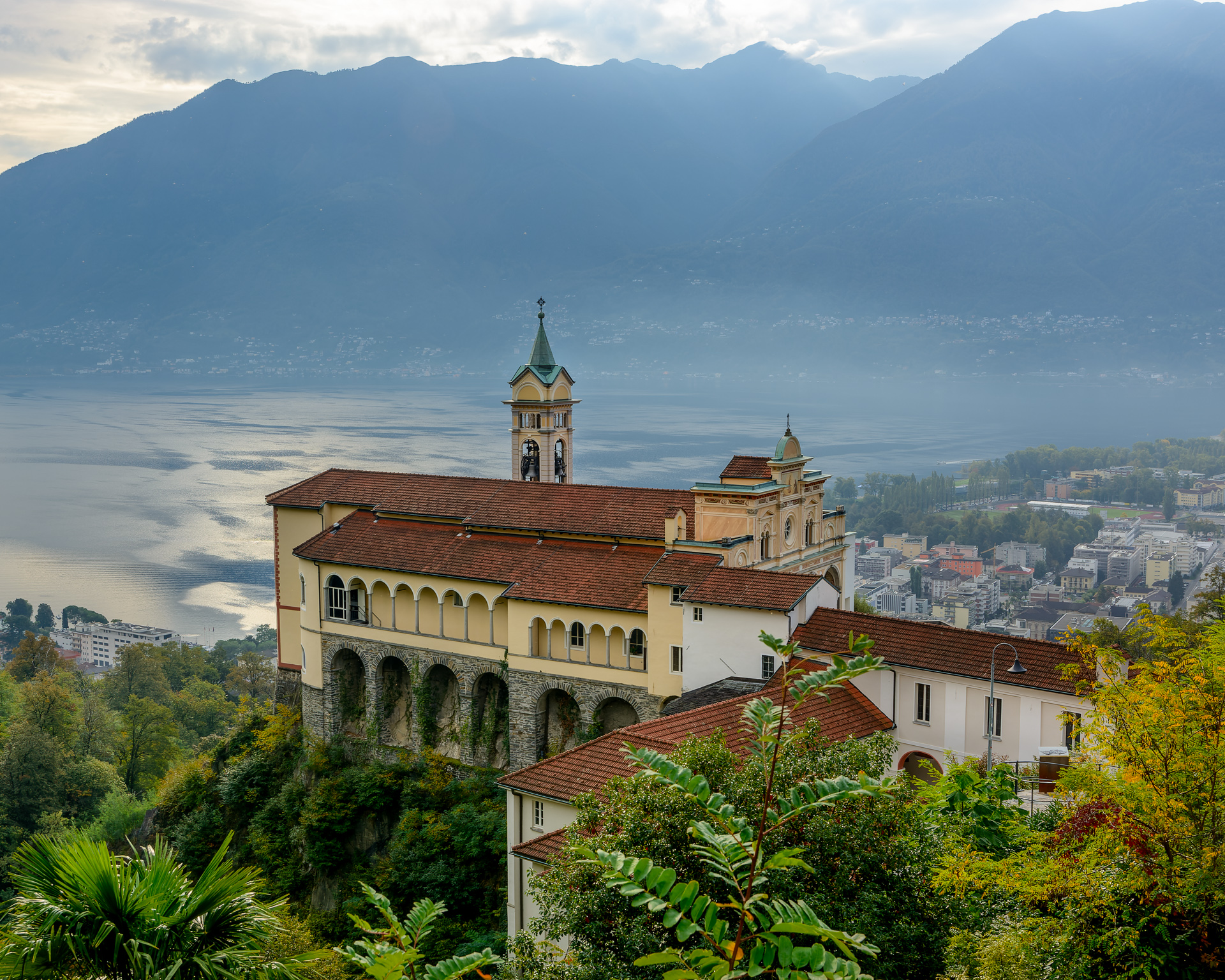 oben in Orselina angekommen werfen wir einen ersten Blick auf die malerisch auf einem Felsen über dem See gelegene Kirche, entschließen uns aber, erst nach Cardada weiter zu fahren und die Kirche auf dem Rückweg zu besichtigen.