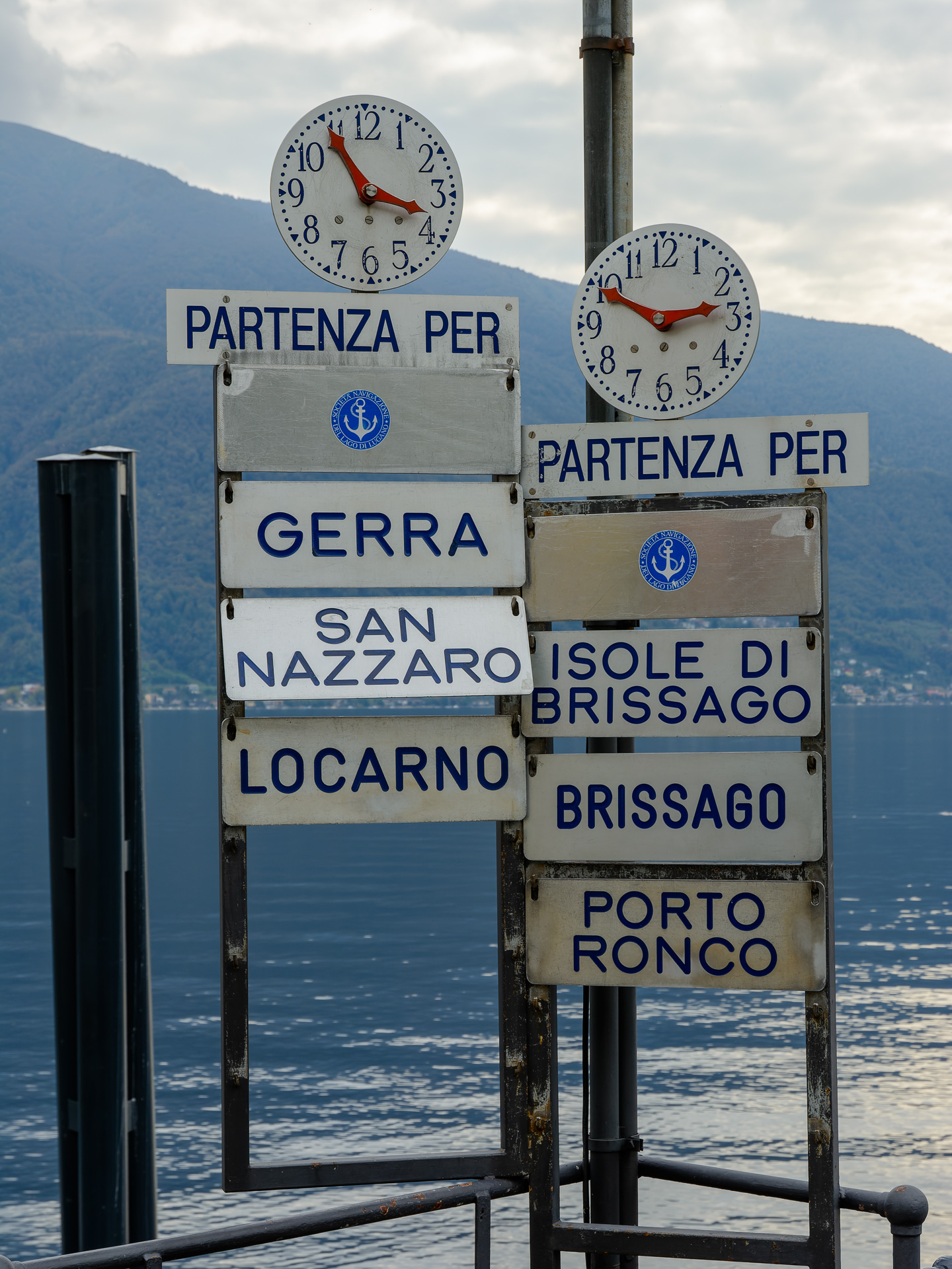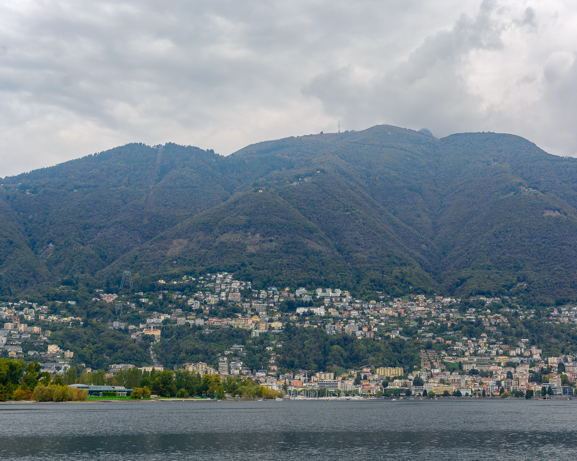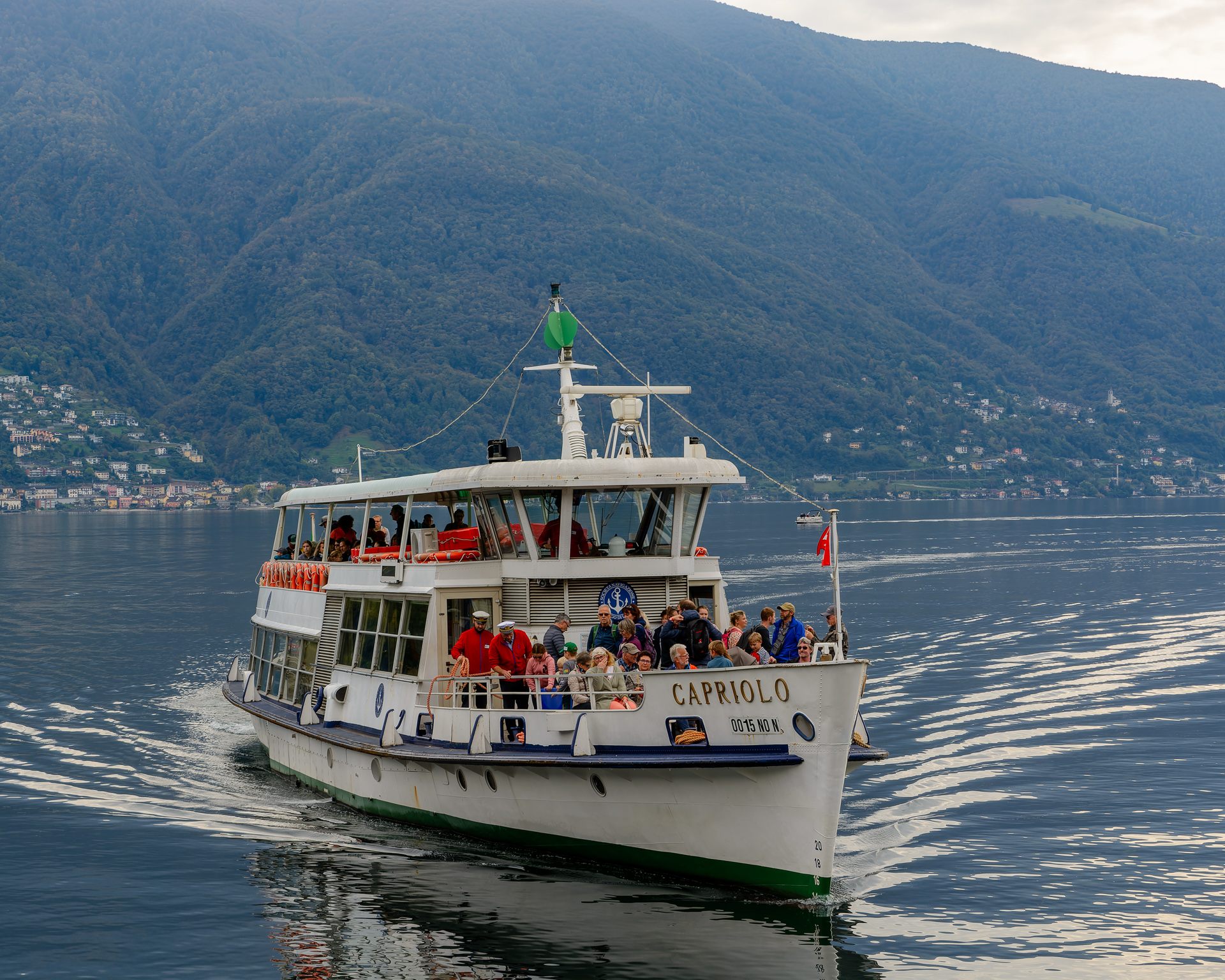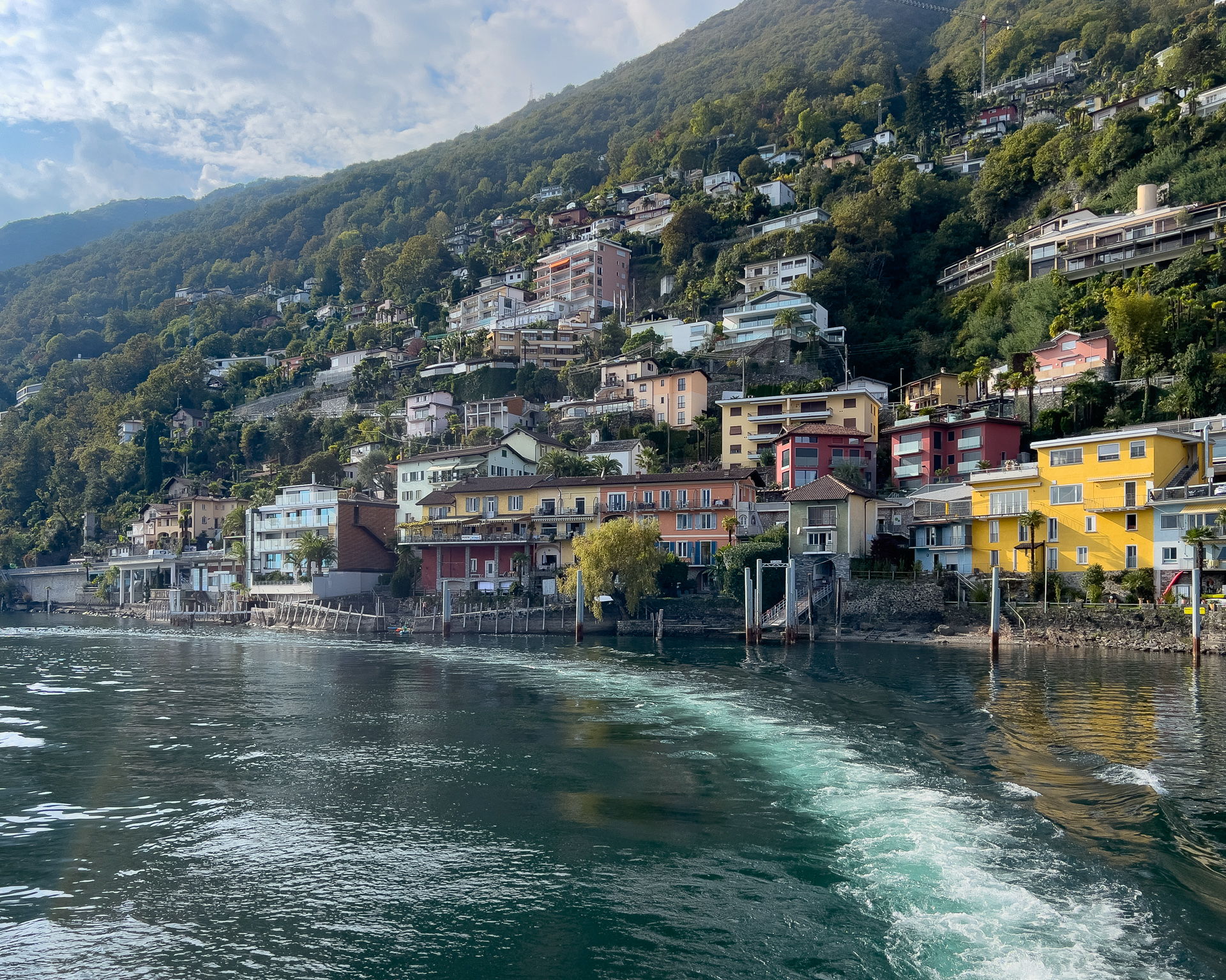 Eigentlich wäre ja eine Kaffeepause angesagt, aber hier oben will Stephan nicht. Mit der Standseilbahn geht es runter nach Locarno und wir laufen dann zur Schiffsstation, denn es ist noch früh am Nachmittag und eine Rundfahrt bis Brissago sollte noch möglich sein. Es ist allerdings blöd, das das nächste Schiff recht bald abfährt, für Kaffee und Imbiss an Land bleibt jetzt keine Zeit mehr. Und der Schiffsfahrplan macht auch Probleme. Der Kurs geht nämlich nicht direkt durch nach Brissago. Die „Isole de Brissago“ im See mit ihrem Botanischem Garten sind wohl die größte Attraktion dort und deswegen dreht das Schiff eine Ehrenrunde. Erst geht es über Ascona zu den Inseln, dann wieder zurück nach Ascona, und dann weiter nach Brissago, selbstverständlich mit einem weiteren Stop an den Inseln. Die Ehrenrunde dürfen wir mit unserer einfachen Rückfahrkarte nicht mitmachen, wir unterbrechen daher in Ascona für eine knappe Stunde die Fahrt.