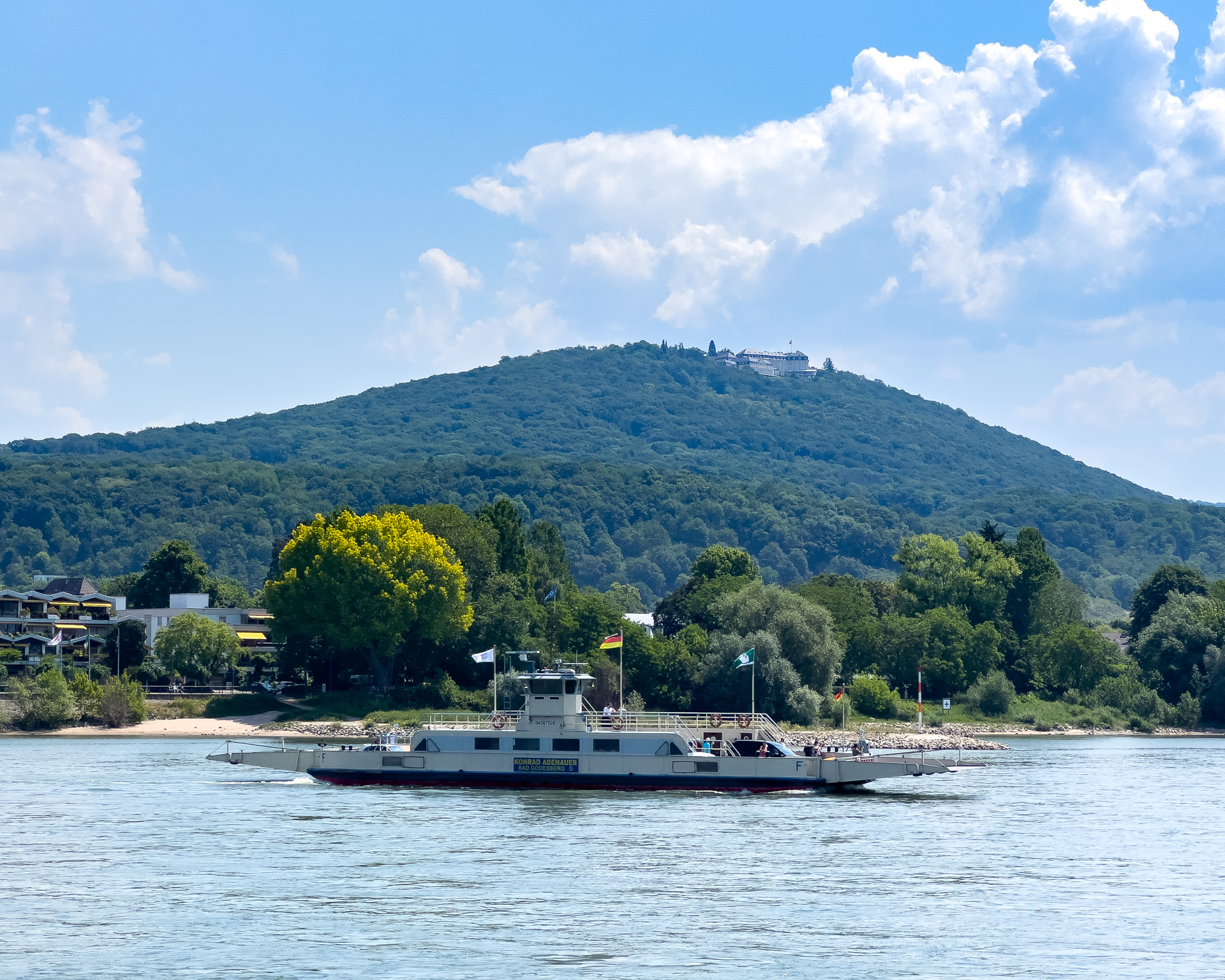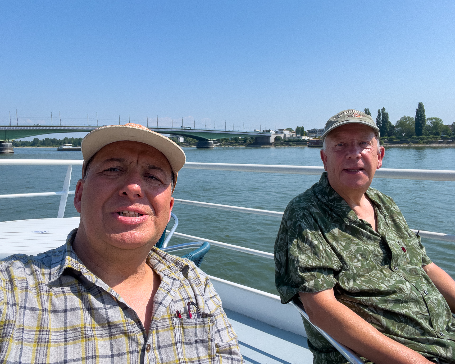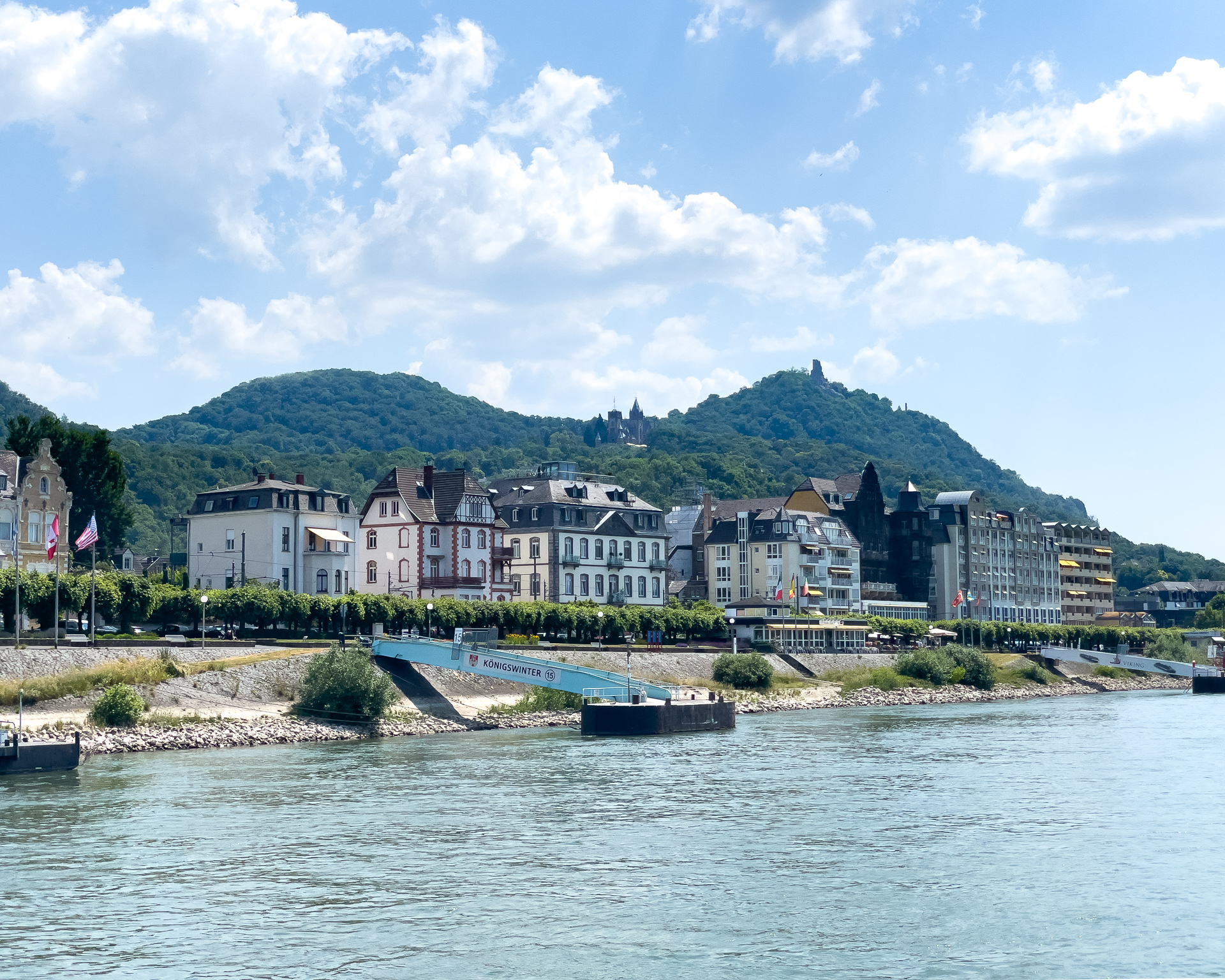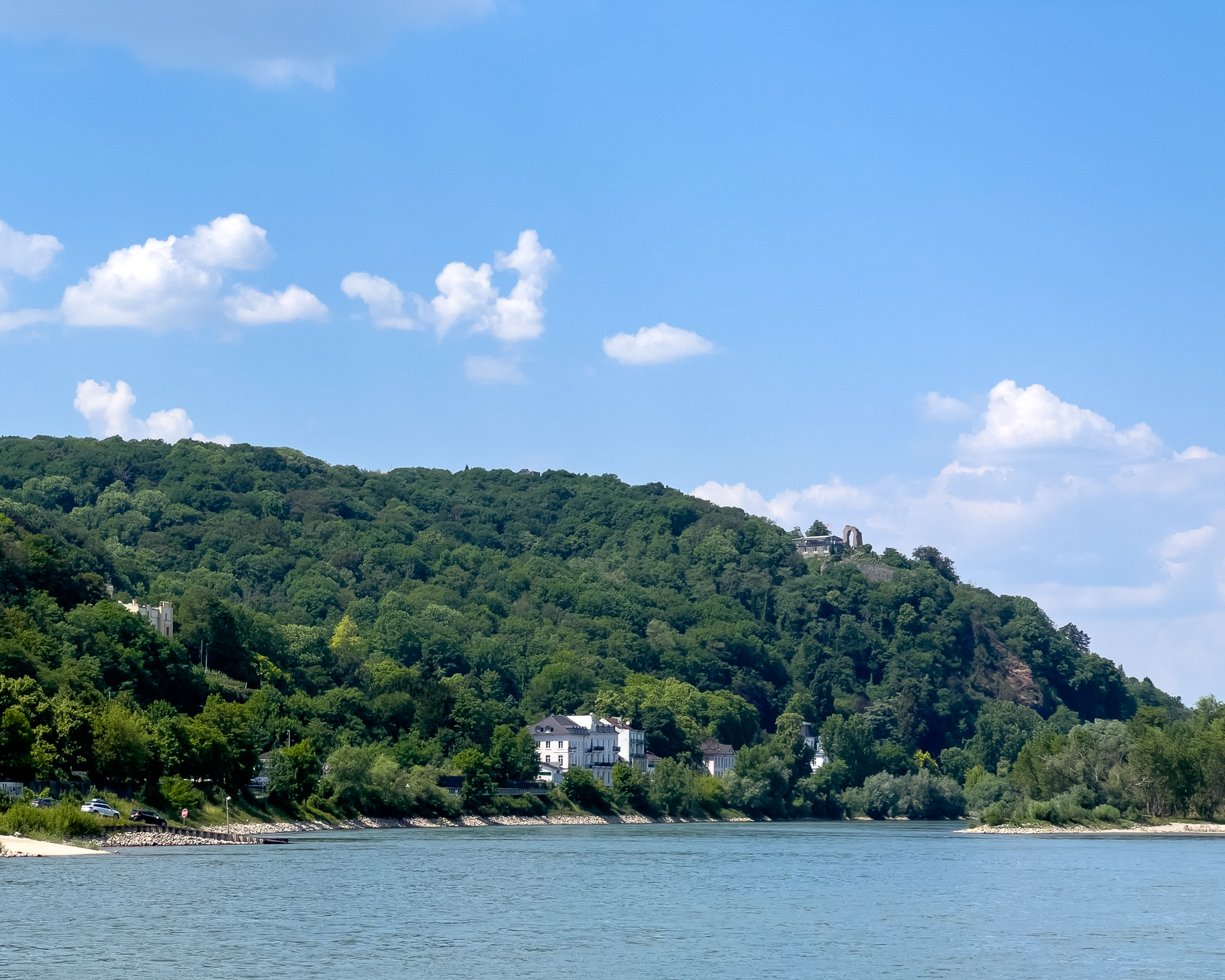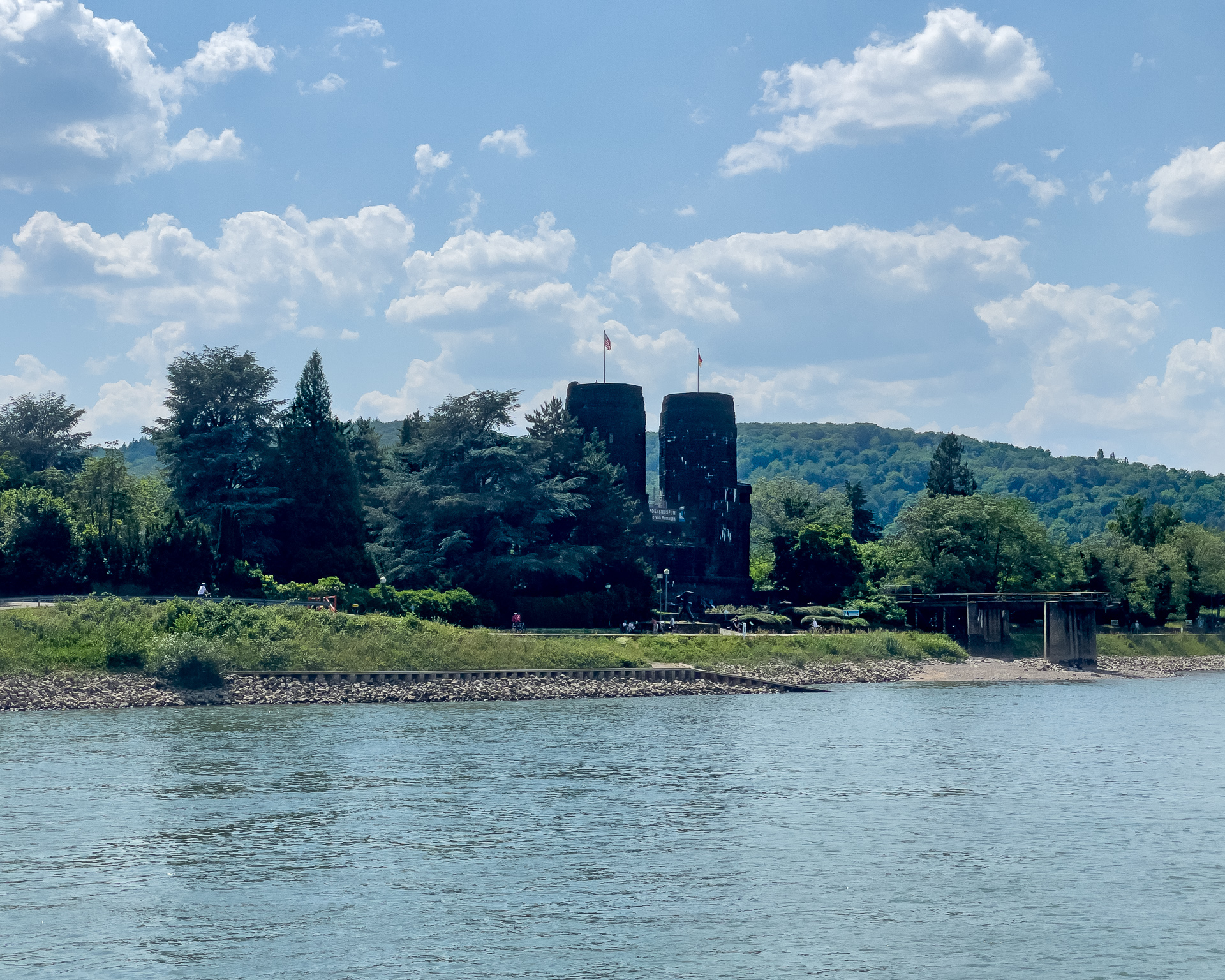 Da sind wir auf dem Schiff und warten schwitzend auf die AbfahrzeitBeuel mit der St. Josefs KircheDa geht es hin: Der Blick stromaufwärts mit der Silhouette des Siebengebirges im (immer noch) Morgendunst sowie Post Tower und „Langer Eugen“ rechts.Eine Brücke unterqueren wir. Die Konrad-Adenauer-Brücke führt in Höhe des Rheinaue Parks über den RheinSo sieht hier das typische Rheinufer ausIn tauchen die Hügel des Siebengebirges auf, als erster der 335,9 Meter hohe Petersberg. Für die Überquerung des Rheins sind jetzt Fähren zuständig.Als nächstes bei Königswinter der Drachenfels, 321 Meter hochNoch ein Foto vom Drachenfels, ein paar Kilometer weiter Richtung Rhöndorf aufgenommen.An einer zweiten Brücke kommen wir vorbei. Es ist die berühmte Brücke von Remagen (Ludendorff-Brücke), von der allerdings nur noch die Türme an den beiden Seiten existieren. Hier die Türme auf der Erpeler SeiteEndstation ist in Linz. Wir bleiben sitzen und fahren gleich wieder zurück.Und damit sind wir wieder an der Brücke von Remagen, diesmal auf der Remagener Seite. In den Türmen hier ist das Friedensmuseum untergebrachtEs folgt Rolandseck mit dem imposanten Bahnhofsgebäude. Darin und in dem darüber sichtbaren Neubau des Architekten Richard Meier befindet sich das Arp-MuseumKurz danach im Remagener Ortsteil Rolandswerth der Rolandsbogen, Letzter Überrest der Burg RolandseckEs geht an der Insel Nonnenwerth vorbeiZurück in Bonn auf dem Weg zum Parkplatz noch ein Abschiedsfoto von der Brücke mit dem Schiff am Anleger