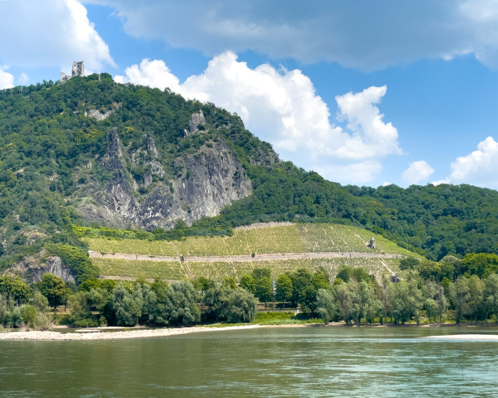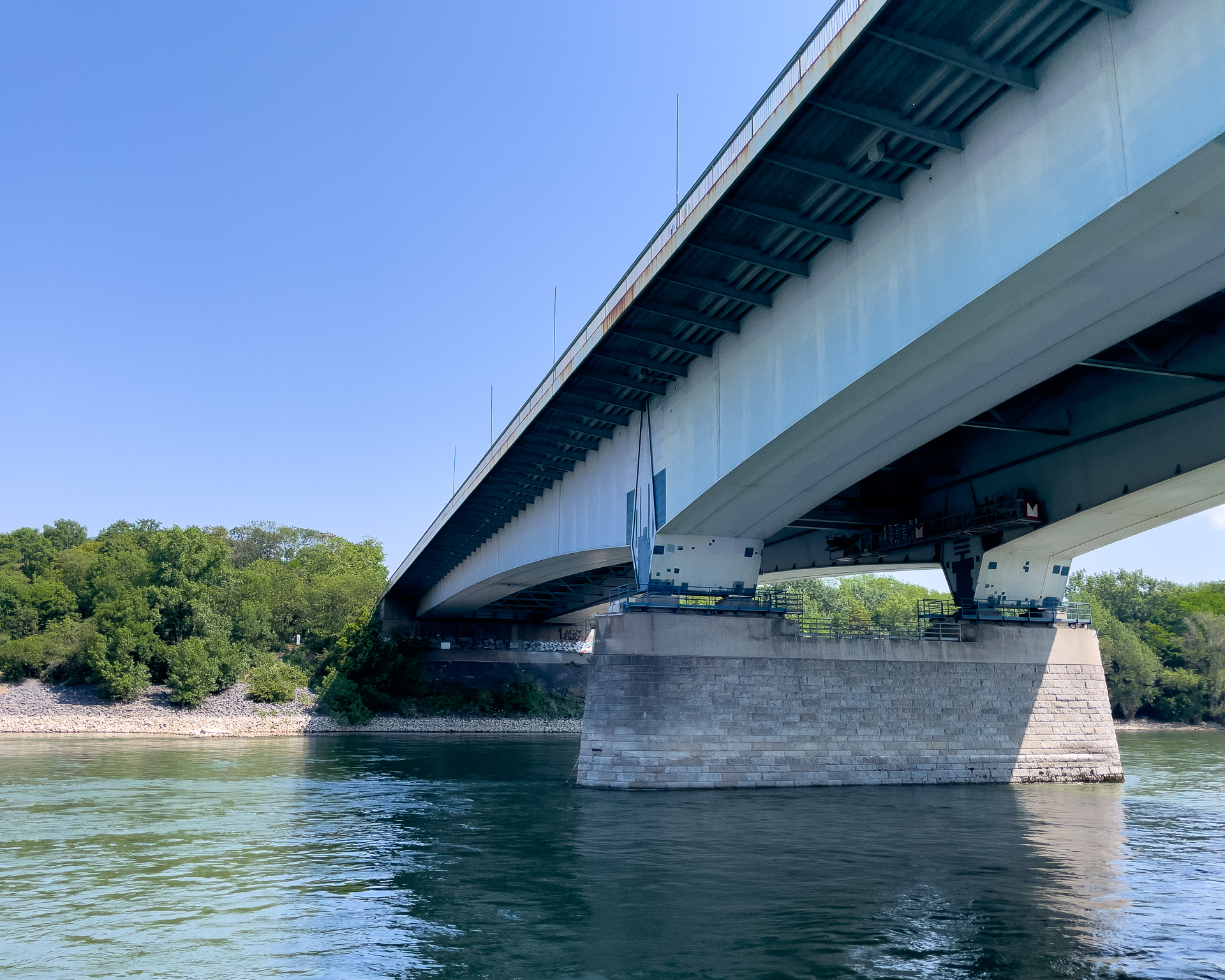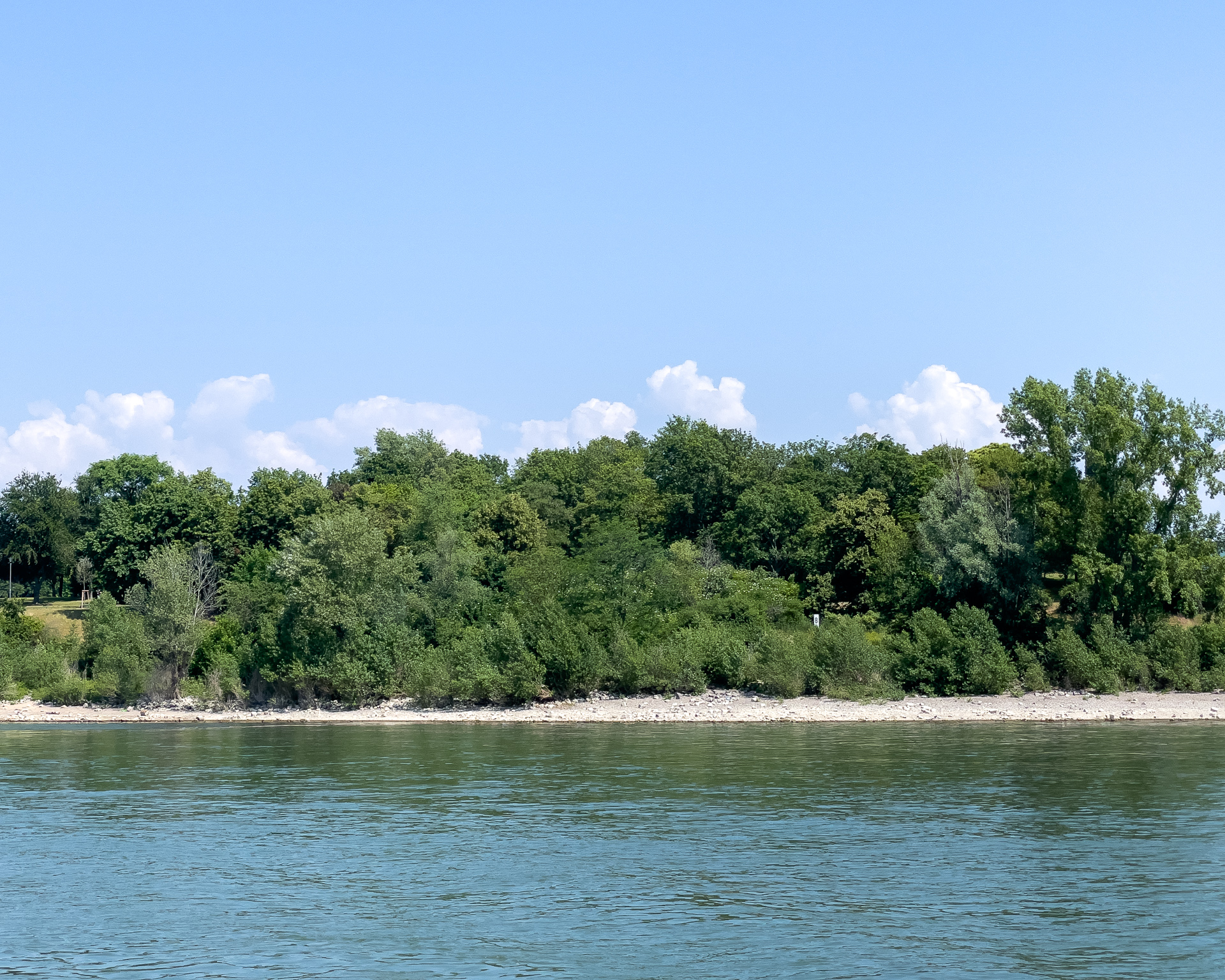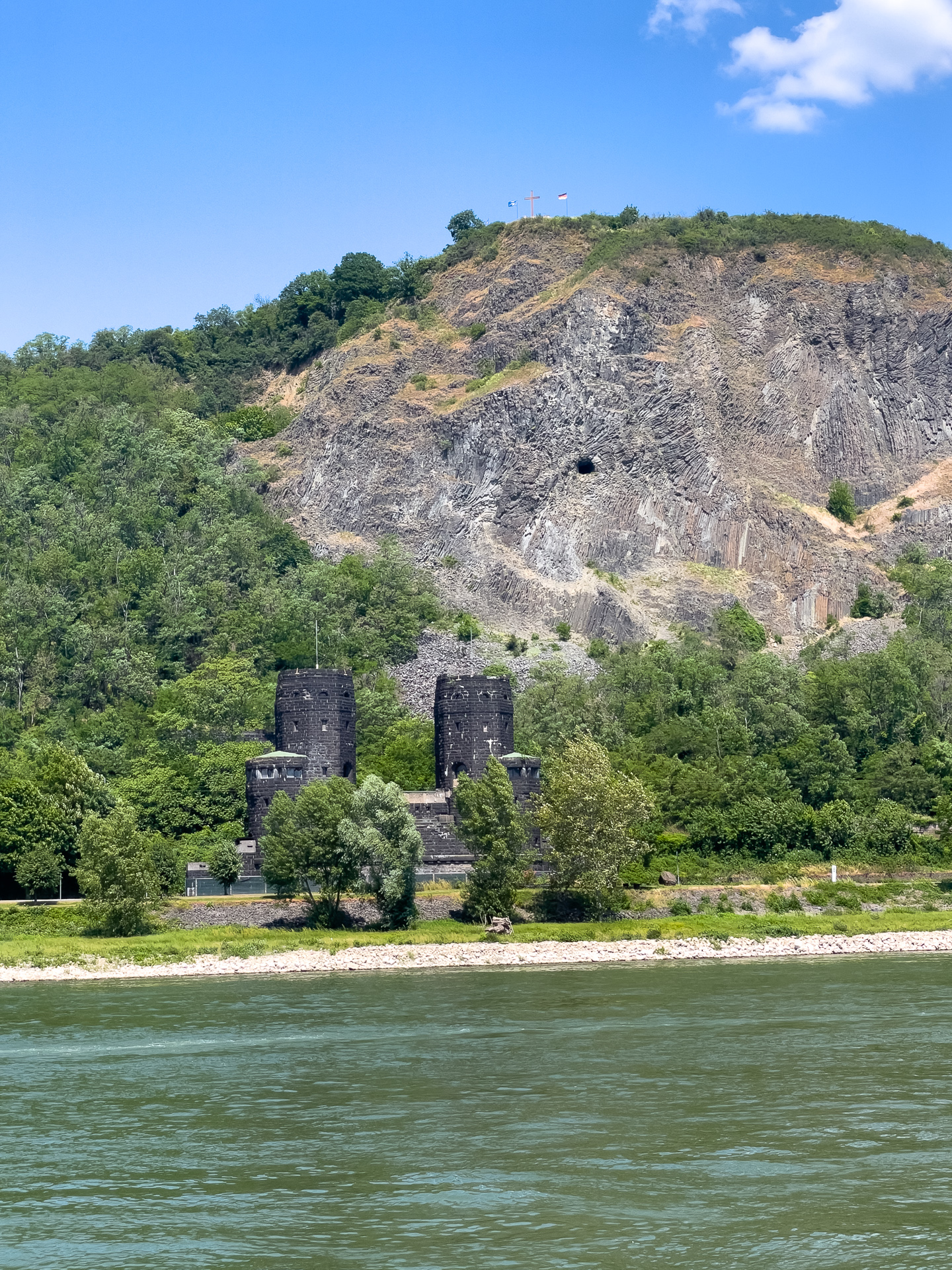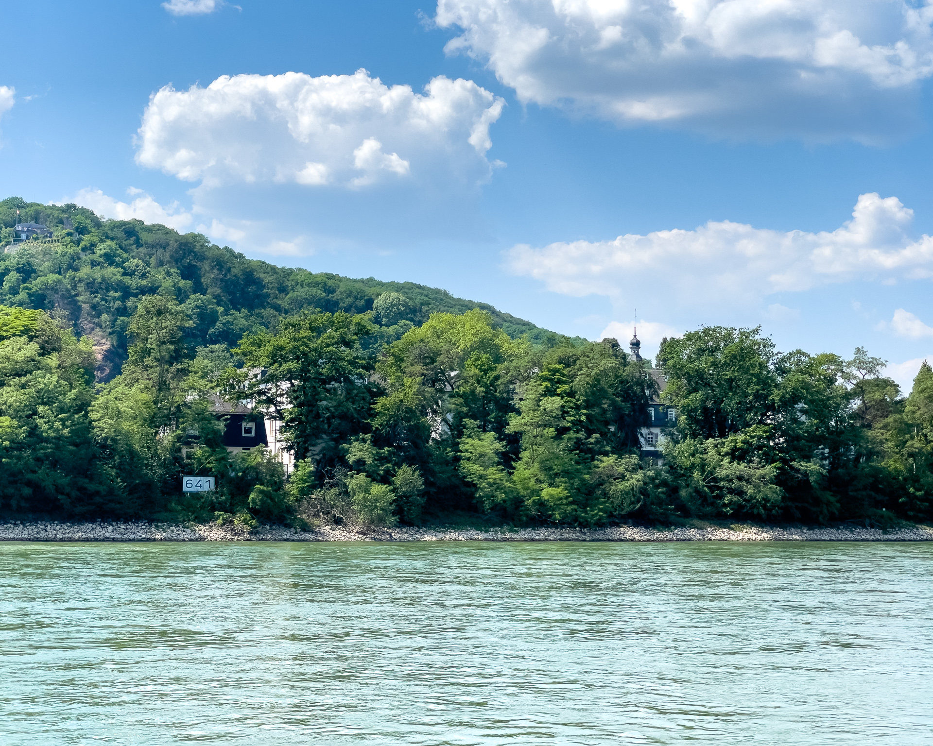 Da sind wir auf dem Schiff und warten schwitzend auf die AbfahrzeitBeuel mit der St. Josefs KircheDa geht es hin: Der Blick stromaufwärts mit der Silhouette des Siebengebirges im (immer noch) Morgendunst sowie Post Tower und „Langer Eugen“ rechts.Eine Brücke unterqueren wir. Die Konrad-Adenauer-Brücke führt in Höhe des Rheinaue Parks über den RheinSo sieht hier das typische Rheinufer ausIn tauchen die Hügel des Siebengebirges auf, als erster der 335,9 Meter hohe Petersberg. Für die Überquerung des Rheins sind jetzt Fähren zuständig.Als nächstes bei Königswinter der Drachenfels, 321 Meter hochNoch ein Foto vom Drachenfels, ein paar Kilometer weiter Richtung Rhöndorf aufgenommen.An einer zweiten Brücke kommen wir vorbei. Es ist die berühmte Brücke von Remagen (Ludendorff-Brücke), von der allerdings nur noch die Türme an den beiden Seiten existieren. Hier die Türme auf der Erpeler SeiteEndstation ist in Linz. Wir bleiben sitzen und fahren gleich wieder zurück.Und damit sind wir wieder an der Brücke von Remagen, diesmal auf der Remagener Seite. In den Türmen hier ist das Friedensmuseum untergebrachtEs folgt Rolandseck mit dem imposanten Bahnhofsgebäude. Darin und in dem darüber sichtbaren Neubau des Architekten Richard Meier befindet sich das Arp-MuseumKurz danach im Remagener Ortsteil Rolandswerth der Rolandsbogen, Letzter Überrest der Burg RolandseckEs geht an der Insel Nonnenwerth vorbeiZurück in Bonn auf dem Weg zum Parkplatz noch ein Abschiedsfoto von der Brücke mit dem Schiff am Anleger