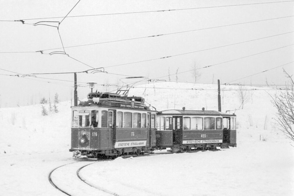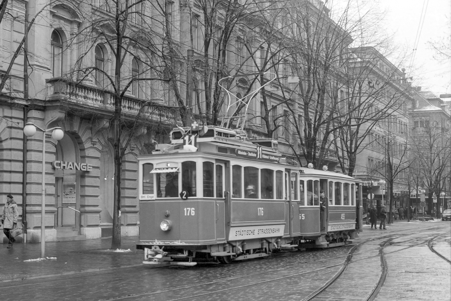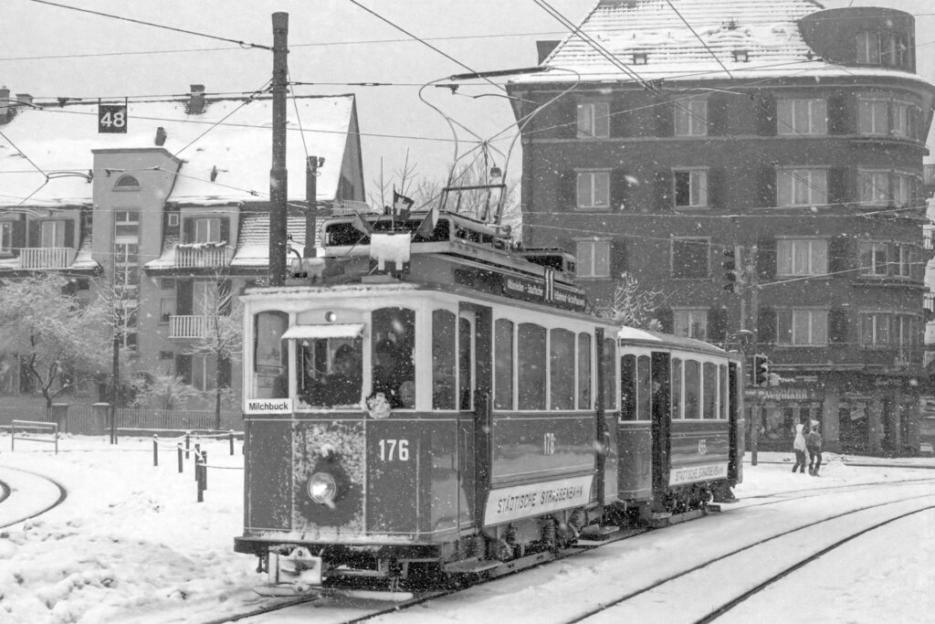 Zwischendurch ist wieder Zeit für ein Foto des Planbetriebs: Ein stadteinwärtiger Zug der Linie 10 verlässt gerade die Haltestelle Milchbuck und biegt auf die Irchelstraße einAls nächsten historische Zug habe ich dann Tw 176 mit Bw 455 festgehalten, hier aus der Stadt kommend vor der Haltestelle MilchbuckDer Zug wird natürlich in der Schleife fotografiertUnd nochmalZrück am Bahnhof Enge ist das Schneegestöber zum Glück (fast) zu Ende. Ein Zug der Linie 5 fährt in die Haltestelle einUnd da kommt der nächste historische Zug, Tw 2 mit Bw 626