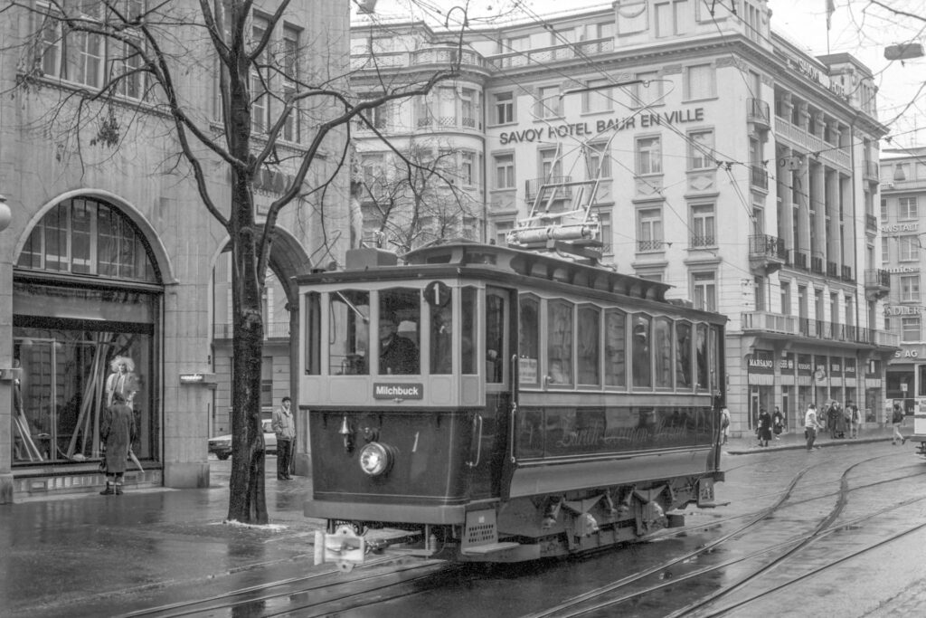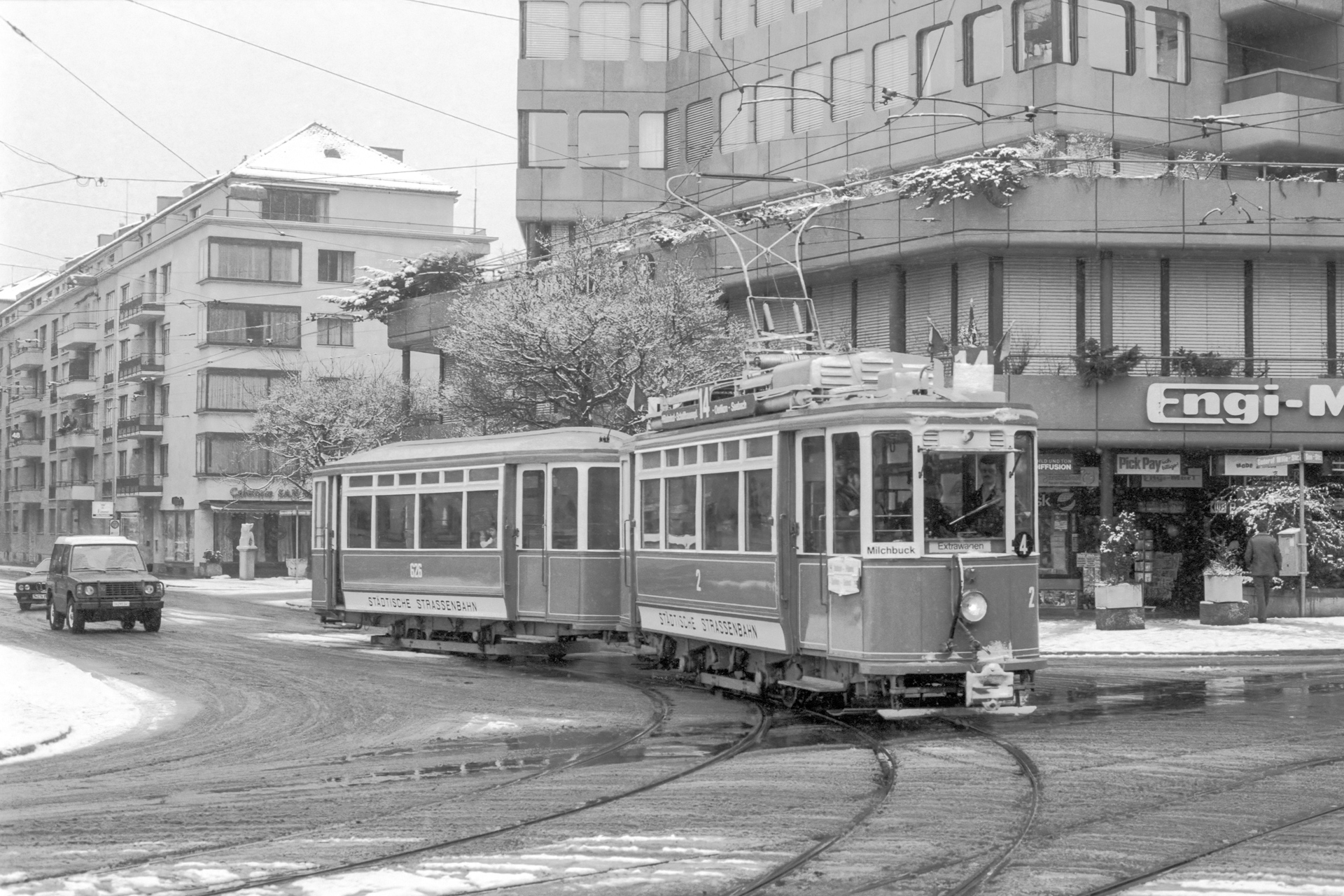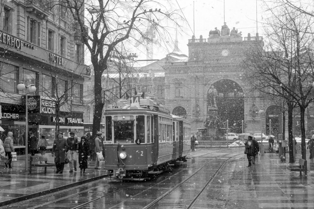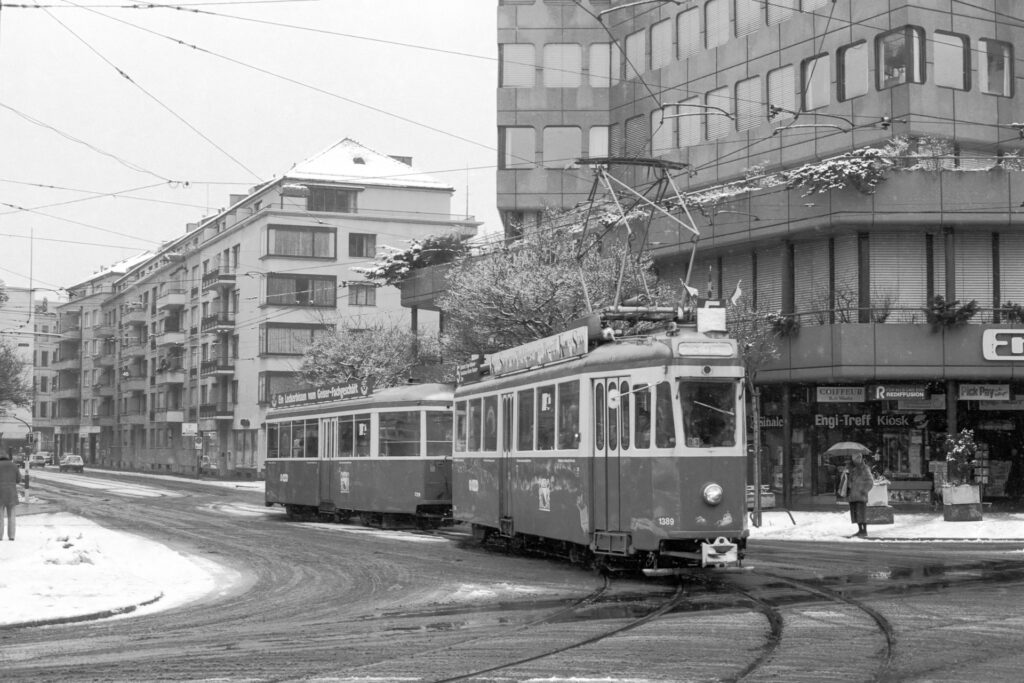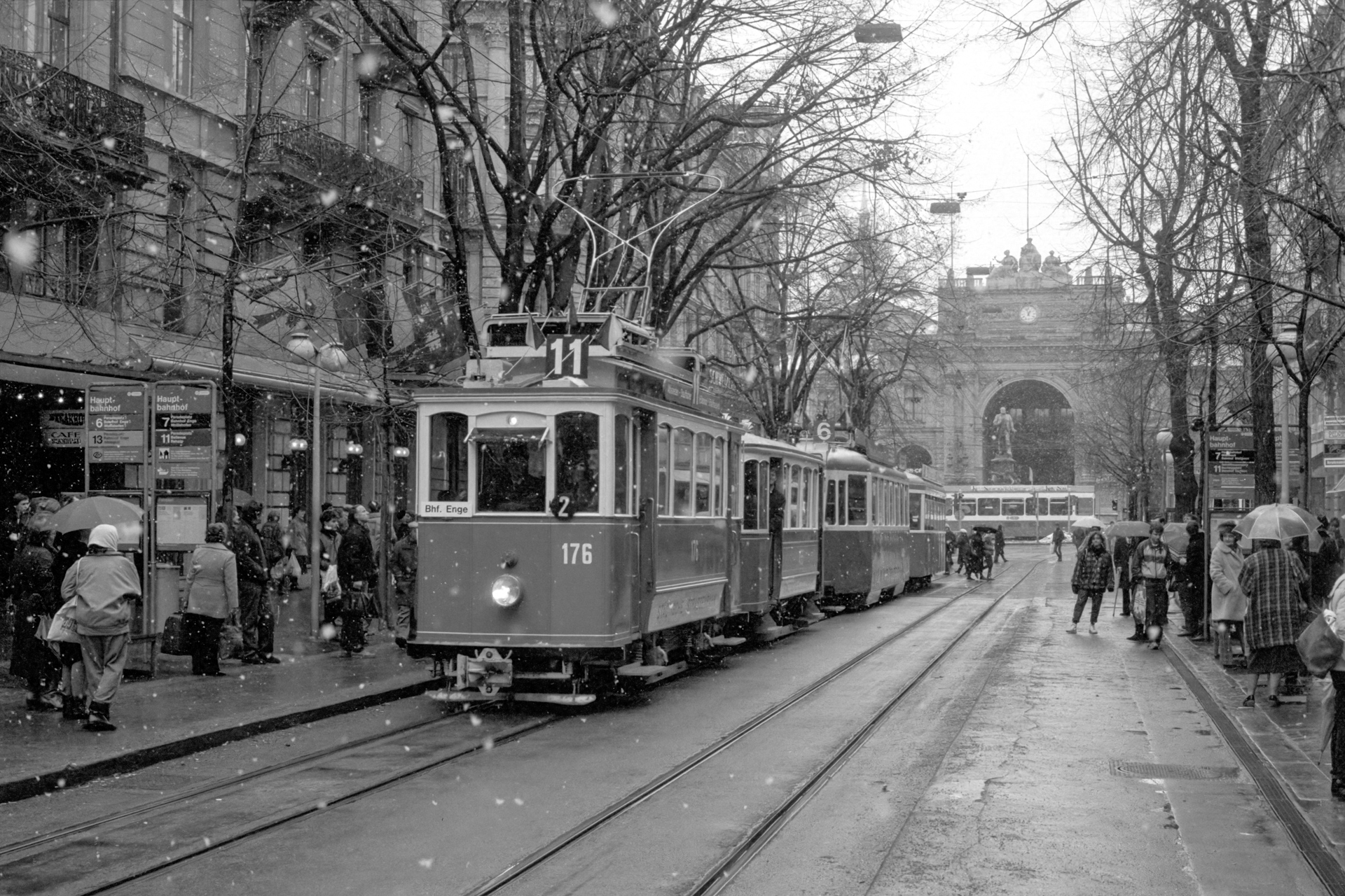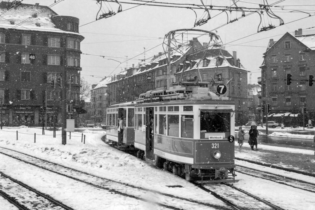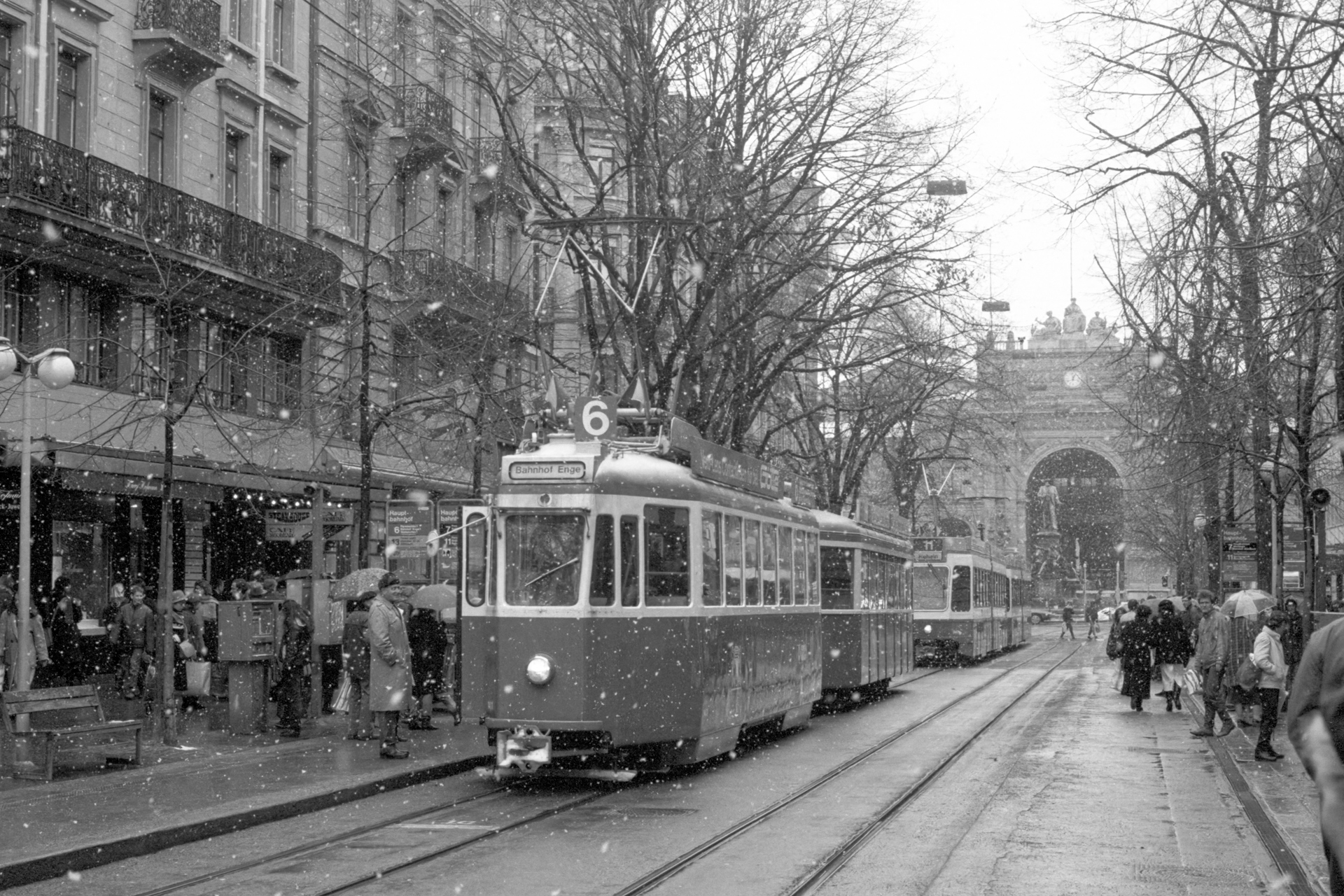 Das Wetter macht es mir wirklich schwer, inzwischen herrscht dichter Schneefall. Um 10 Uhr begegnet mir am Bellevue der erste der eingesetzten historischen Züge, Tw 321 („Elefant“, Baujahr 1930) und Bw 687 (Baujahr 1931). Der Zug setzt vermutlich vom Depot Burgwies aus einMit dem Museumszug bin ich wohl zum Bahnhof Enge mitgefahren, denn als nächstes gibt es eine Fotosession ebendort mitten im Schneegestöber. Hier ein Zug der Linie 6.Ein Zug der Linie 5 an der HaltestelleEr bleibt da einige Minuten stehen, so das ich vom Straßenrand etwas mehr Atmosphäre einfangen kann. Darauf habe ich gewartet: Der zweite Zug der Museumslinie kommt an und fährt in die Schleife ein. Es ist der Triebwagen 1 der Elektrischen Strassenbahn Zürich–Oerlikon–Seebach des Baujahres 1897.