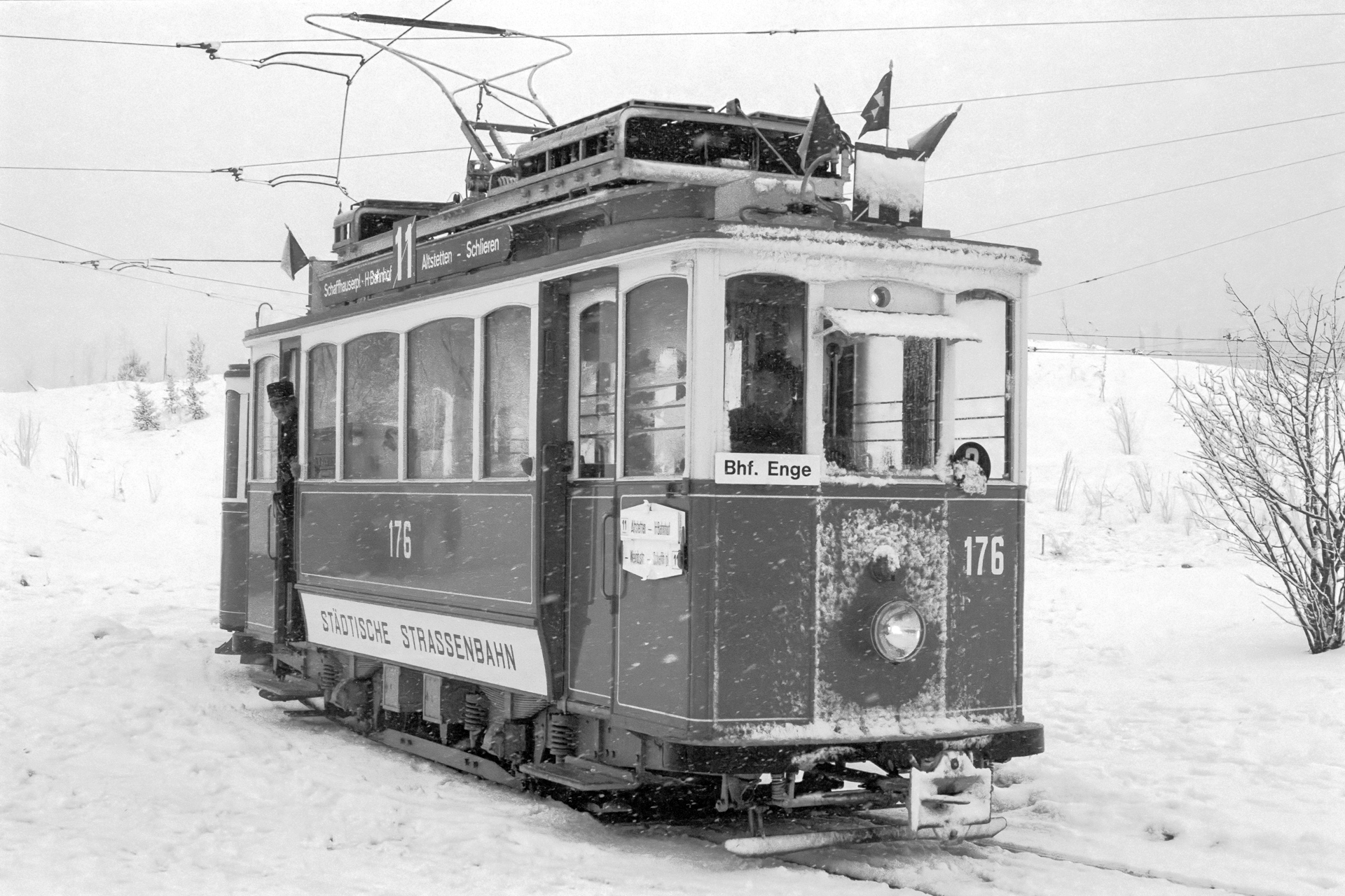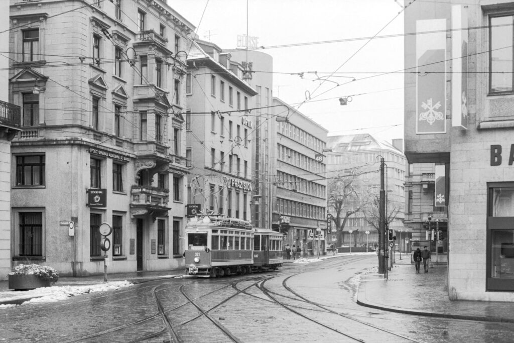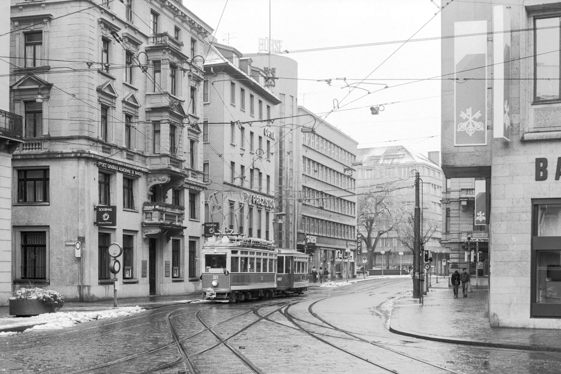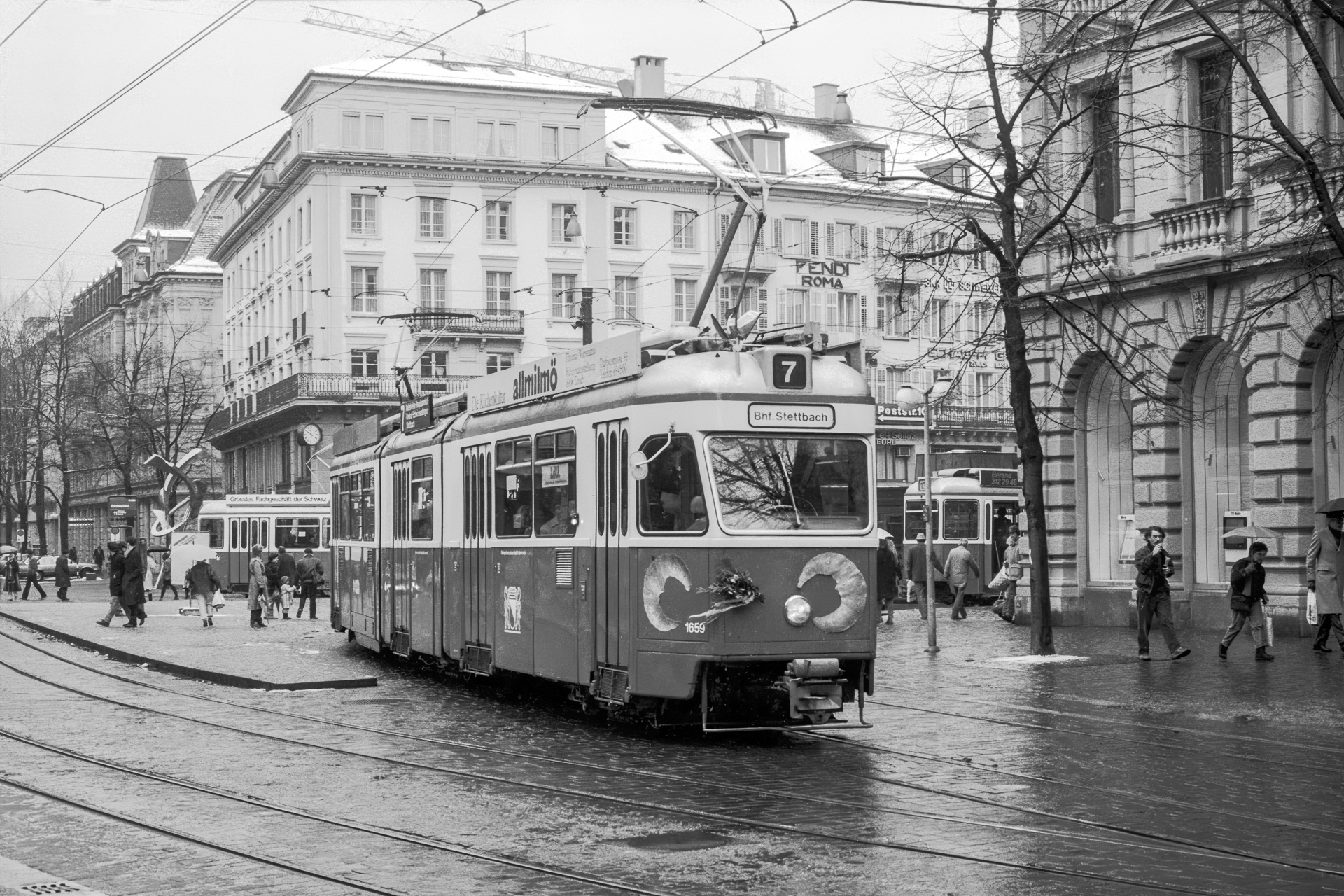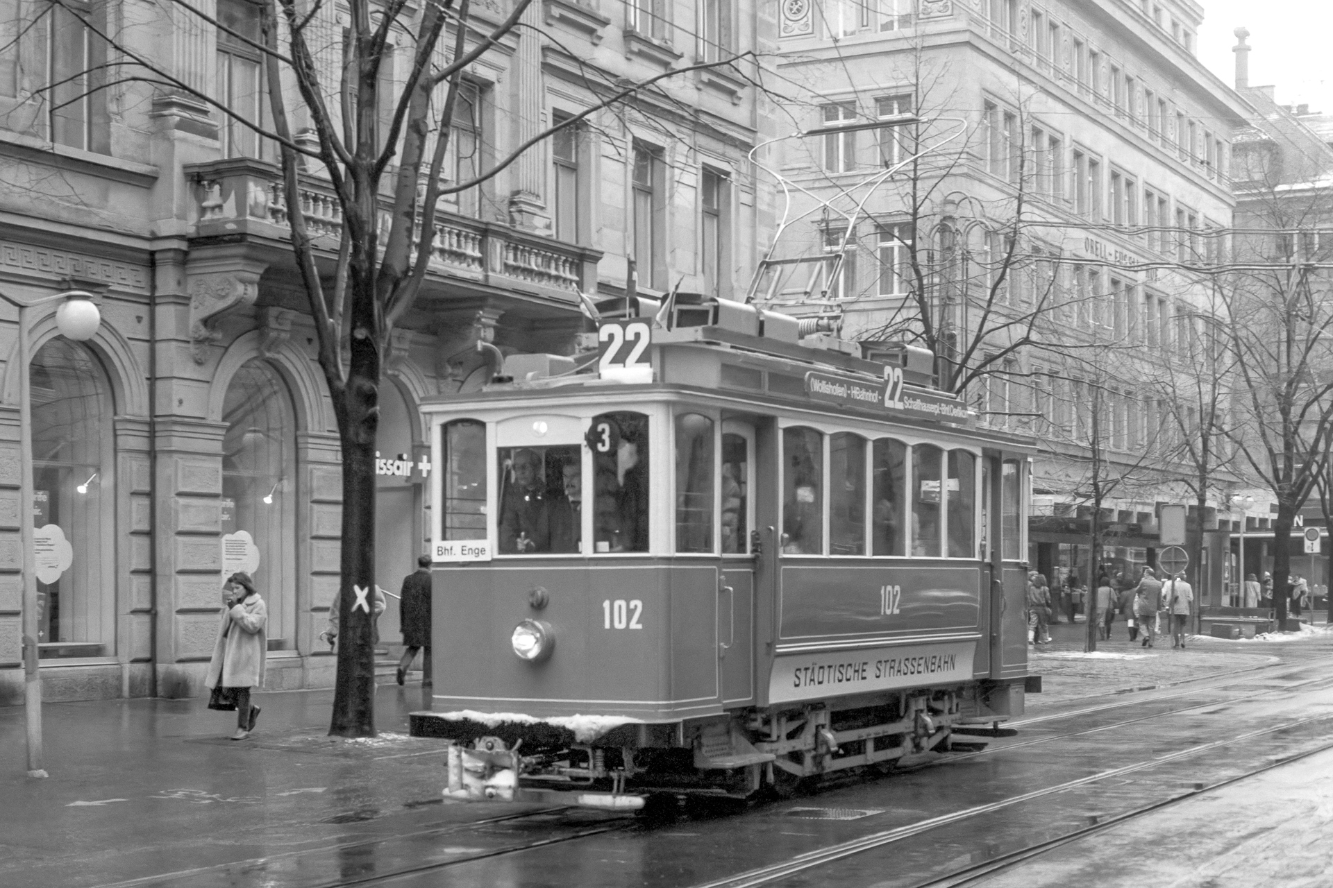 Das Wetter macht es mir wirklich schwer, inzwischen herrscht dichter Schneefall. Um 10 Uhr begegnet mir am Bellevue der erste der eingesetzten historischen Züge, Tw 321 („Elefant“, Baujahr 1930) und Bw 687 (Baujahr 1931). Der Zug setzt vermutlich vom Depot Burgwies aus einMit dem Museumszug bin ich wohl zum Bahnhof Enge mitgefahren, denn als nächstes gibt es eine Fotosession ebendort mitten im Schneegestöber. Hier ein Zug der Linie 6.Ein Zug der Linie 5 an der HaltestelleEr bleibt da einige Minuten stehen, so das ich vom Straßenrand etwas mehr Atmosphäre einfangen kann. Darauf habe ich gewartet: Der zweite Zug der Museumslinie kommt an und fährt in die Schleife ein. Es ist der Triebwagen 1 der Elektrischen Strassenbahn Zürich–Oerlikon–Seebach des Baujahres 1897.