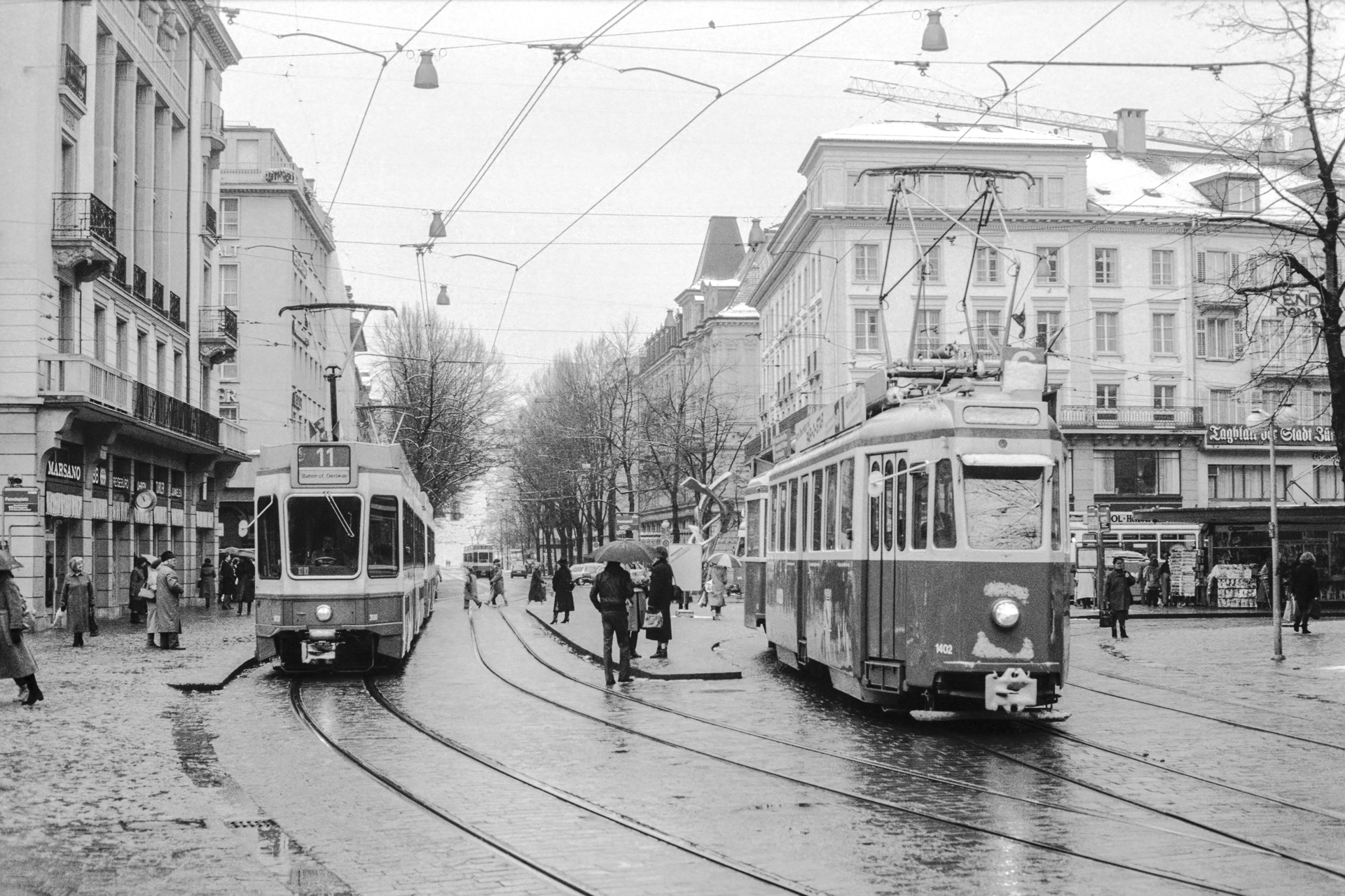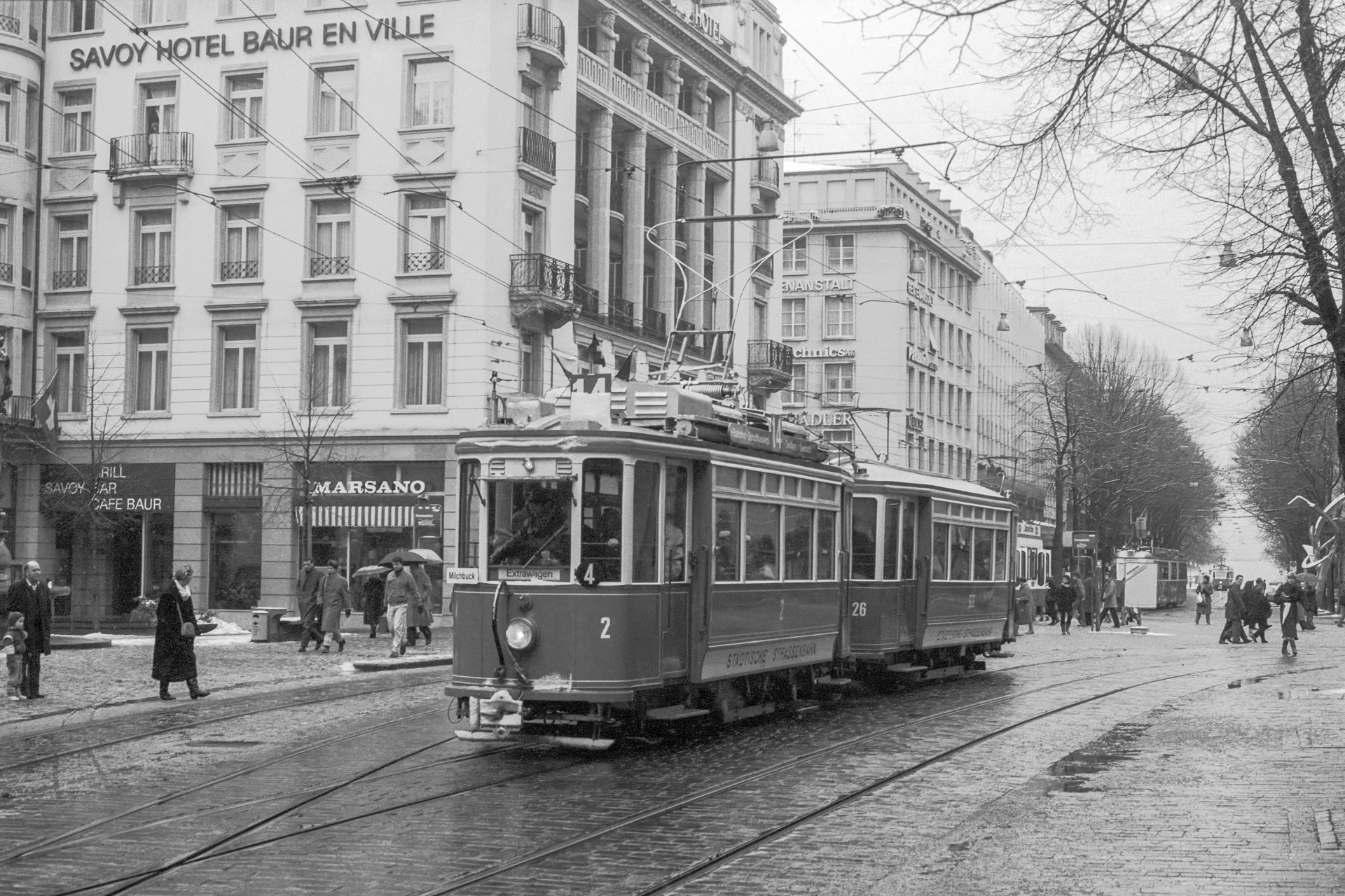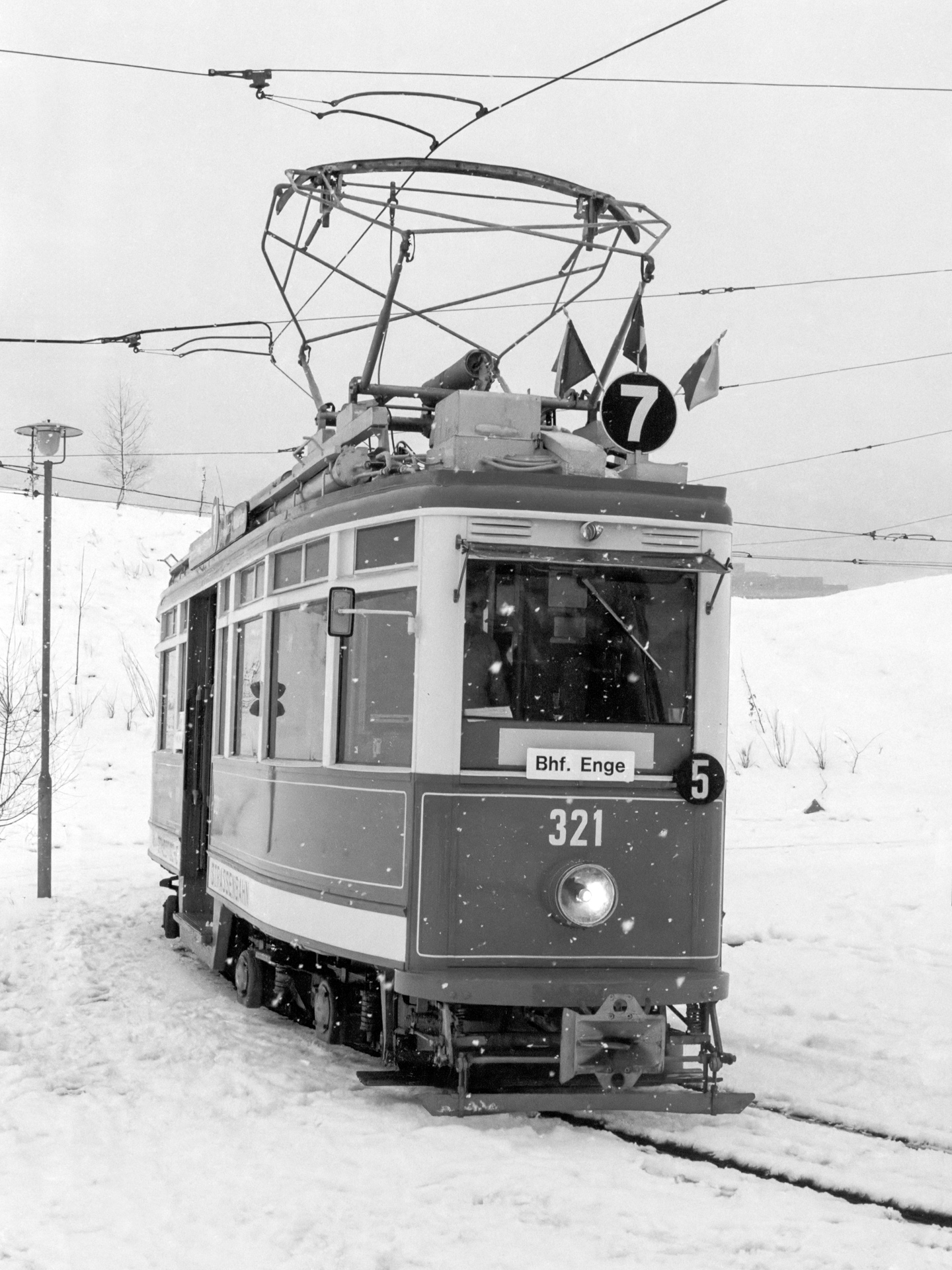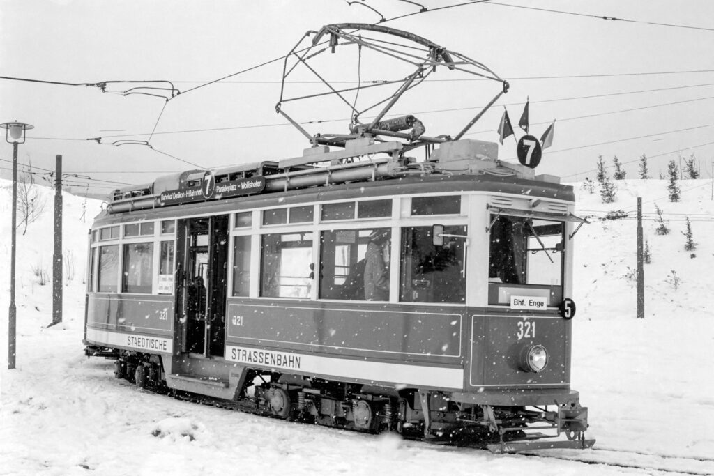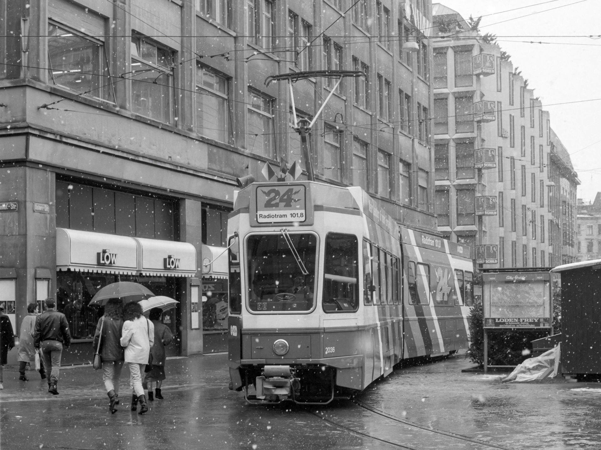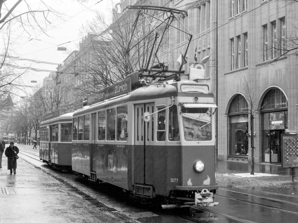 Das Wetter macht es mir wirklich schwer, inzwischen herrscht dichter Schneefall. Um 10 Uhr begegnet mir am Bellevue der erste der eingesetzten historischen Züge, Tw 321 („Elefant“, Baujahr 1930) und Bw 687 (Baujahr 1931). Der Zug setzt vermutlich vom Depot Burgwies aus einMit dem Museumszug bin ich wohl zum Bahnhof Enge mitgefahren, denn als nächstes gibt es eine Fotosession ebendort mitten im Schneegestöber. Hier ein Zug der Linie 6.Ein Zug der Linie 5 an der HaltestelleEr bleibt da einige Minuten stehen, so das ich vom Straßenrand etwas mehr Atmosphäre einfangen kann. Darauf habe ich gewartet: Der zweite Zug der Museumslinie kommt an und fährt in die Schleife ein. Es ist der Triebwagen 1 der Elektrischen Strassenbahn Zürich–Oerlikon–Seebach des Baujahres 1897.