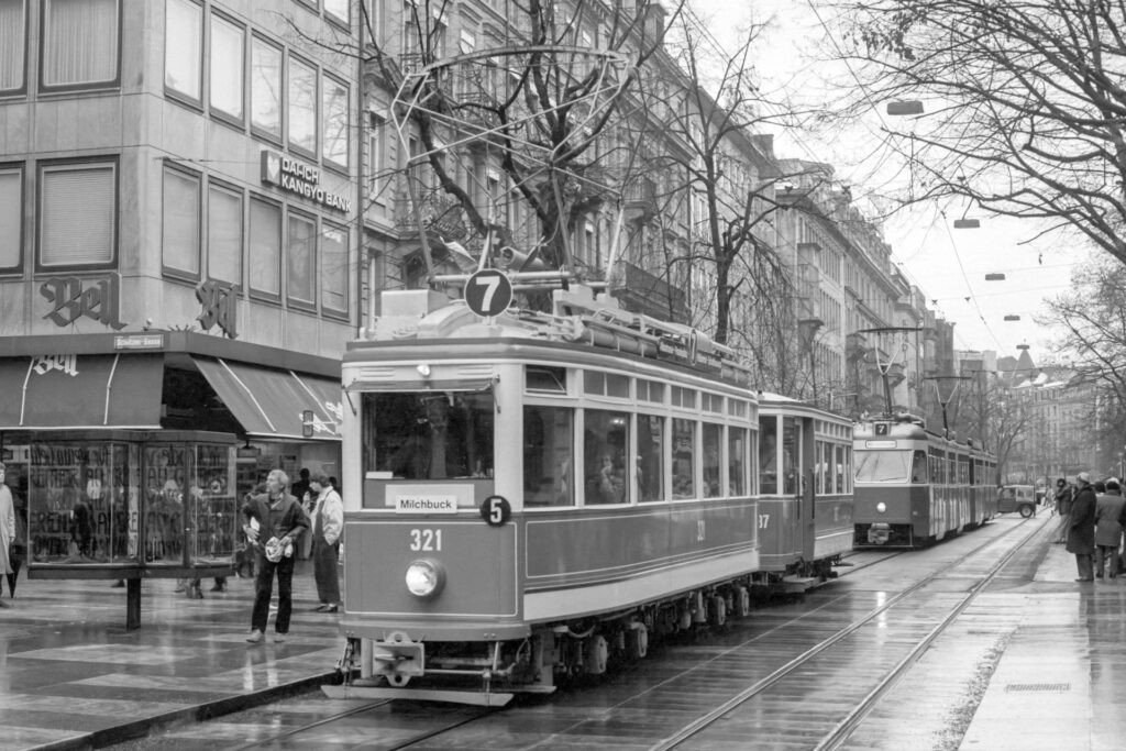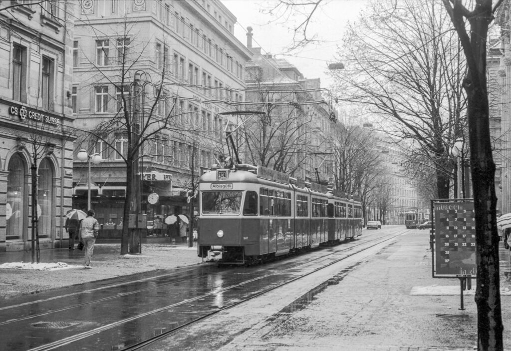 Mit dem Zug ging es dann weiter. Endstation war für mich aber diesmal in der Stadt, am Paradeplatz. Dort und in der Bahnhofstraße habe ich dann ausführlich fotografiert, den Alltagsbetrieb und die historischen Bahnen, was immer an mir vorbei fuhr. Bei Ankunft am Paradeplatz war es übrigens ca. 12 Uhr. Nach einer guten Stunde bin ich dann ab Hauptbahnhof nochmals zum Milchbuck weiter gefahren. Ich stelle die Fotos hier in chronologischer Reihenfolge weitestgehend unkommentiert mal vor: