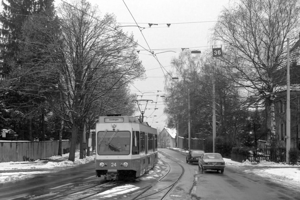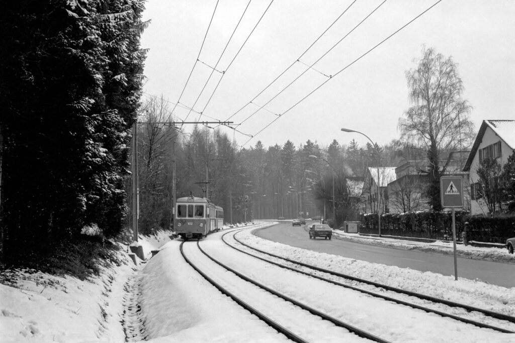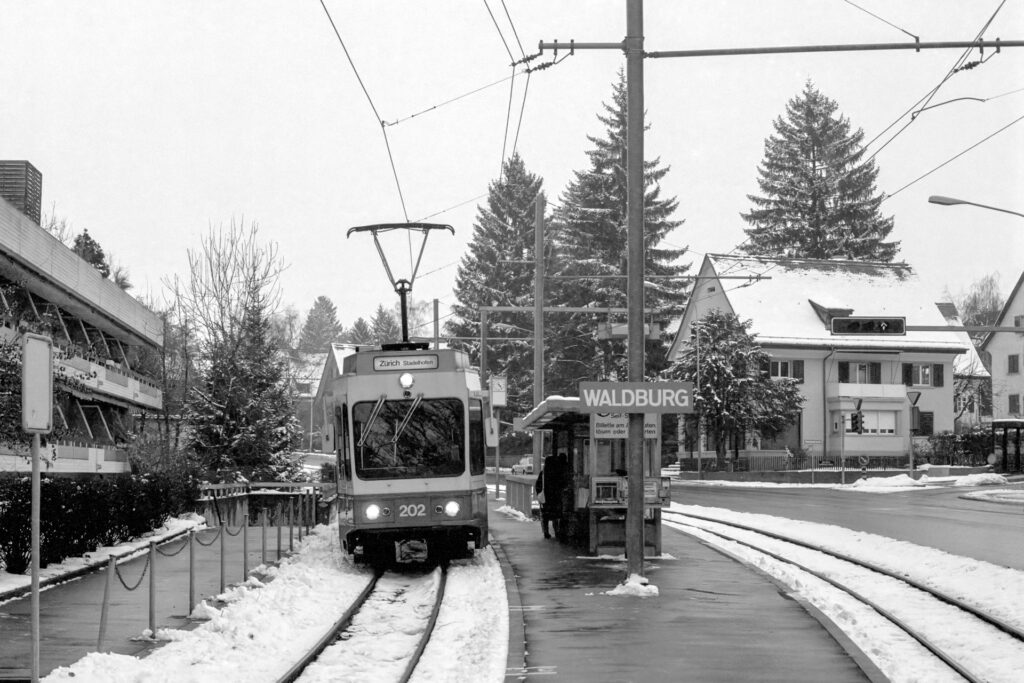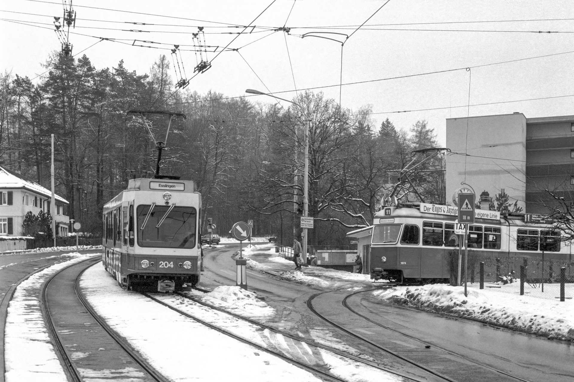 Ein allerletztes Foto gibt es noch von dem historischen Zug an der Haltestelle Hauptbahnhof in der BahnhofstraßeUnd jetzt sind wir an der Schleife Rehalp:Ein vom Bahnhof Stadelhofen kommender Zug mit den (damals) neuen Tw Be8/8 24 (Baujahr 1976) und dem Steuerwagen Bt 204 (Baujahr 1981) Derselbe Zug ein paar Sekunden später von hinten an der Haltestelle. Rechts ein Zug der Linie 11 in der Schleife. Ich bin dann hinterhergelaufen …Hinter Rehalp geht die Forchstraße steil bergauf, die Bahn verkehrt in Seitenlage neben der Straße. Als erstes kommt mir ein stadteinwärtsfahrender Zug aus Altwagen entgegen. Es müsste in Höhe Einmündung Schwendenhausstraße seinPrakrtisch die gleiche Stelle, aber ein bergwärts fahrender Zug, geführt vom Steuerwagen 104Die Station WaldburgNächste Station ist „Spital Zollikerberg“, diesen Dreiwagenzug aus modernem Material habe ich kurz davor fotografiertEine Station bin ich noch gelaufen, bis Zollikerberg. Der Zug mit Bt 102 an der Spitze kommt aus der Stadt zurück