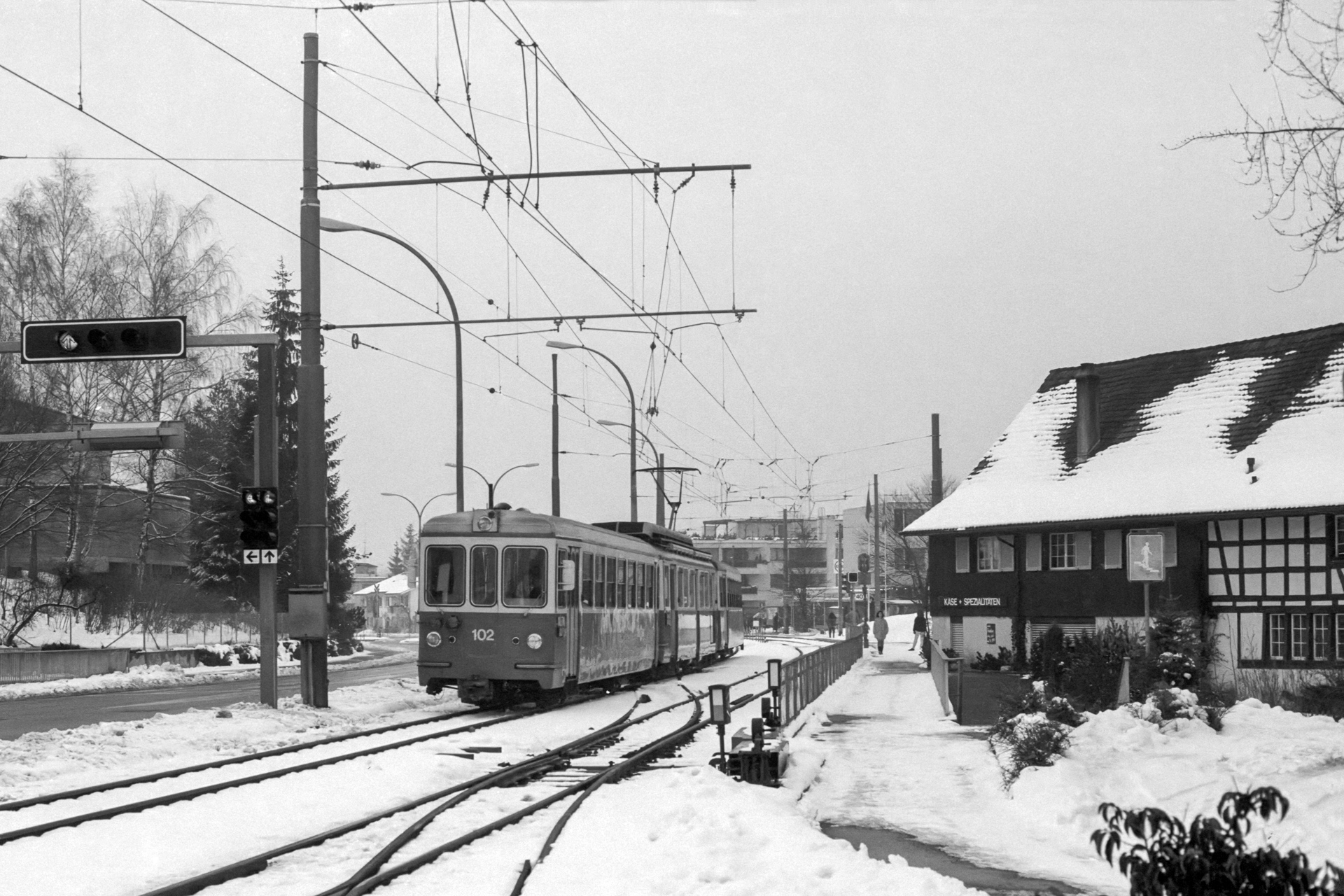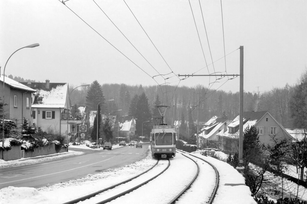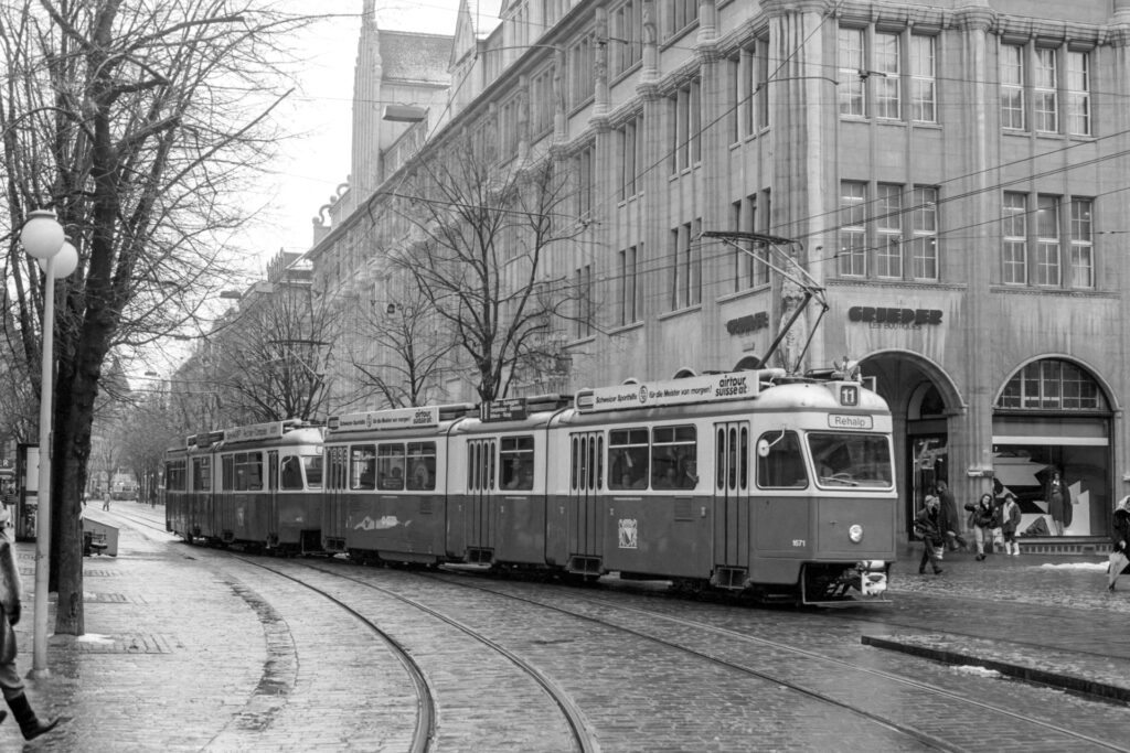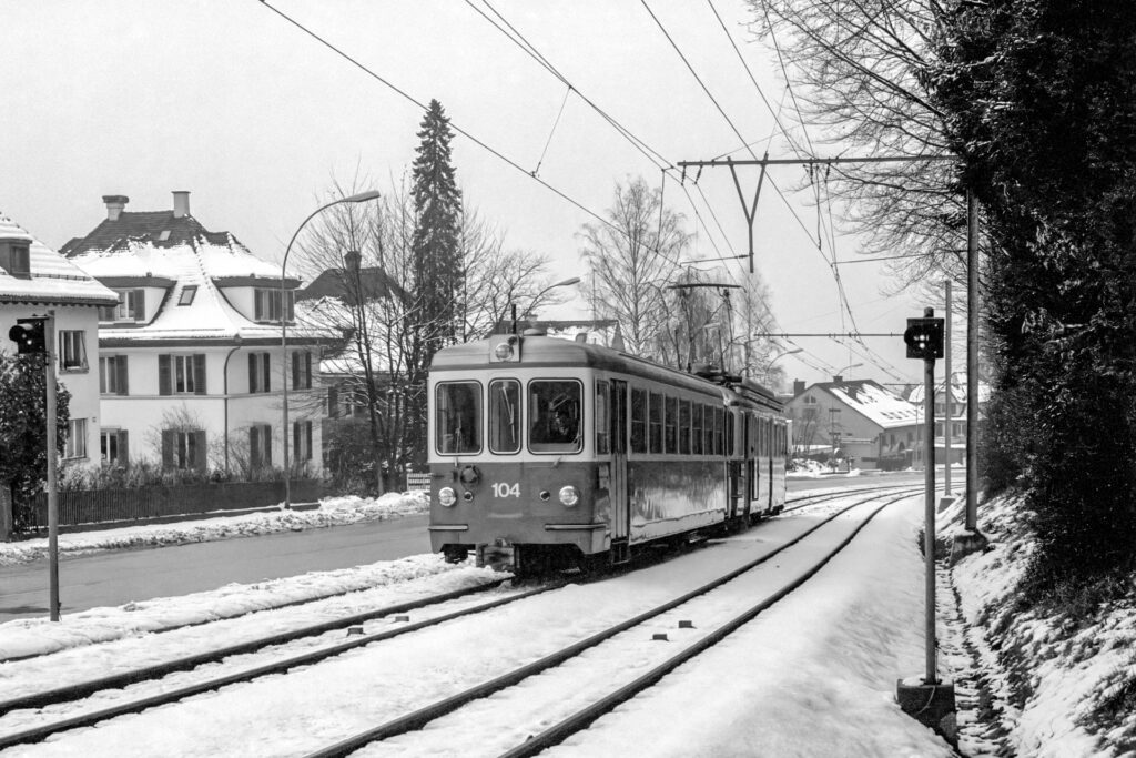 Ein allerletztes Foto gibt es noch von dem historischen Zug an der Haltestelle Hauptbahnhof in der BahnhofstraßeUnd jetzt sind wir an der Schleife Rehalp:Ein vom Bahnhof Stadelhofen kommender Zug mit den (damals) neuen Tw Be8/8 24 (Baujahr 1976) und dem Steuerwagen Bt 204 (Baujahr 1981) Derselbe Zug ein paar Sekunden später von hinten an der Haltestelle. Rechts ein Zug der Linie 11 in der Schleife. Ich bin dann hinterhergelaufen …Hinter Rehalp geht die Forchstraße steil bergauf, die Bahn verkehrt in Seitenlage neben der Straße. Als erstes kommt mir ein stadteinwärtsfahrender Zug aus Altwagen entgegen. Es müsste in Höhe Einmündung Schwendenhausstraße seinPrakrtisch die gleiche Stelle, aber ein bergwärts fahrender Zug, geführt vom Steuerwagen 104Die Station WaldburgNächste Station ist „Spital Zollikerberg“, diesen Dreiwagenzug aus modernem Material habe ich kurz davor fotografiertEine Station bin ich noch gelaufen, bis Zollikerberg. Der Zug mit Bt 102 an der Spitze kommt aus der Stadt zurück