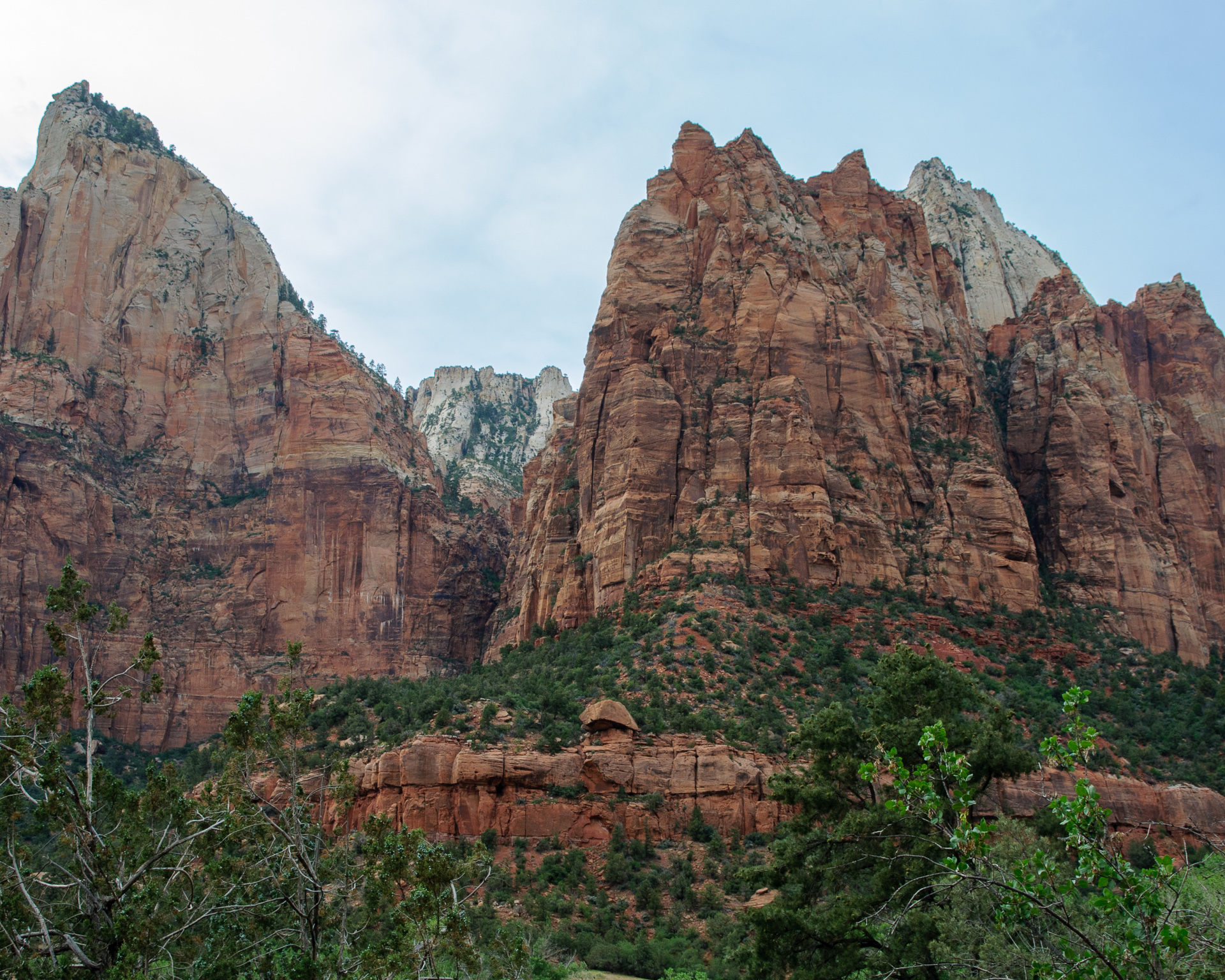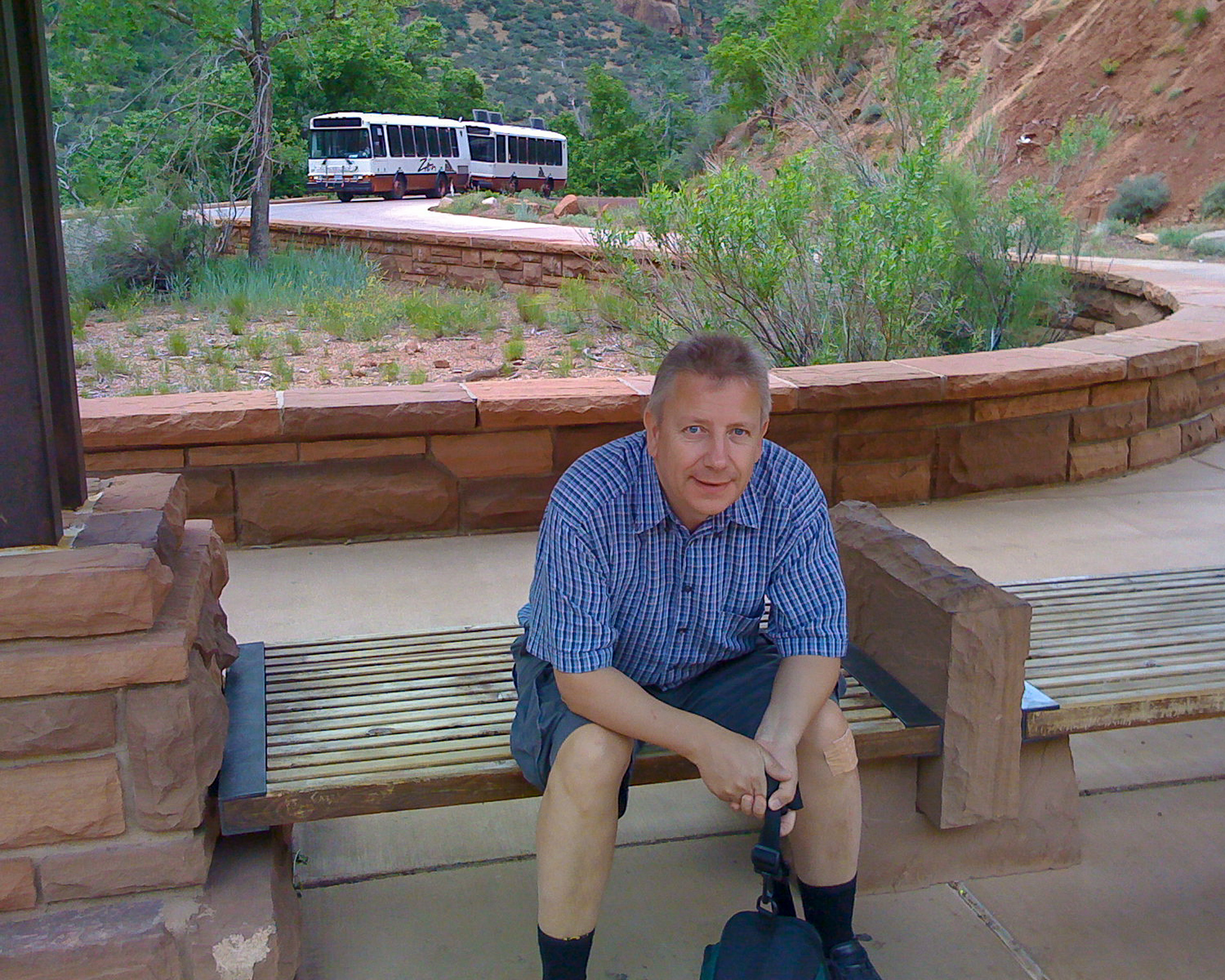 Eigentlich wollte ich ja „non-stop“ mit dem Bus hin- und zurück fahren, aber auf Anraten des Tonbands stiegen wir dann doch an zwei Zwischenstops aus für ein paar Fotos. Erstens am „Court of the Patriarchs“. Na Ja. Die Aussicht ist ziemlich zugewachsen, und Gegenlicht war auch noch.