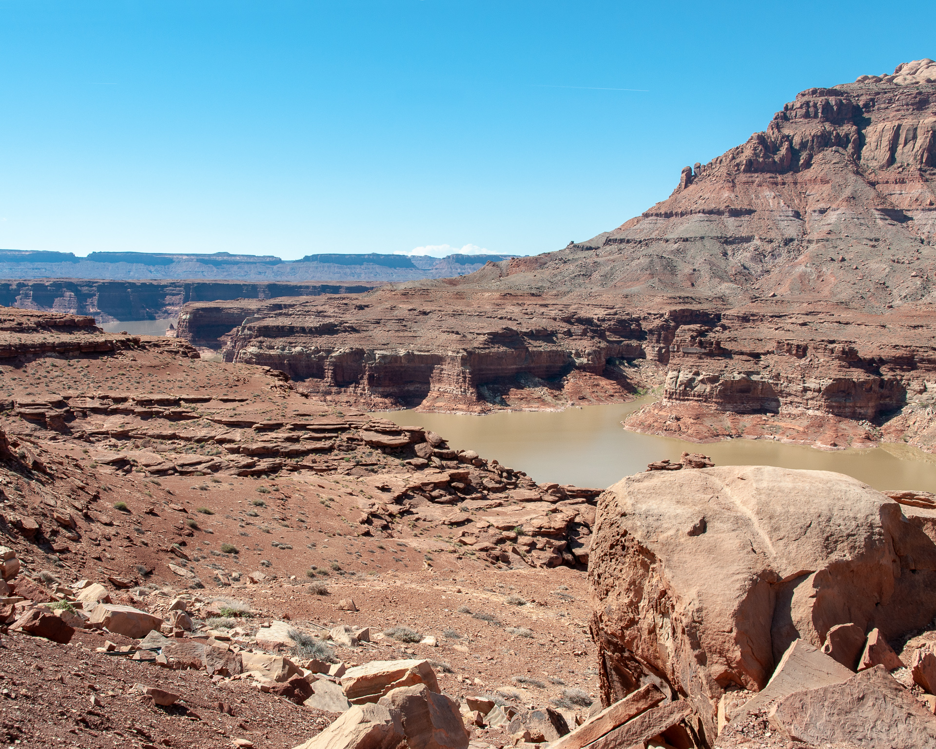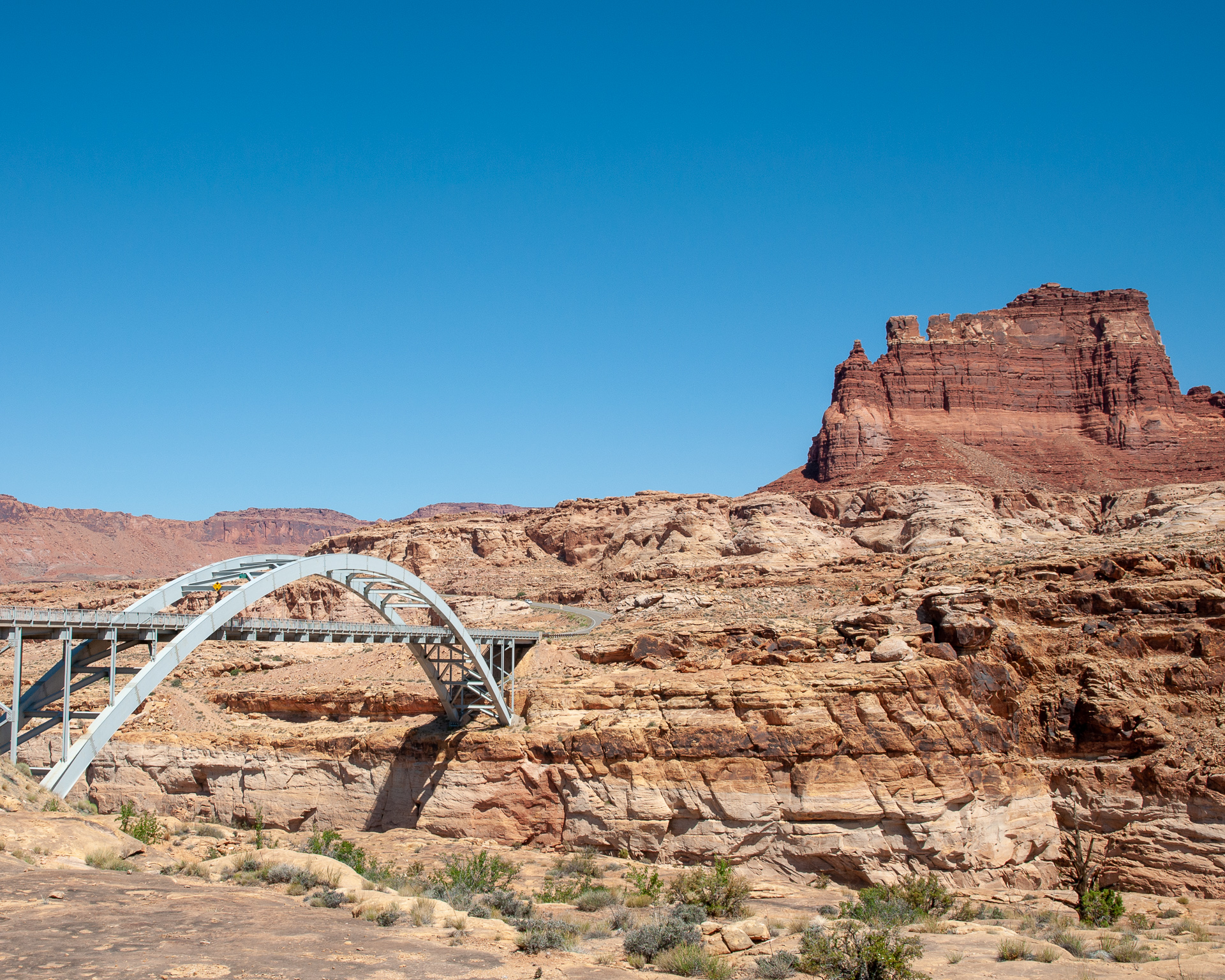 In Hanksville bogen wir ohne anzuhalten rechts ab auf die UT95 und folgten ihr. Zunächst geht es durch eine ebene, recht karge Landschaft, bis die Felsen immer mehr werden und die Straße zum Colorado River abfällt. Diesen überquert sie bei Hite auf einer Brücke.