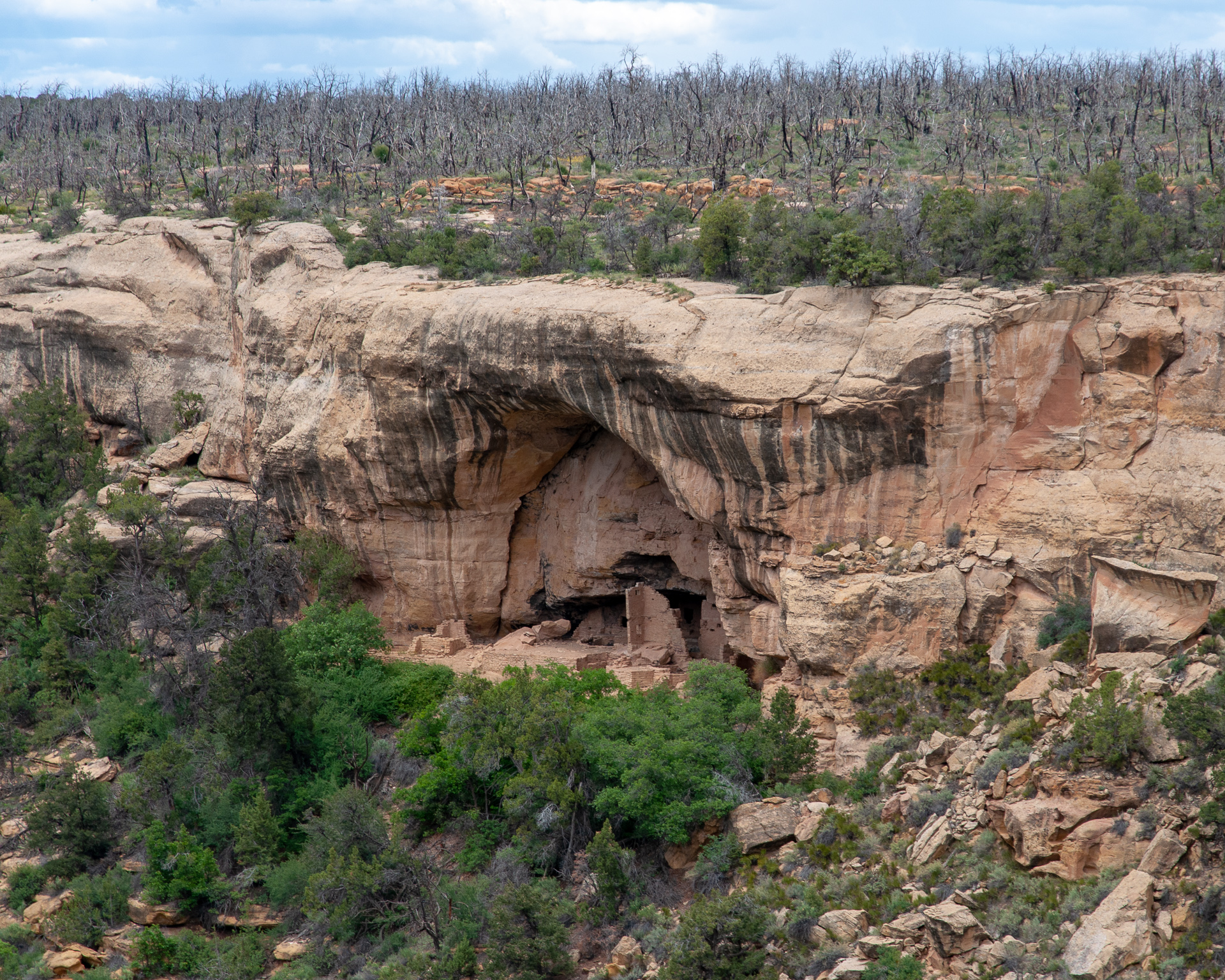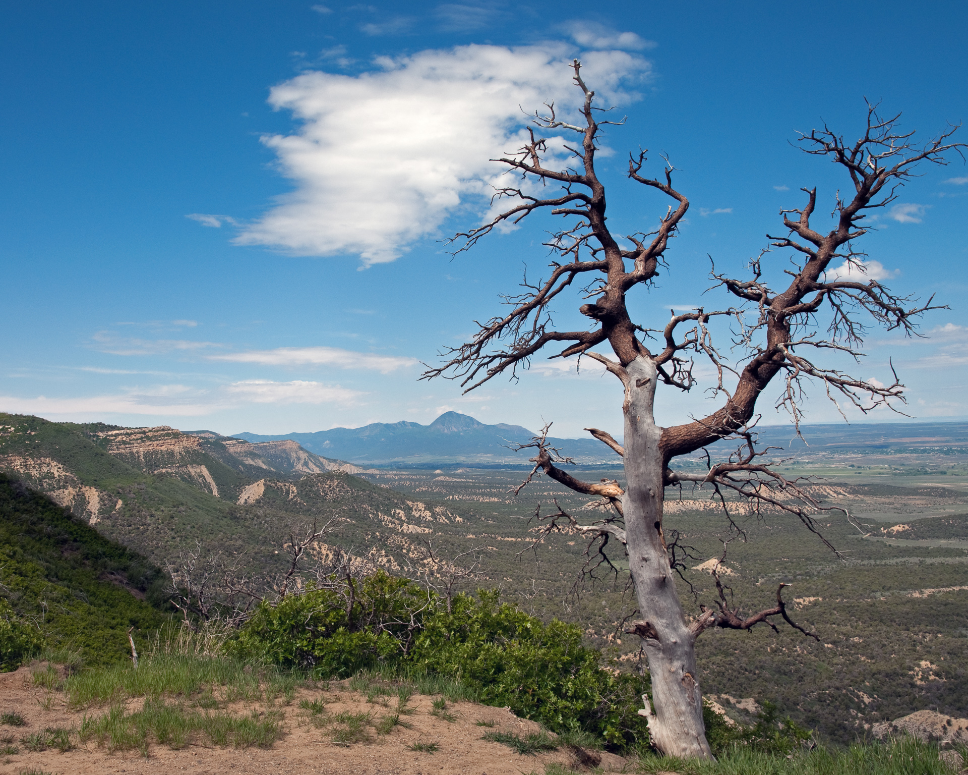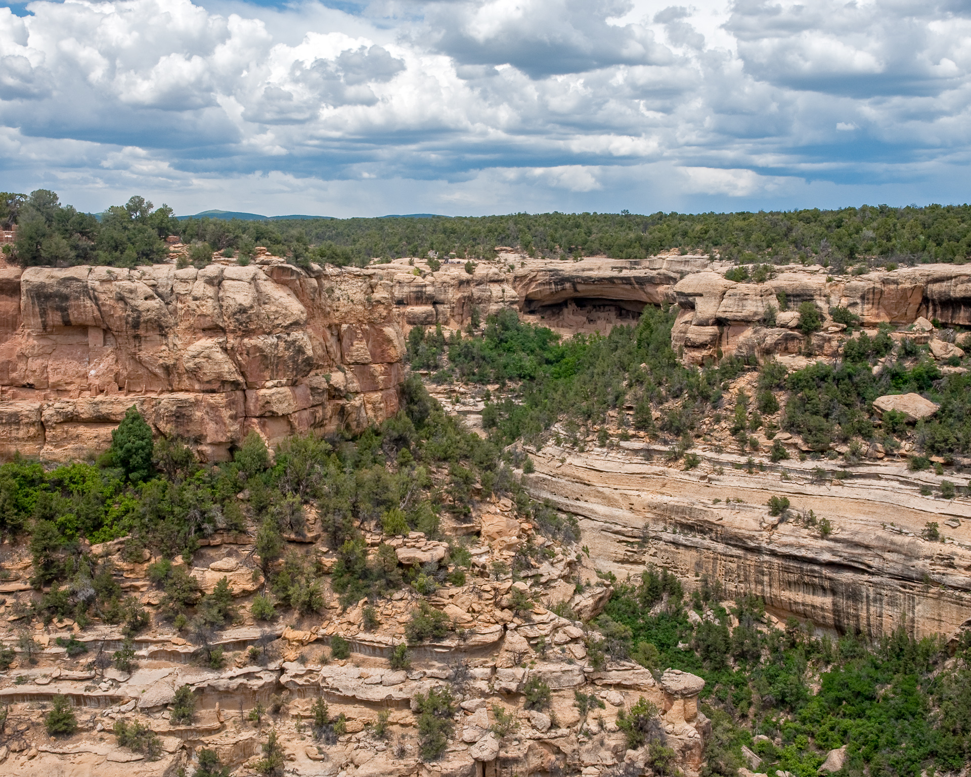 Dann geht es flott Richtung Osten. Ein paar Meter (ziemlich wörtlich zu nehmen) führen durch New Mexico, damit haben wir den Staat auch befahren. „Welcome“ Schilder spart man sich jedoch. Das Four Corners Monument lassen wir links liegen. Recht schnell ist dann Cortez erreicht, ab hier fällt uns der dichte Verkehr auf, nach den letzten Tagen sind wir das gar nicht mehr gewohnt. Programmpunkt heute ist der Mesa Verde Nationalpark. Dieser liegt recht hoch und die Zufahrtsstraße zieht sich 20 Meilen in die Berge hinein. Wir machen ein paar Stops einschliesslich des höchsten Punktes, Park Point Overlook auf 2600m.