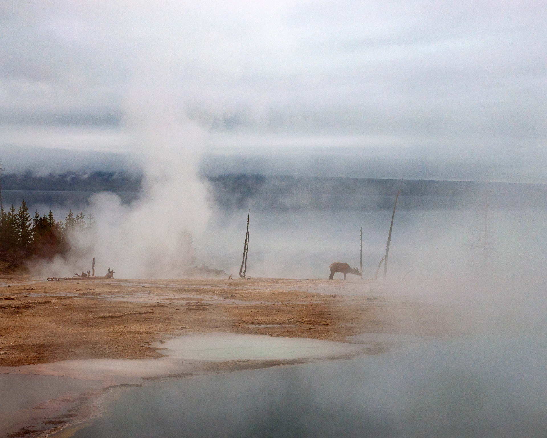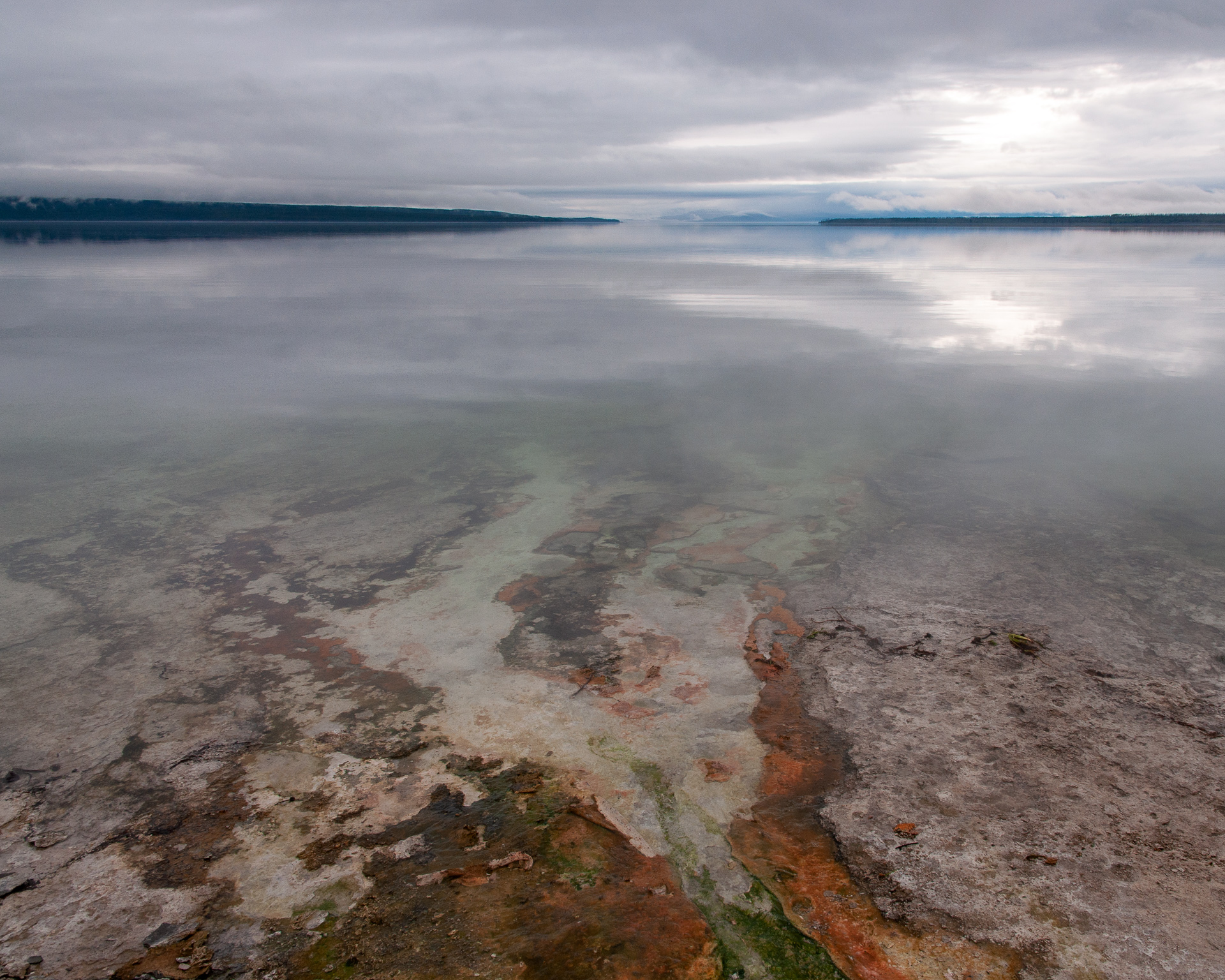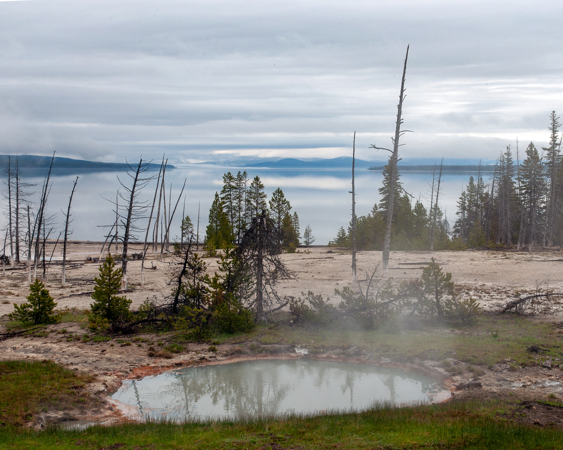 Erster der zwei Tage im Yellowstone. Übrigens Tag 11 von 21 Urlaubstagen und damit Halbzeit. Aufs Frühstück im Restaurant des Grant Village verzichteten wir natürlich. Immerhin gab es eine Kaffeemaschine auf dem Zimmer, sodass wir zumindest munter wurden. Nach zwei Minuten Fahrt stand dann schon die erste Attraktion auf dem Programm, das „West Thumb“ Geyserbecken. Es ist ein kleineres Geyserbecken, extra hinfahren lohnt sich sicher nicht, aber es lag ja direkt auf dem Weg. So früh am Tag war es auch noch ruhig, das hatten wir dann später nicht mehr. Die Feuchtigkeit durch den vielen Regen und die niedrigen Temperaturen sorgten dafür, das alle Geyser große Dampfwolken erzeugen, dies und der völlig ruhige Lake Yellowstone unter den grauen Wolken sorgten für eine eigenartige Atmosphäre.