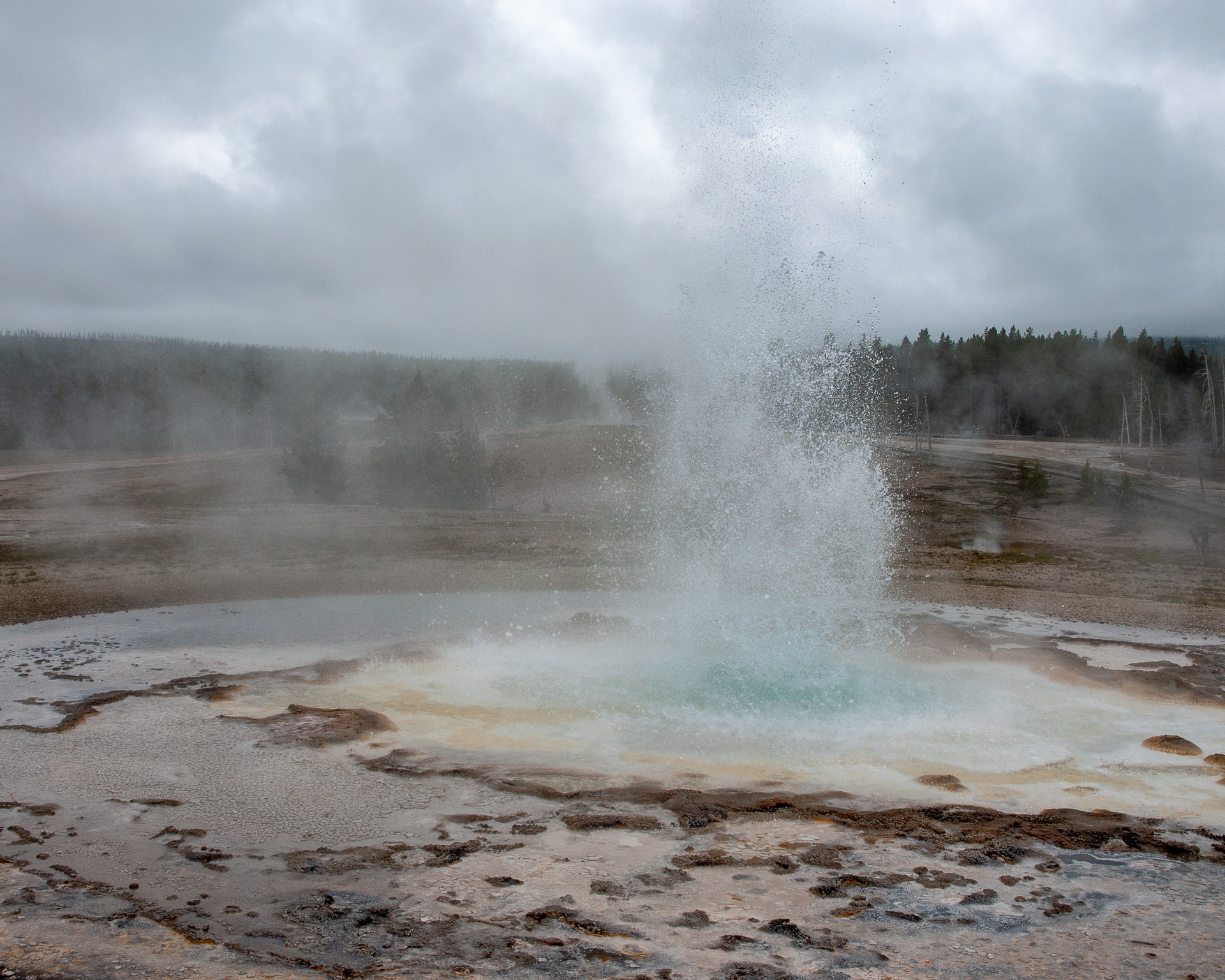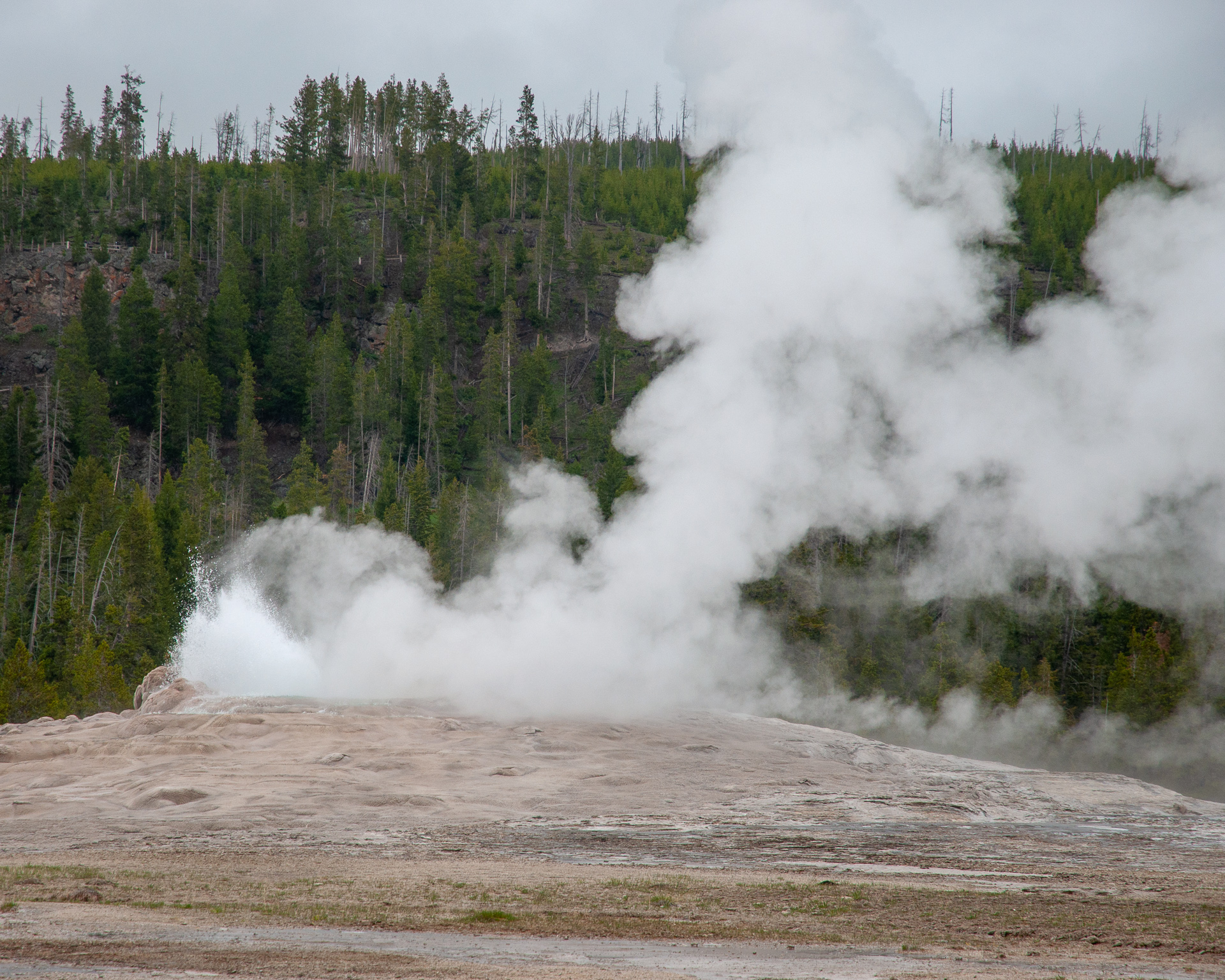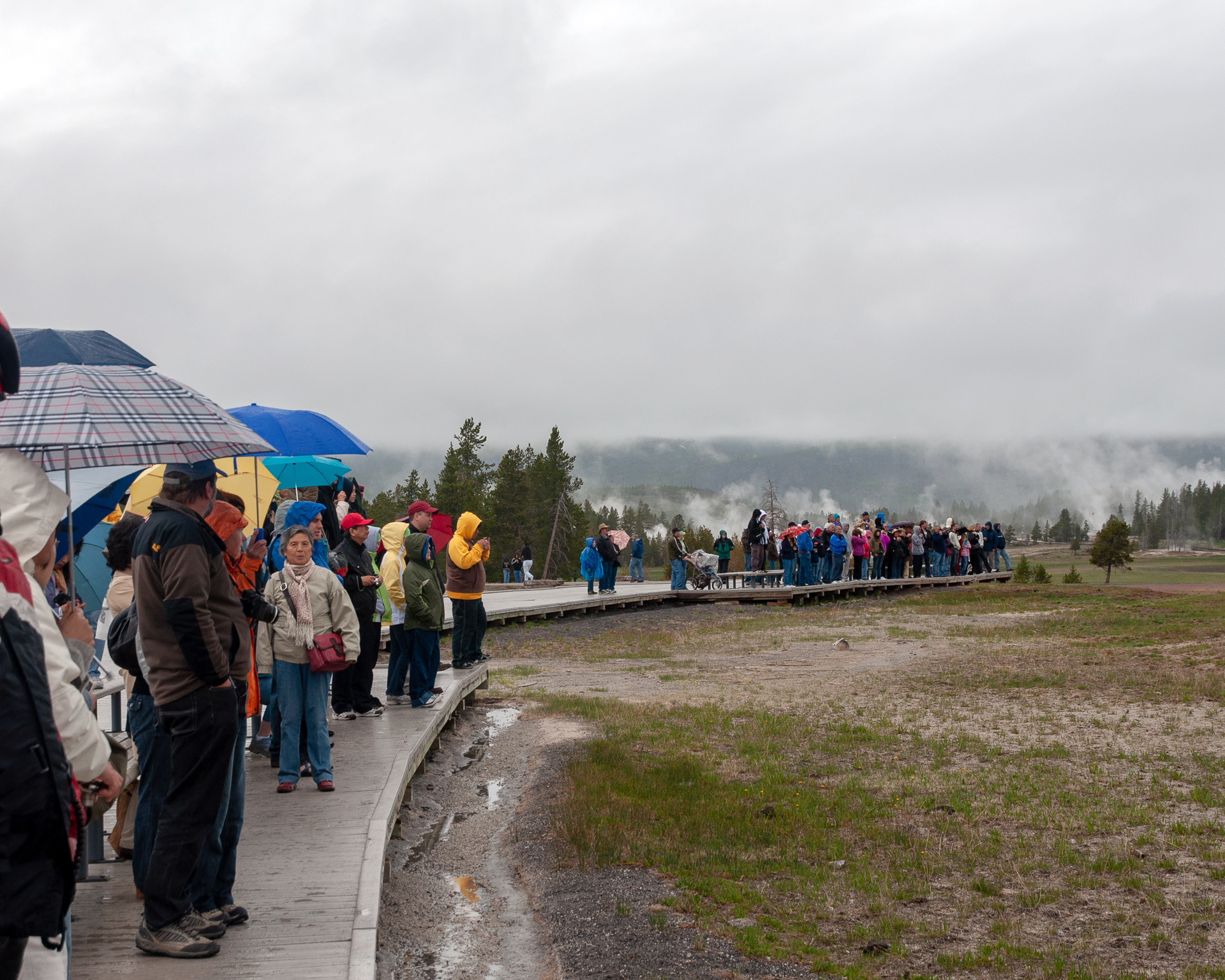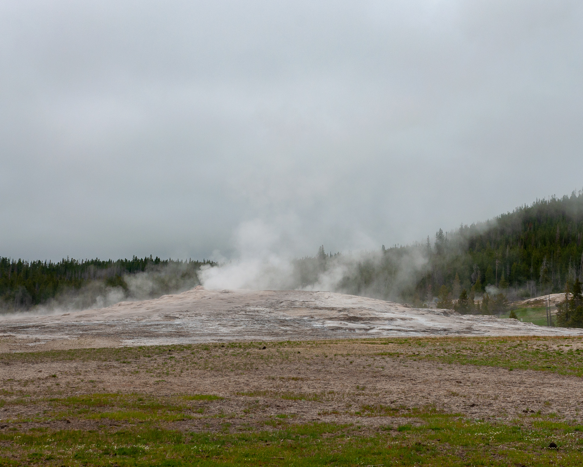 Für uns ging es weiter zur „Hauptattraktion“ des Yellowstone, Old Faithfull. Nach einem kurzen Stop an den Kepler Cascades, einem Wasserfall, trudelten wir dort ein und informierten uns im Visitor Center erstmal über die erwarteten Eruptionen. Wie zu erwarten bot einzig Old Faithfull für den eiligen Touristen akzeptable Ausbruchszeiten. Bis zur nächsten Eruption war noch Zeit für ein schnelles Frühstück im Old Faithfull Inn. Dann fanden wir uns auf der Zuschauerterasse ein und warteten im Nieselregen, eine große Menschenmenge war trotz des Wetters da. Old Faithfull zierte sich ein wenig und die Eruption war einige Minuten verspätet. So richtig wirkt es bei all dem Rummel aber nicht.