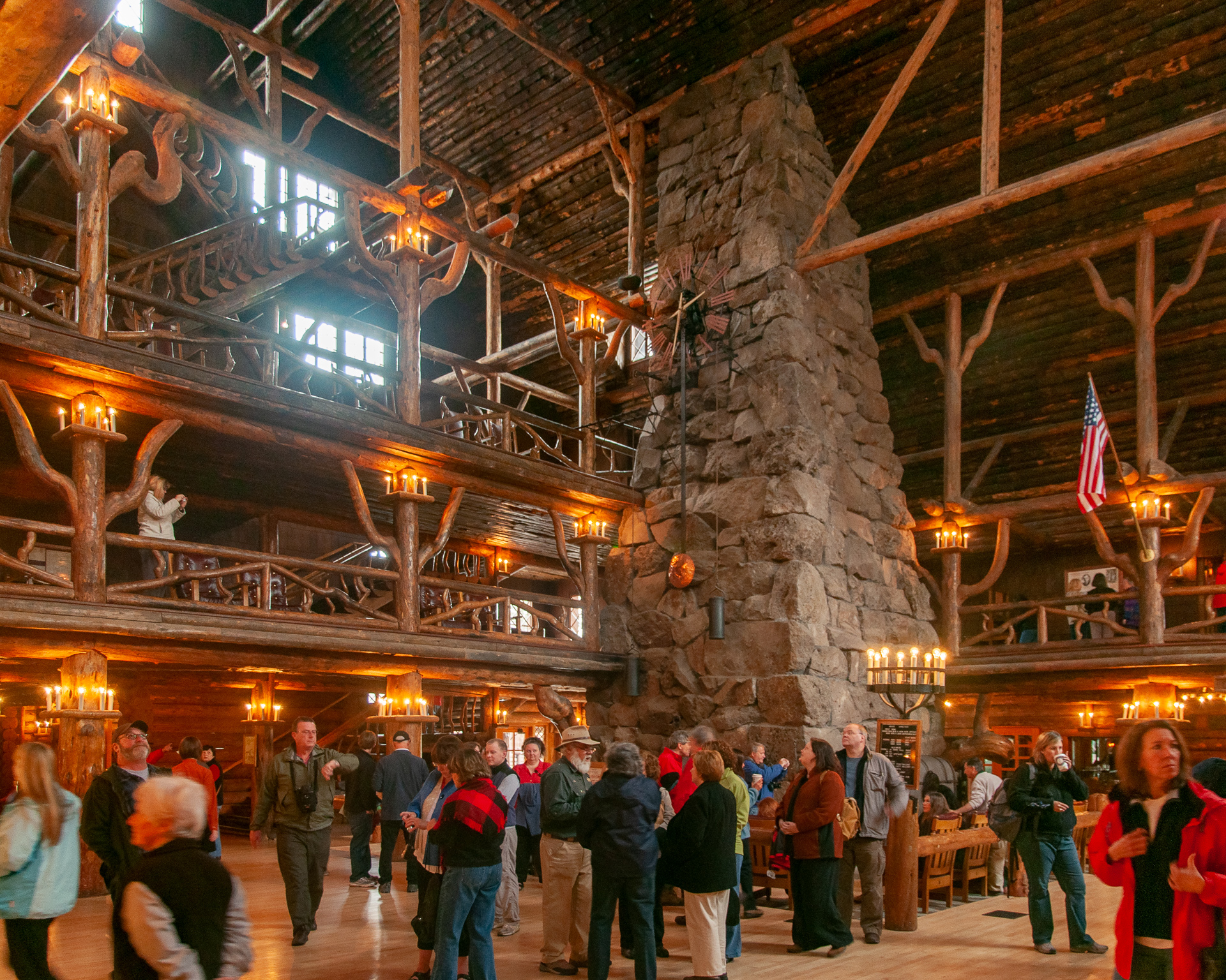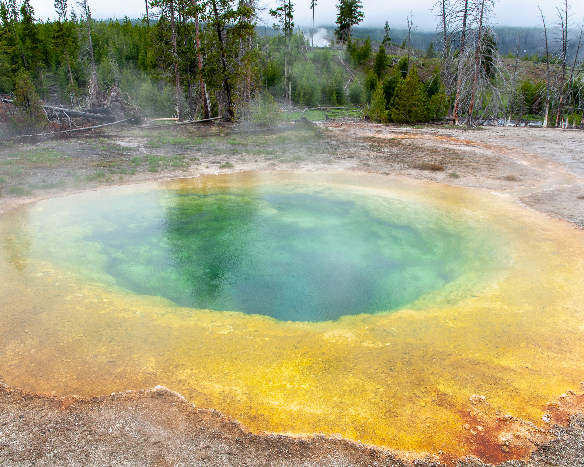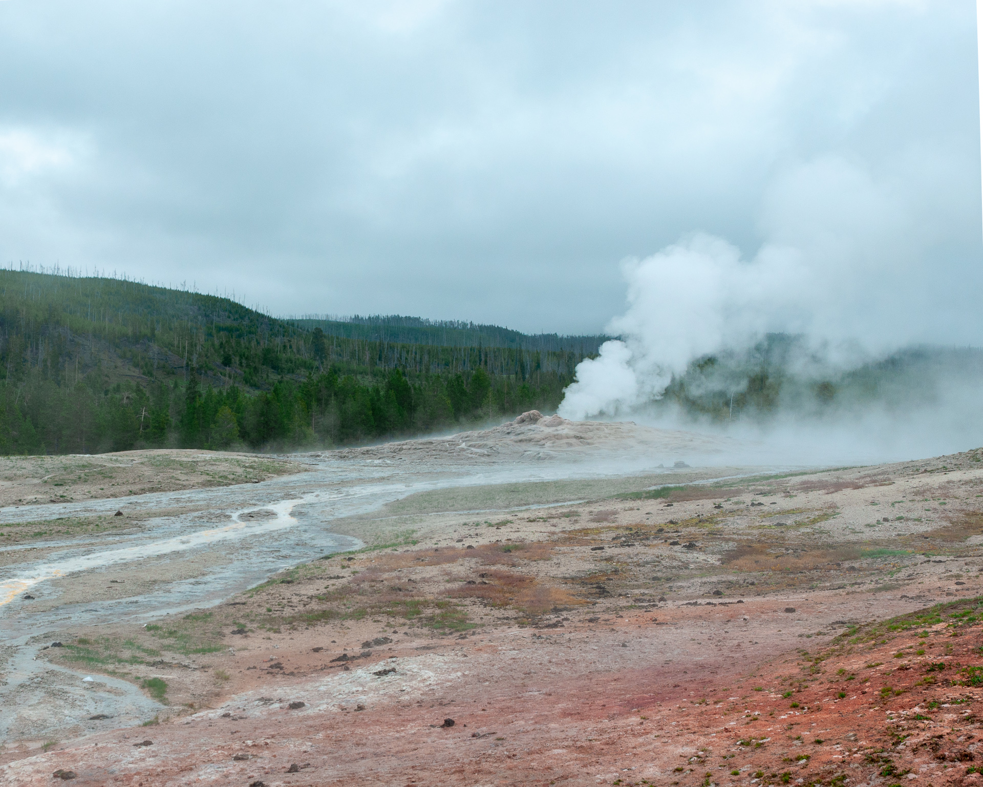 Nach dem doch etwas längeren Herumstehen im Regen wärmten wir uns kurz in der Lodge auf und bewunderten deren Architektur, danach machten wir uns trotz des Wetters auf die Wanderung durch das Upper Geyer Bassin. Wir gingen gemütlich bis zum Morning Glory Pool und wieder zurück. Dabei kommt man an Geysern und Pools in allen möglichen Variationen vorbei, eine einmalige und faszinierende Landschaft.
