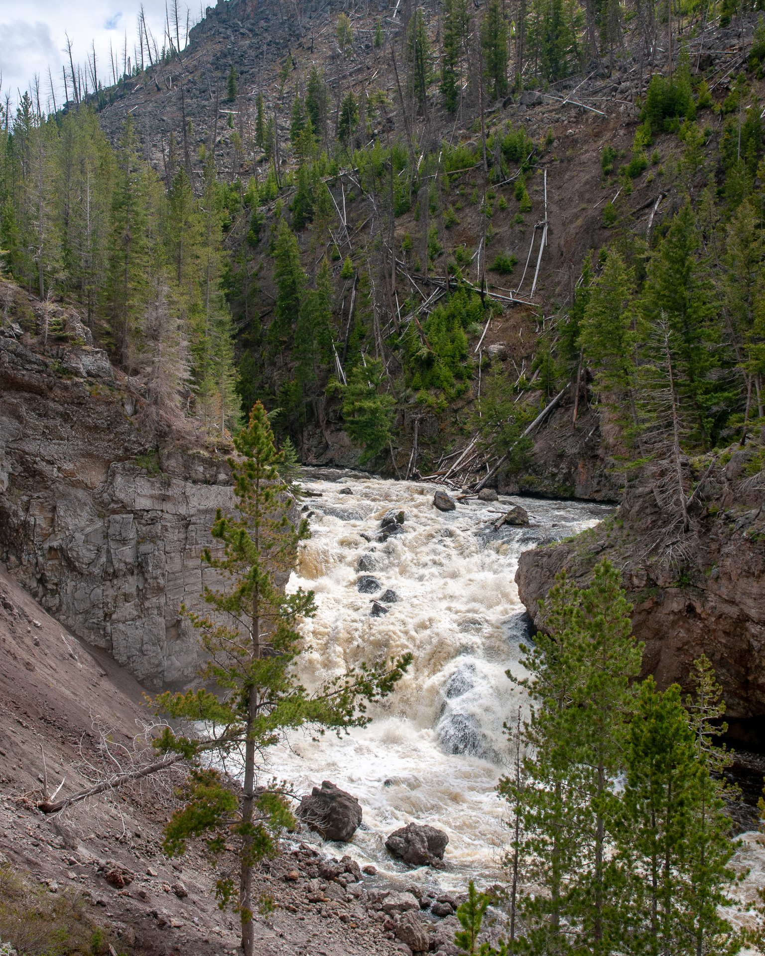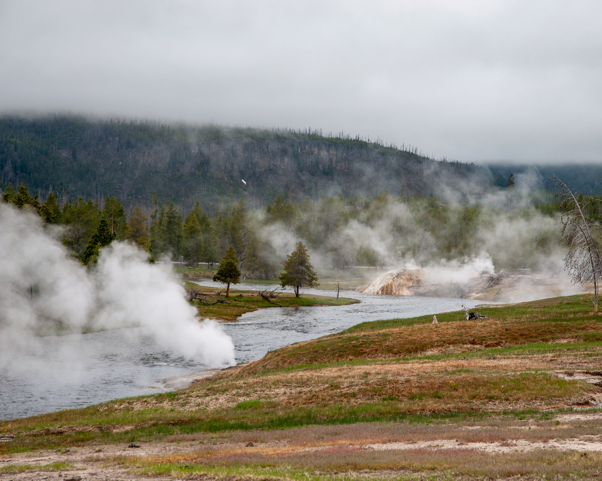 Wir fuhren zügig weiter bis West Yellowstone, wo wir nach kurzen Rundgang uns in einem Restaurant zum Lunch niederließen, eine warme Mahlzeit am Tag musste sein. Im Supermarkt frischten wir die Wasser- und Biervorräte auf, und besorgten auch Salat und Sandwiches fürs Abendessen. Dann gings gleich zurück in den Park. Gehetzt haben wir uns nicht, und erforschten die kleinen Seitenstraßen. Nach einem Stop am Madison River zunächst mal durch den Firehole Canyon.