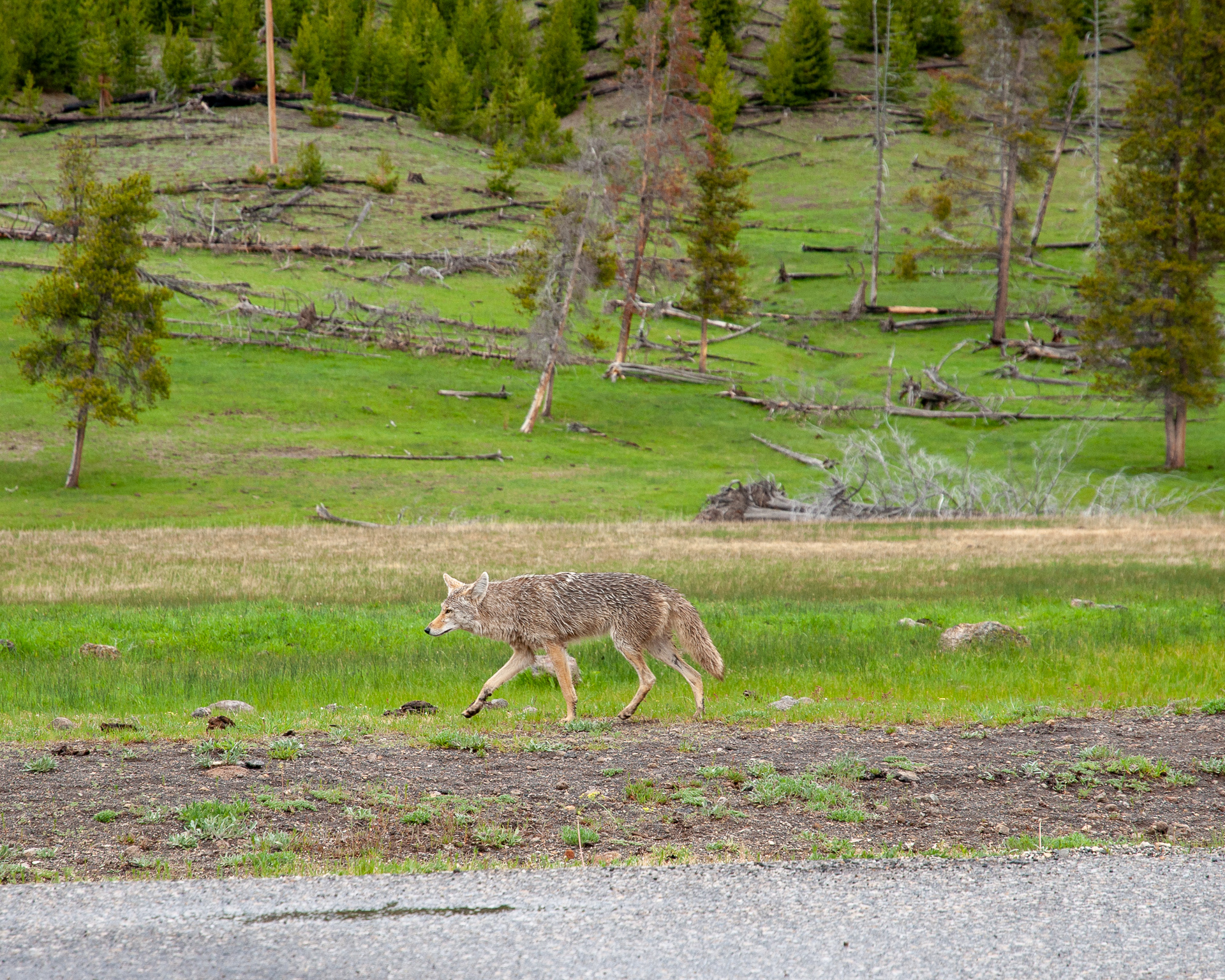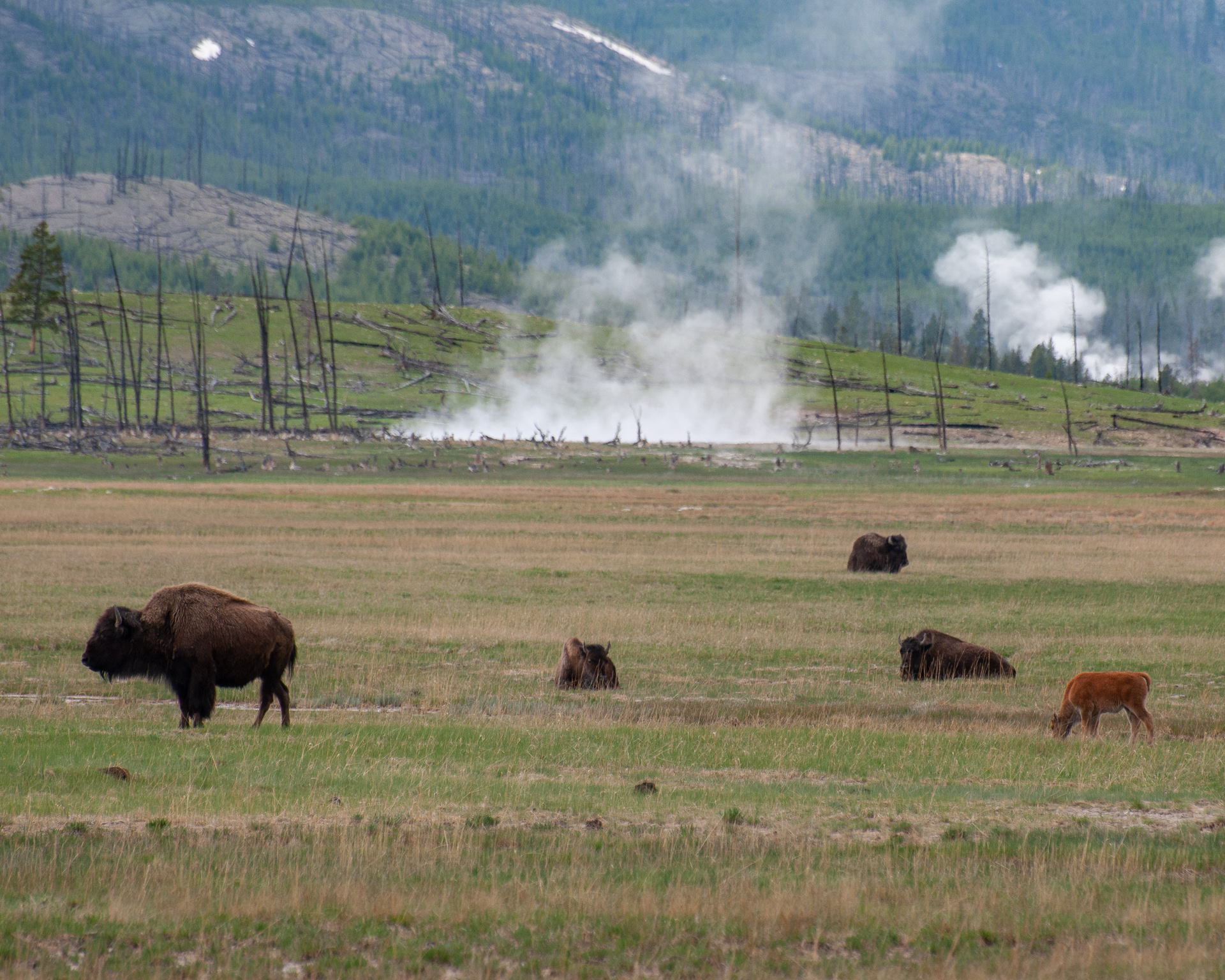 Weiter Richtung Old Faithfull gab es dann wieder Bisons zu besichtigen. Ein Examplar lief gemütlich durch das Gras auf der anderen Seite des Flusses, ich versuchte auf dem Asphalt nebenherzulaufen in der Hoffnung auf ein gutes Foto. So ein Bison sieht langsam aus, aber es war schwer mit ihm Schritt zu halten.