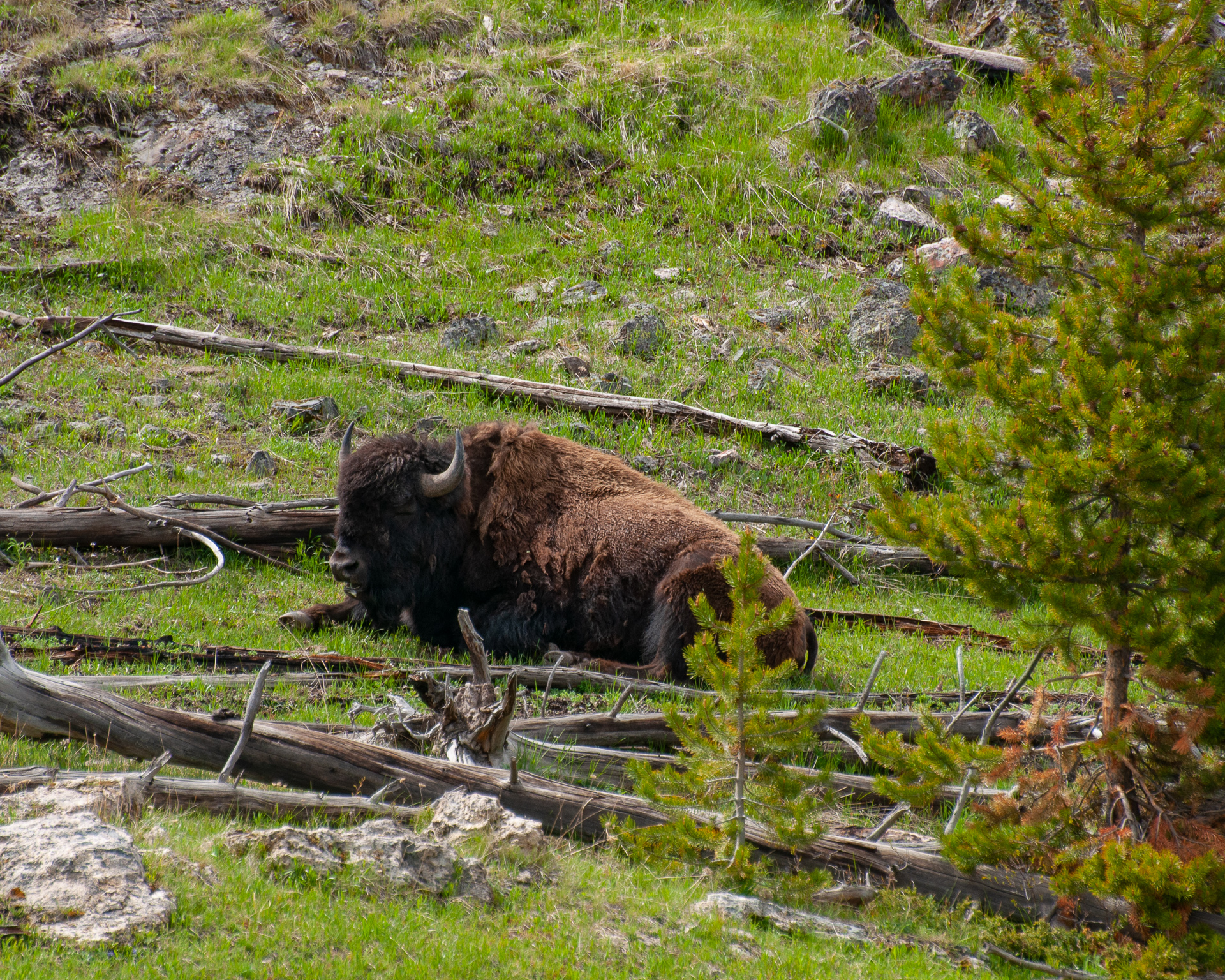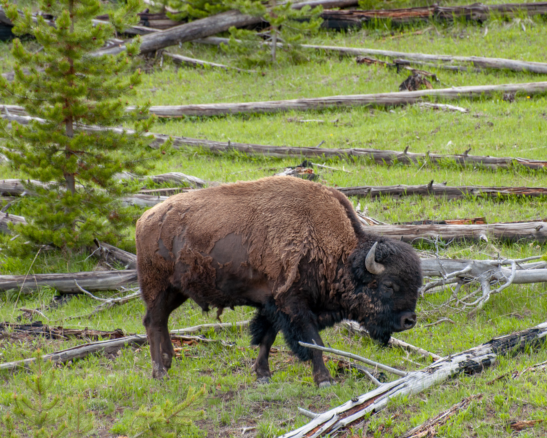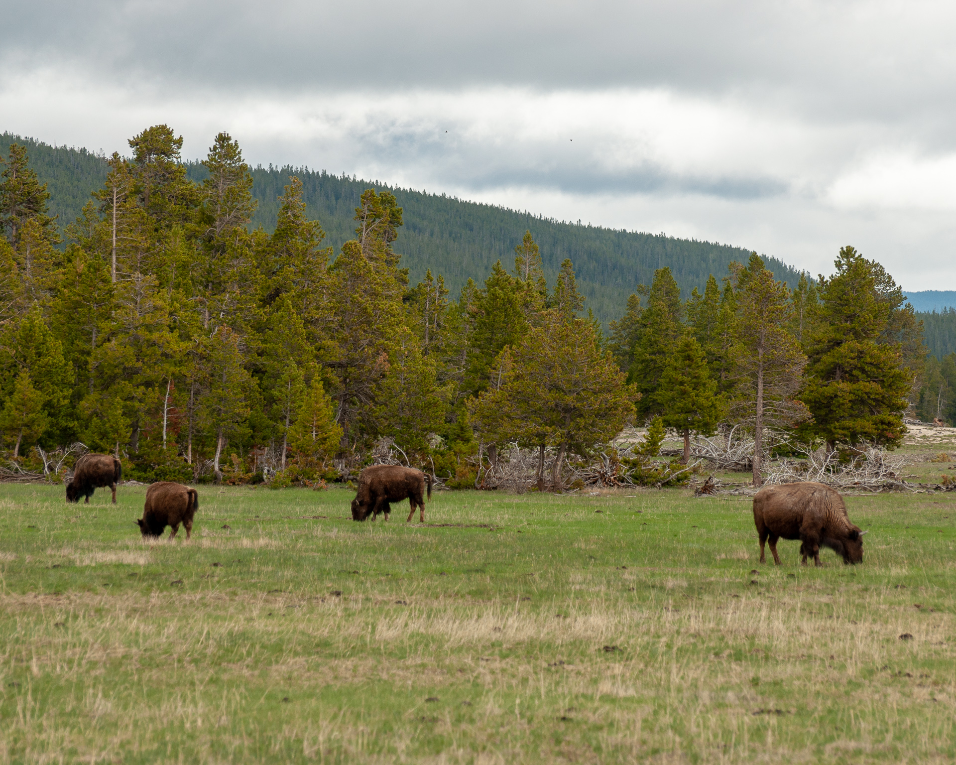 Nachdem wir das Upper Geyser Bassin ausgiebig durchwandert hatten entschieden wir uns zur Fahrt nach West Yellowstone zum Shopping. Den General Store im Grant Village wollten wir nicht nochmal besuchen. Die Fahrt ging recht langsam, da das Sightseeing natürlich im Vordergrund stand. Auf den offenen Flächen entlang der Straße gab es Bisons zu sehen.