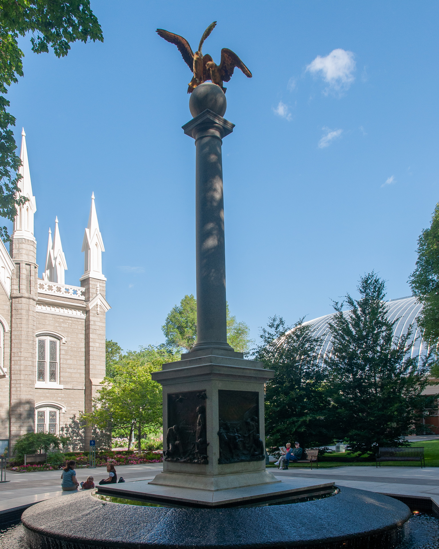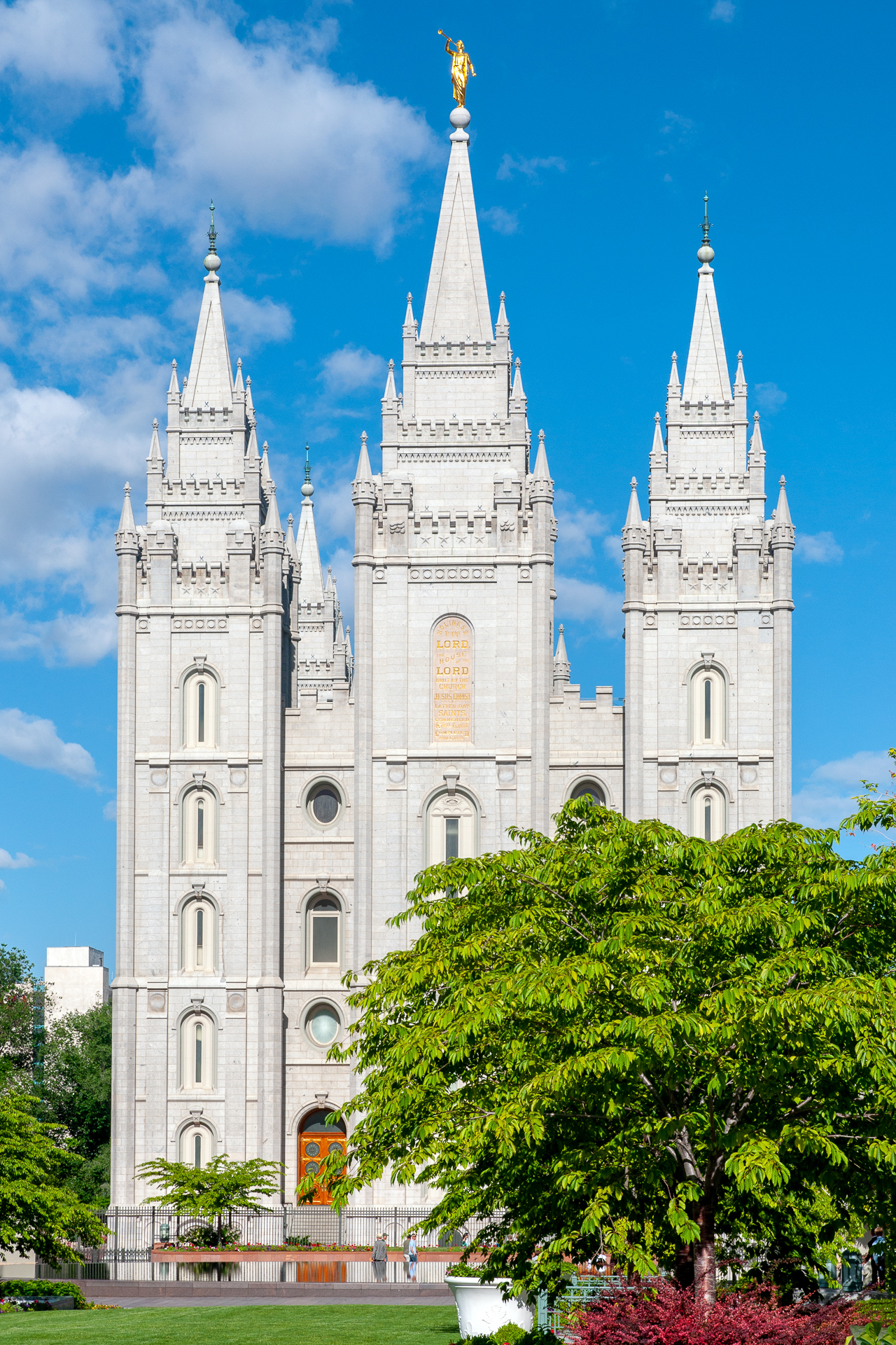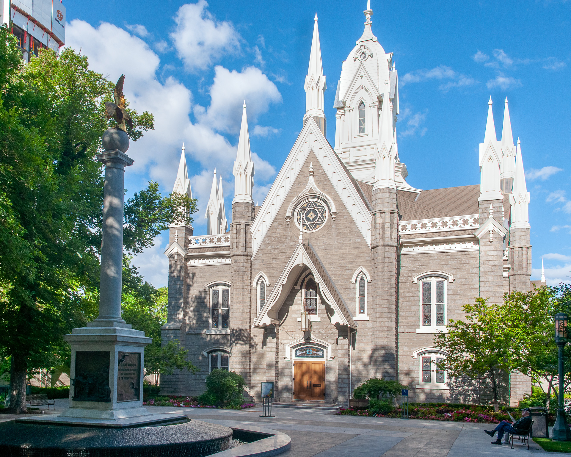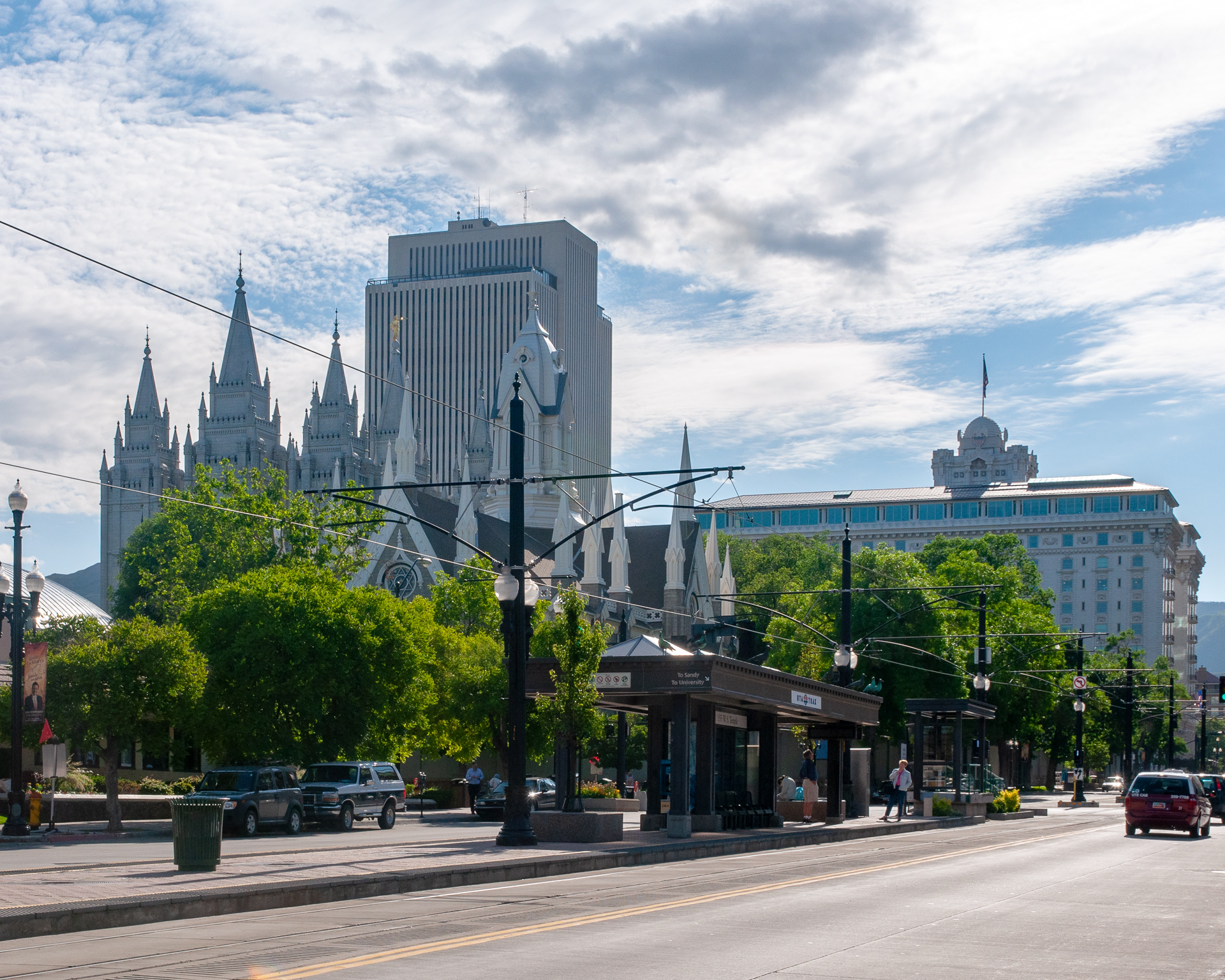 Heute war mal wieder ein langer Fahrtag vorgesehen, der aber auch ein paar Programmpunkte beinhalten sollte. Wir machten uns daher recht früh auf die Socken, nach einem sehr guten Frühstück im Hotel zunächst mal die paar Meilen bis Salt Lake City. Es war noch vor 9 und daher sehr ruhig, wir fanden also problemlos einen Parkplatz auf der South Temple Street einen Block vor dem Tempelbezirk. Selbst die Mormonen waren noch nicht auf Besucher eingestellt, die Visitor Center waren noch geschlossen. Wir durchliefen den Tempelbezirk. Richtig beeindruckt haben mich die etwas kitschigen Bauten und Skulpturen/Denkmäler nicht. Auf der einen Seite die Tempel, auf der anderen Wall Street Atmosphäre mit der Hauptverwaltung der Kirche.