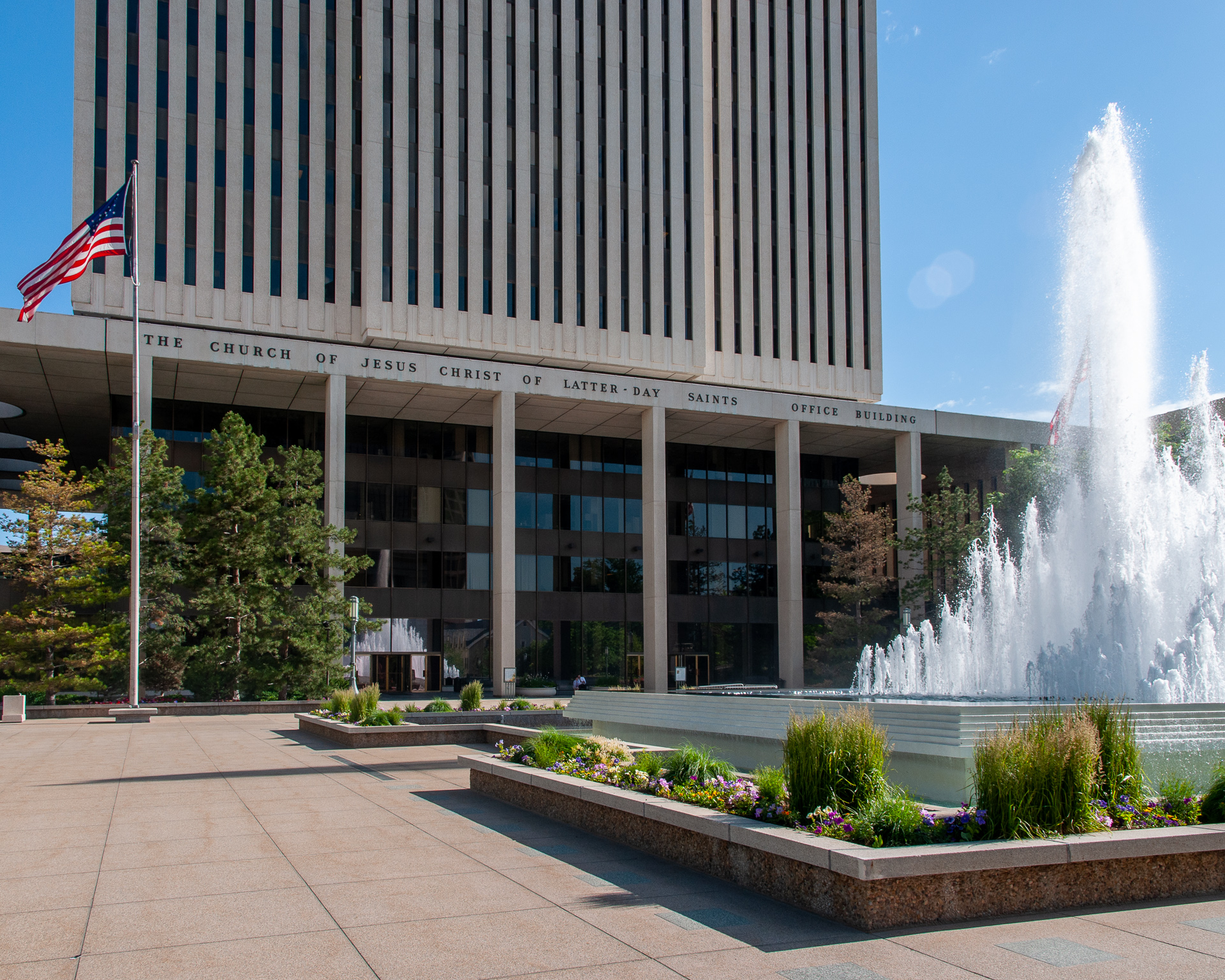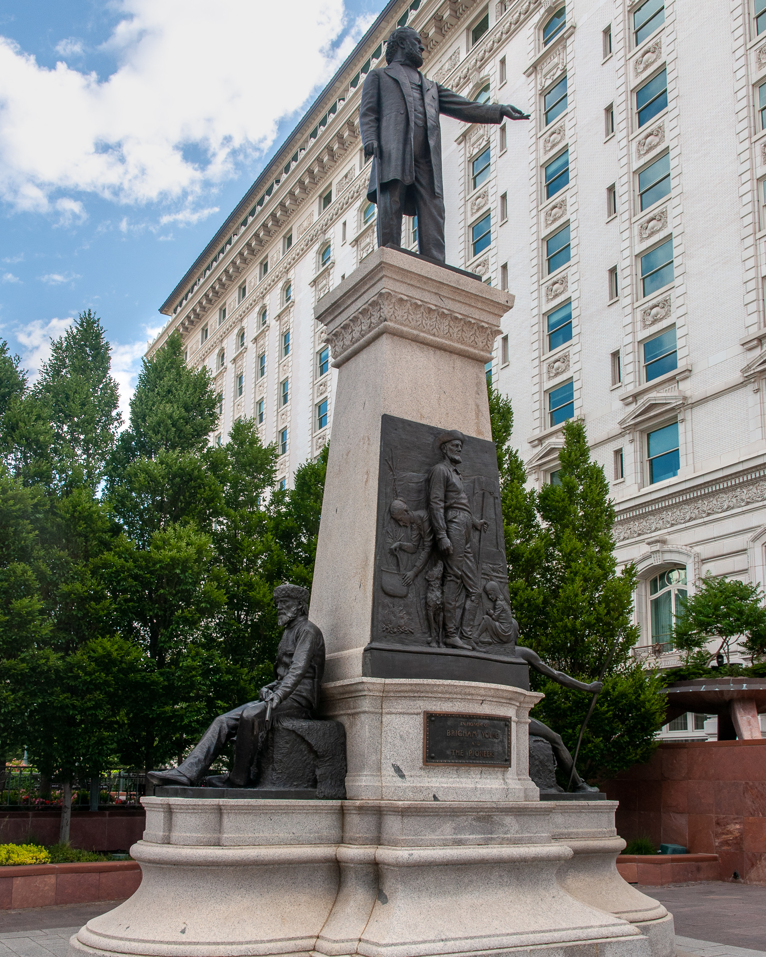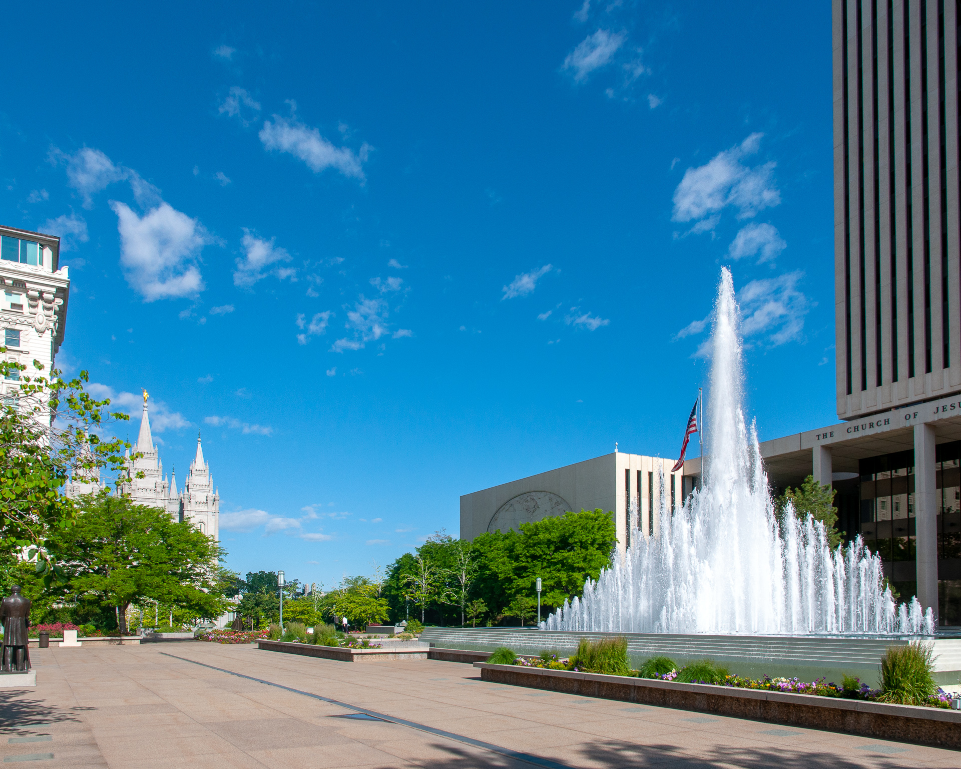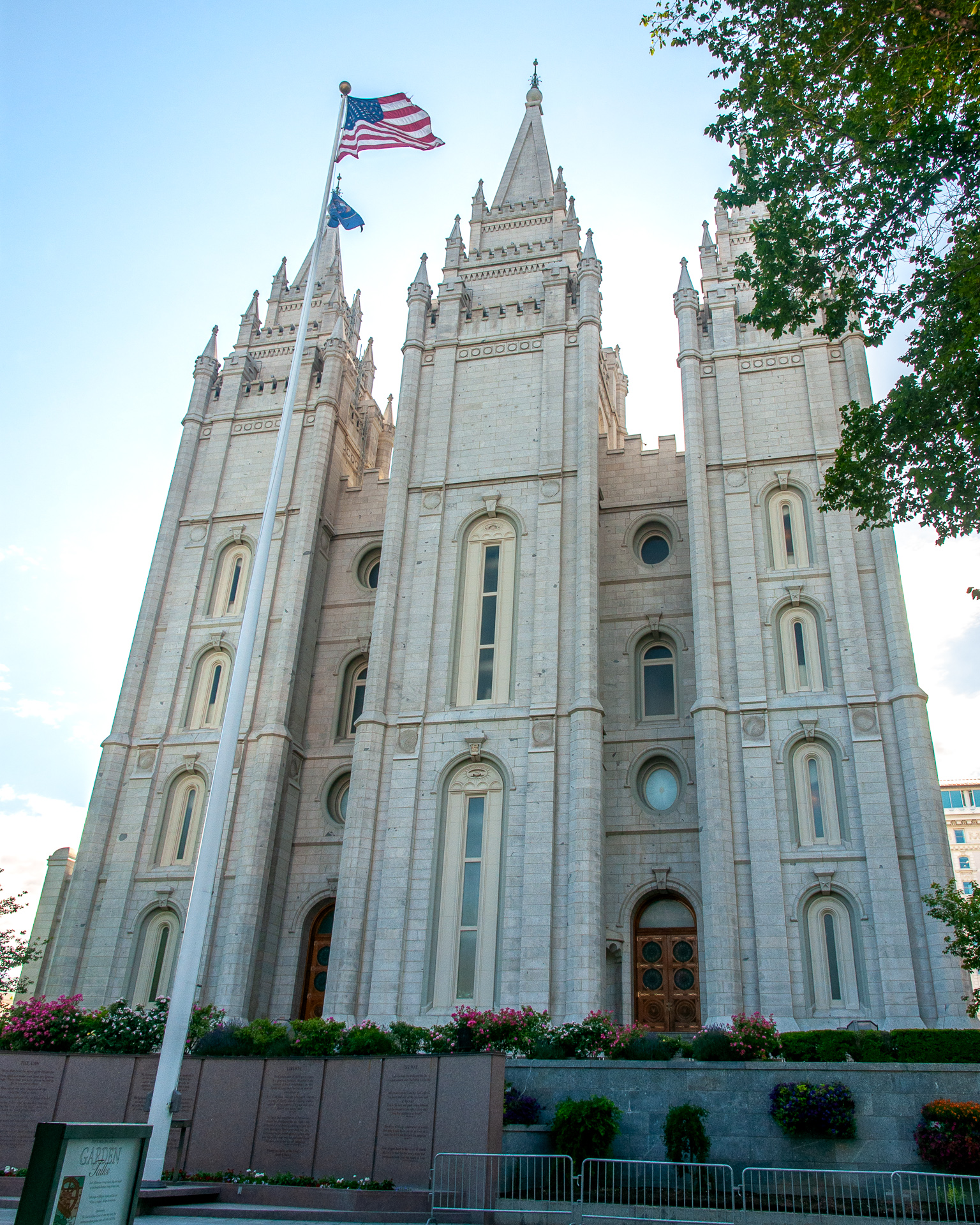 Heute war mal wieder ein langer Fahrtag vorgesehen, der aber auch ein paar Programmpunkte beinhalten sollte. Wir machten uns daher recht früh auf die Socken, nach einem sehr guten Frühstück im Hotel zunächst mal die paar Meilen bis Salt Lake City. Es war noch vor 9 und daher sehr ruhig, wir fanden also problemlos einen Parkplatz auf der South Temple Street einen Block vor dem Tempelbezirk. Selbst die Mormonen waren noch nicht auf Besucher eingestellt, die Visitor Center waren noch geschlossen. Wir durchliefen den Tempelbezirk. Richtig beeindruckt haben mich die etwas kitschigen Bauten und Skulpturen/Denkmäler nicht. Auf der einen Seite die Tempel, auf der anderen Wall Street Atmosphäre mit der Hauptverwaltung der Kirche.
