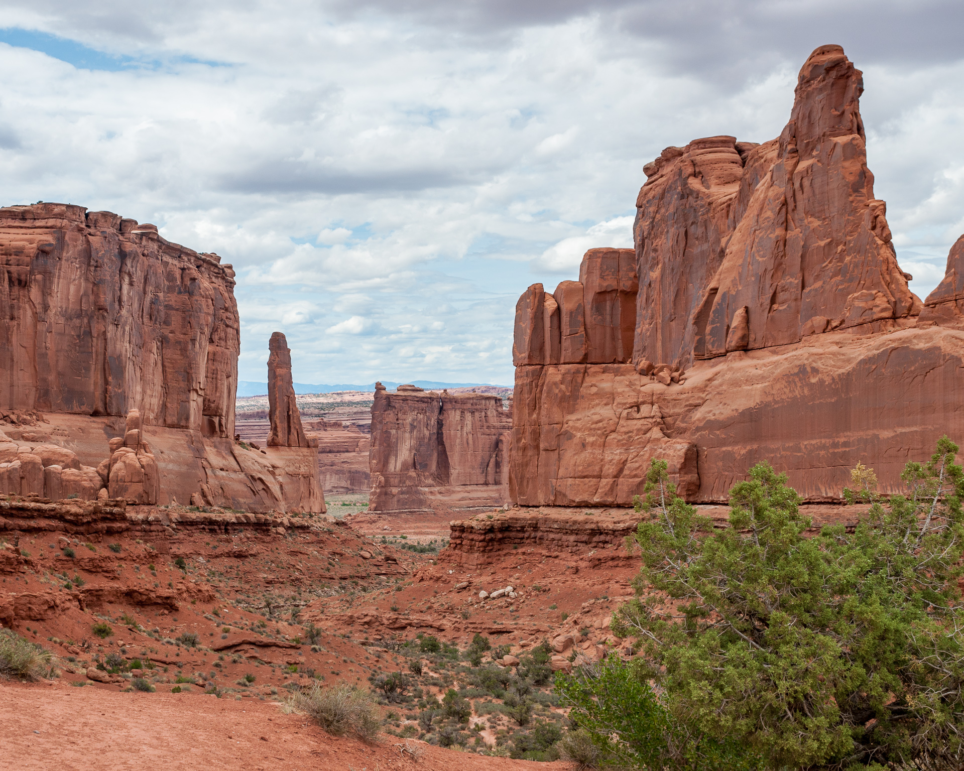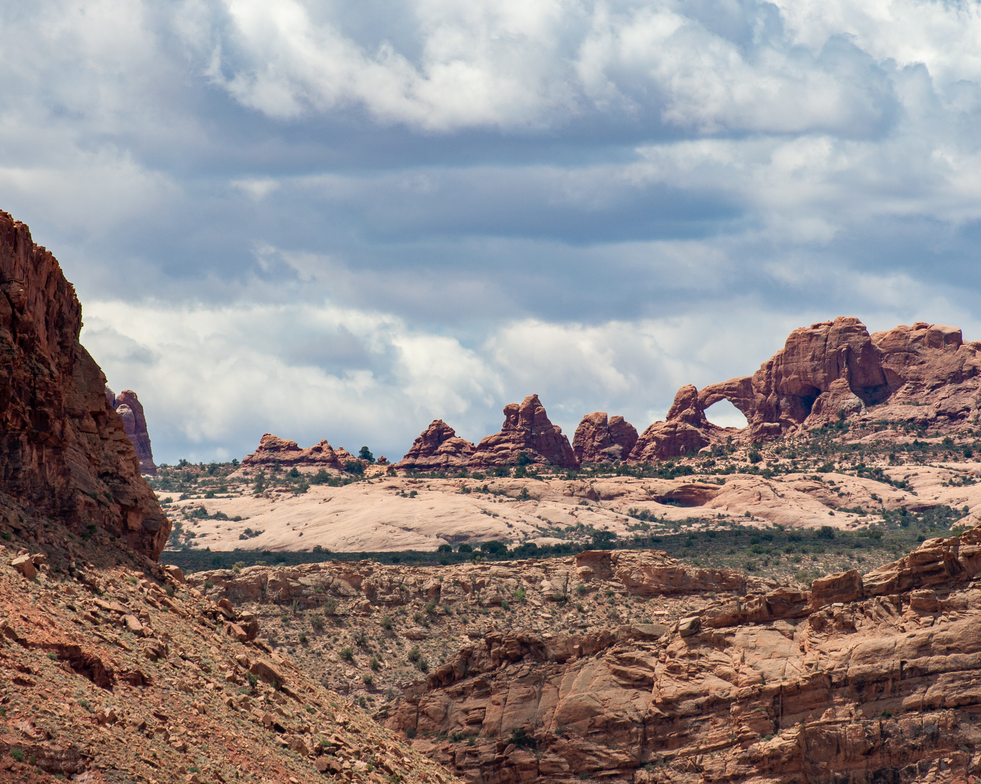 Wir fahren langsam zurück Richtung Eingang und machen zunächst mal ein paar Fotostops, u.a. am Blick auf die Fiery Furnace. Irgendwo fanden wir auch einen Punkt an der Straße mit Ausblick auf den Delicate Arch. Photographisch ist das nicht so ergiebig: Bei einem 300mm Objektiv ist ein Stativ nicht nur zum Angeben da, sondern dann und wann wirklich nötig. Hier zum Beispiel, es wehte ein starker Wind und so richtig scharf ist das Foto daher nicht. Außerdem verfälscht der Dunst die Farben.