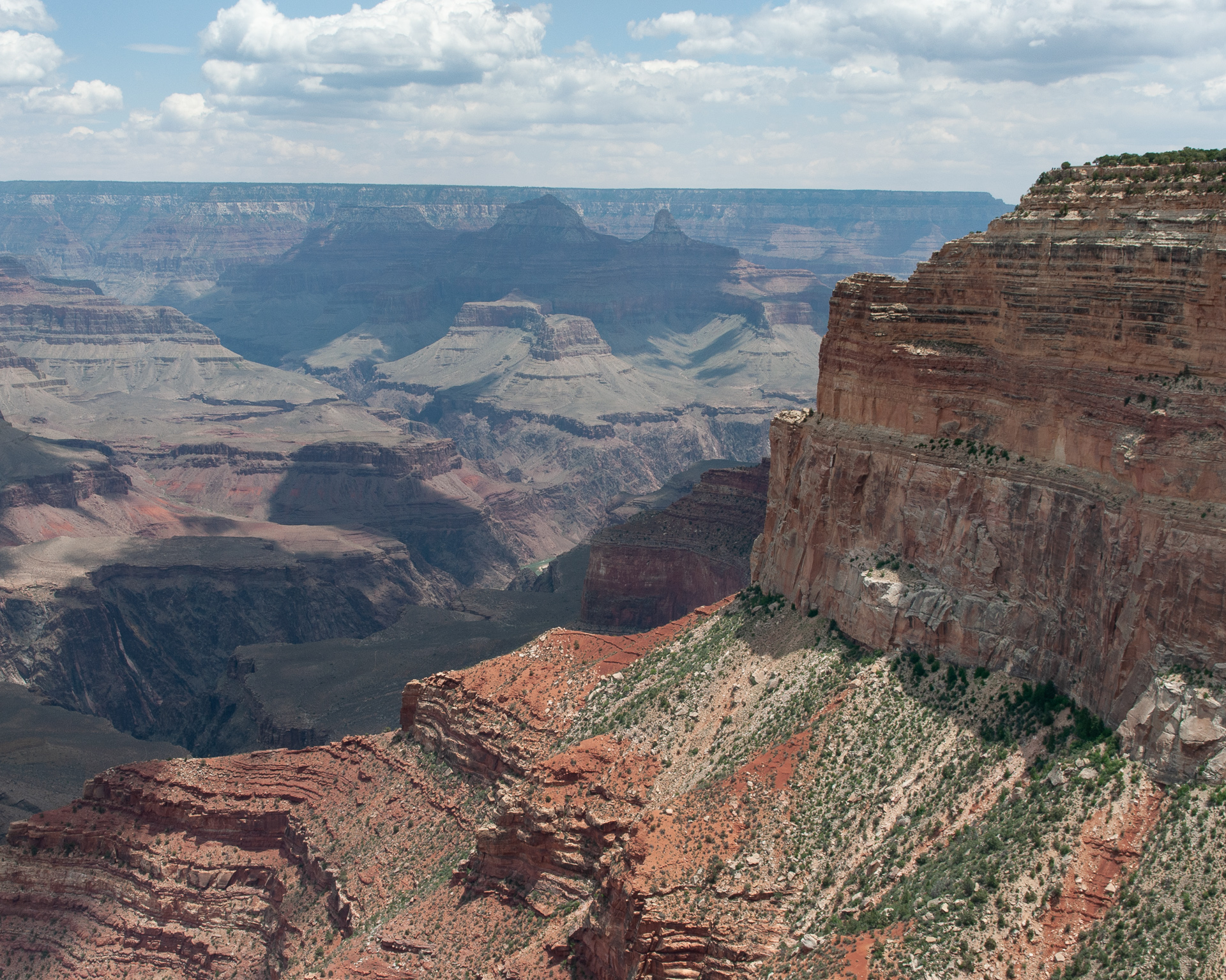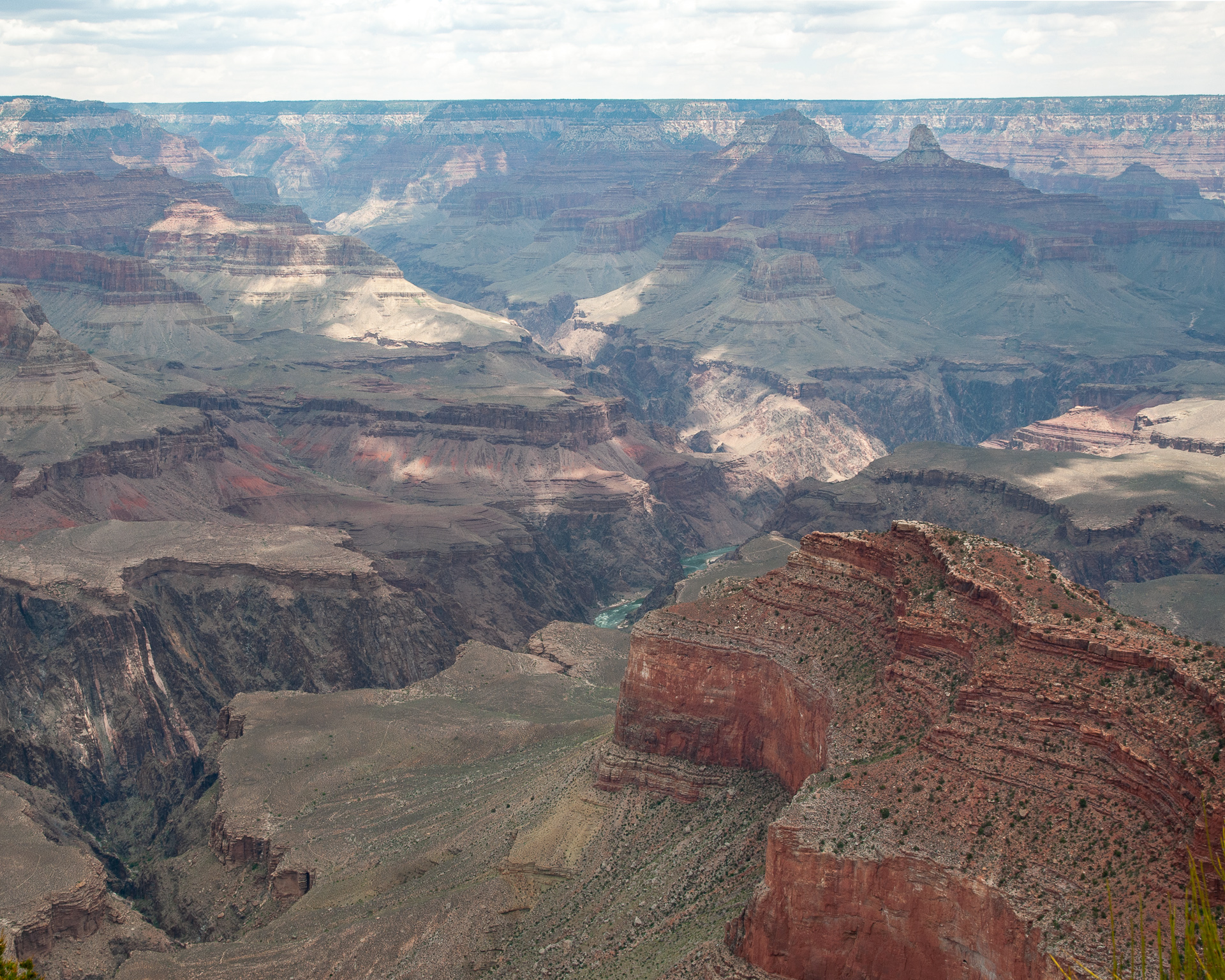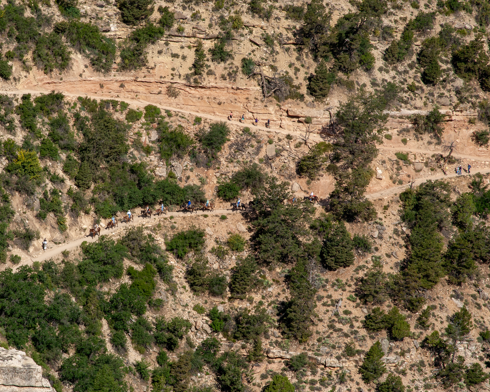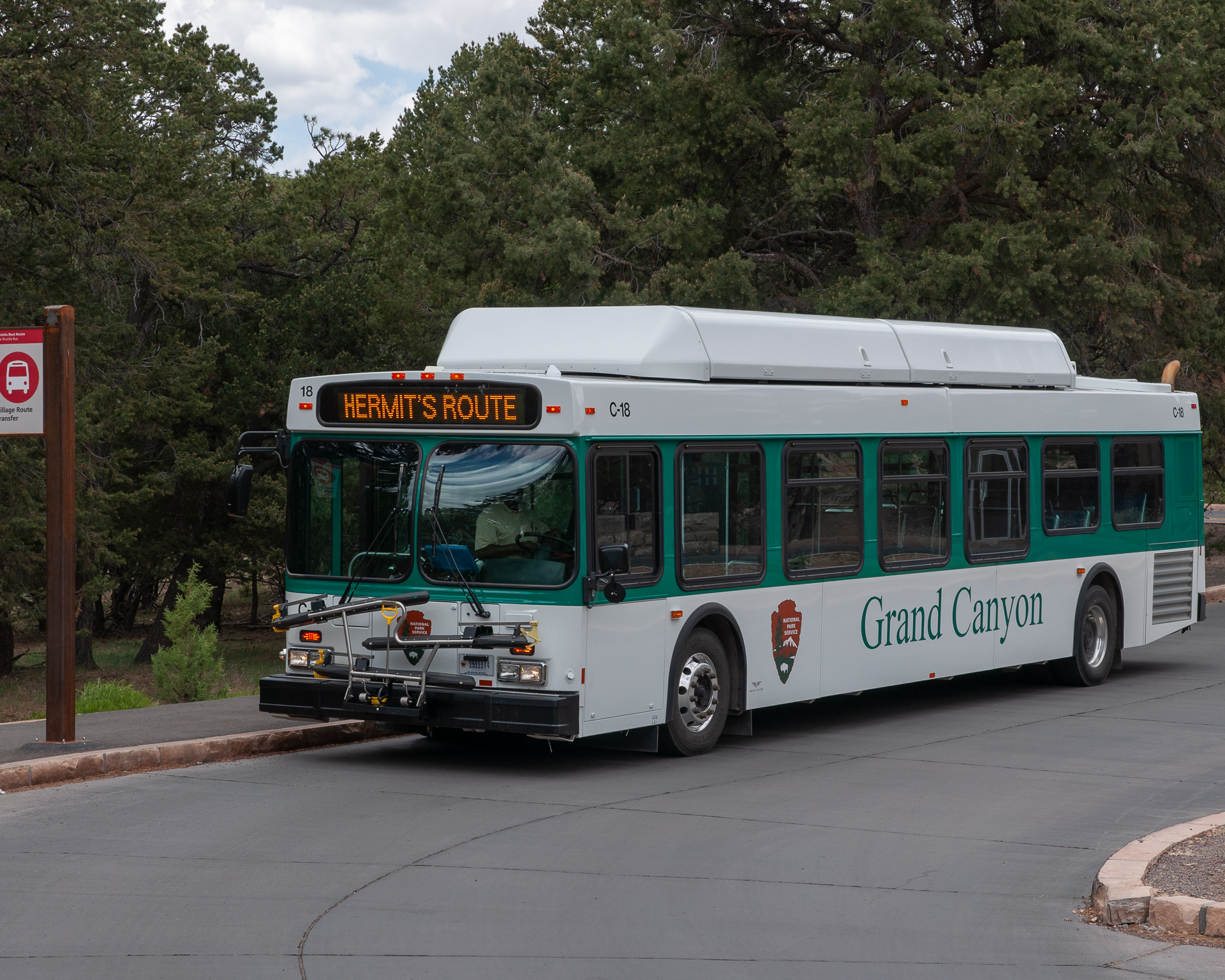 Frühstück ist bei Xanterra im Zimmerpreis nicht eingeschlossen, und ins Restaurant wollten wir auch nicht, also startete der Tag mit Kafee und „Danish Pastries“ in der Kneipe der Bright Angel Lodge, für alle die kein volles Frühstück wollen gibt es dort ein paar Kleinigkeiten. Nach dem Auschecken liefen wir entlang des Rims Richtung Westen (Hermits Rest). Weit kamen wir jedoch nicht, irgendwo kurz nach der Abfahrtstelle der Shuttlebusse war der Weg gesperrt, wir mussten also zurück zur Haltestelle und Warten.