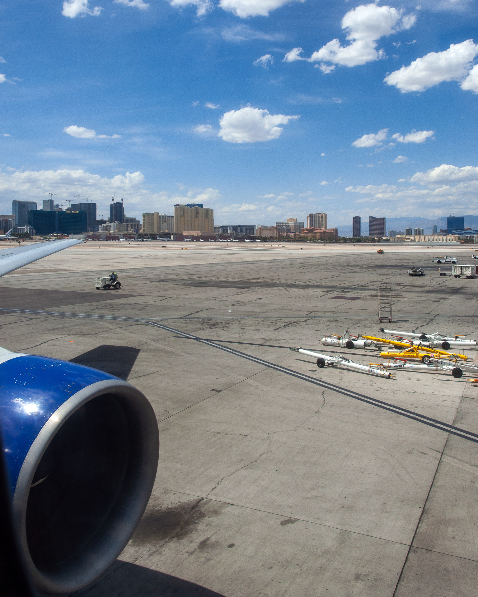 Es kam und kam keine Crew, schließlich erschien der Purser und stand zunächst 10 Minuten blöd rum, bevor er an Bord ging. Irgendwann trudelte der Rest der Kabinencrew ein, und kurz vor der Abflugzeit ließen sich dann auch die Piloten blicken. Abflug war mit 30 Minuten Verspätung, die blieb bis Frankfurt und keiner an Bord verlor in den Ansagen ein Wort darüber. Auf dem Hinflug fand ich den Sitz gar nicht schlecht, aber was es hier gab war völlig unmöglich. Dank Klettband Schnellverschlüssen war die Konstruktion gut sichtbar, eine Metallplatte und darauf eineinhalb cm Schaumstoff. Mir tat bereits in Las Vegas der Hintern weh, zum Glück gab es einigermassen gute Kissen, damit hab ich die Polsterung ein bisschen verbessert.