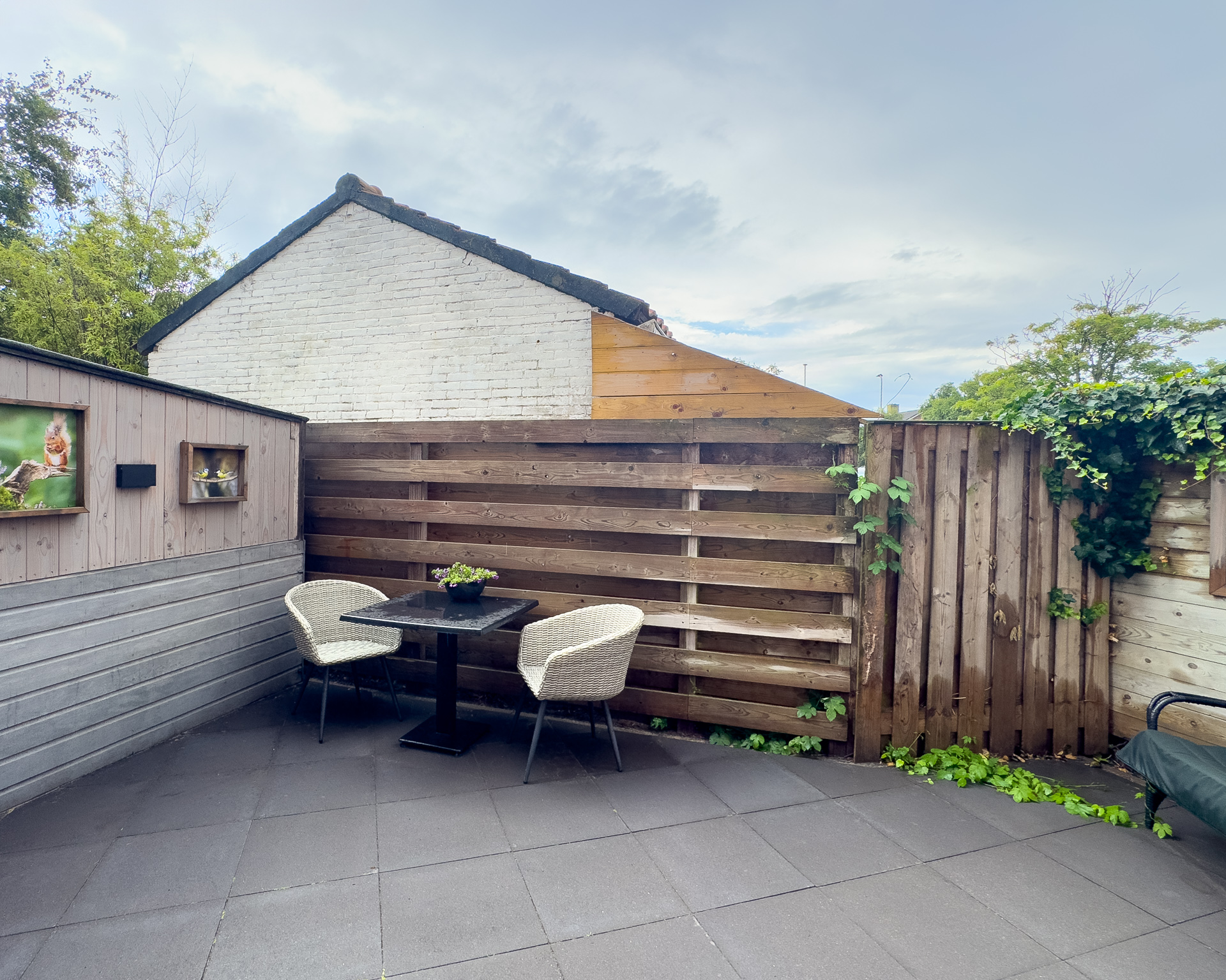 Die Terrasse, nun ja, ich hab das Ganze „My own private Gefängnishof“ getauft: