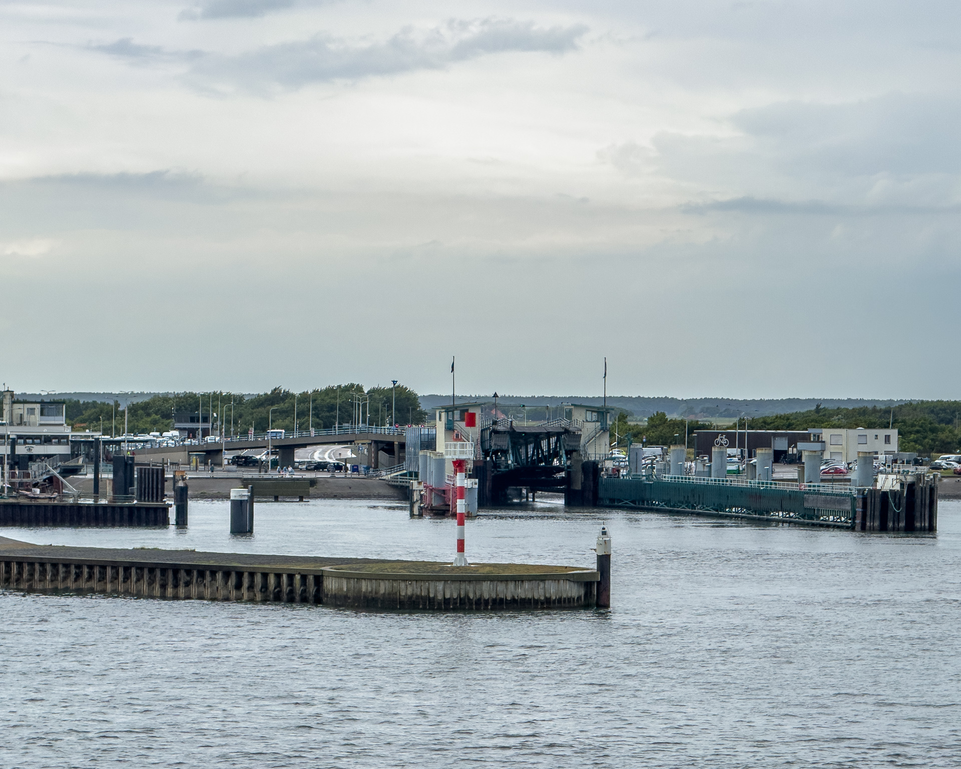 Mit einer Pause an der Raststätte Halfmaat nördlich Ijmuiden dauert es ziemlich genau fünf Stunden, bis wir um 15:20 Uhr in Den Helder am Fähranlager ankommen. Die Fährüberfahrt ist gut organisiert und es geht alles rasend schnell. Da wir das Ticket Online gebucht hatten, öffnet sich die Schranke an der Einfahrt zum Parkplatz automatisch und wir müssen auch nur wenige Minuten warten, um auf die Fähre fahren zu können. Um 15:30 beginnt pünktlich die kurze Überfahrt.