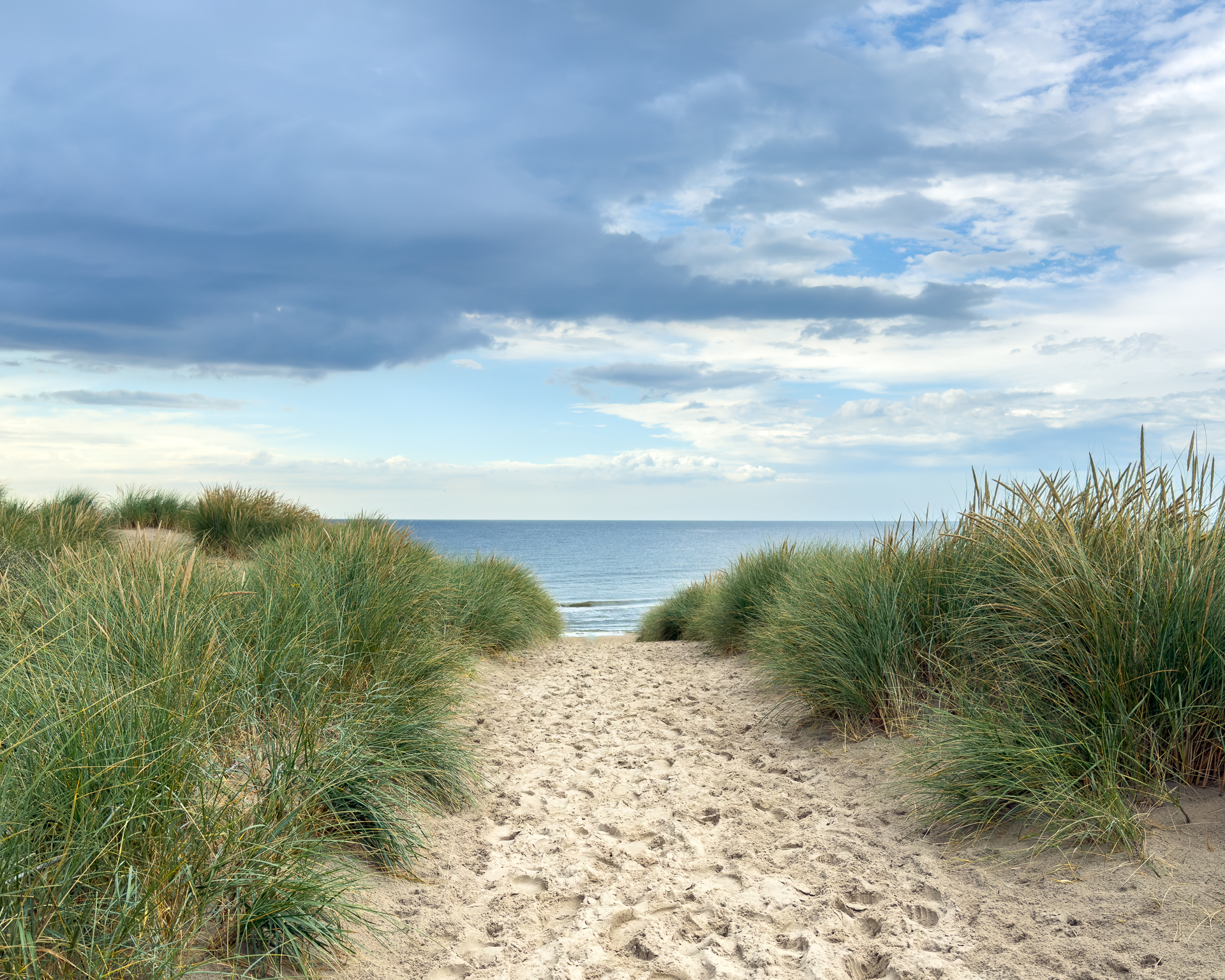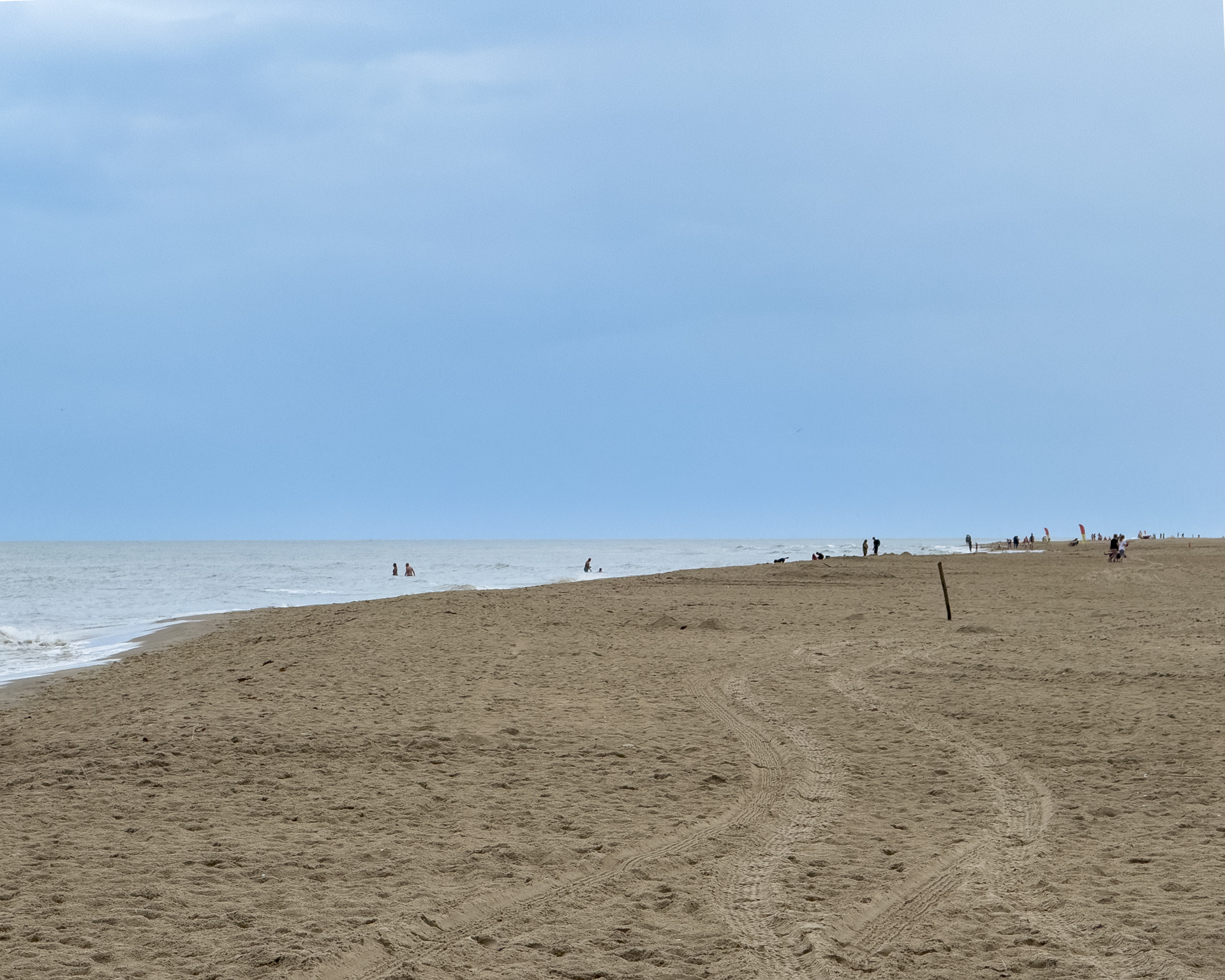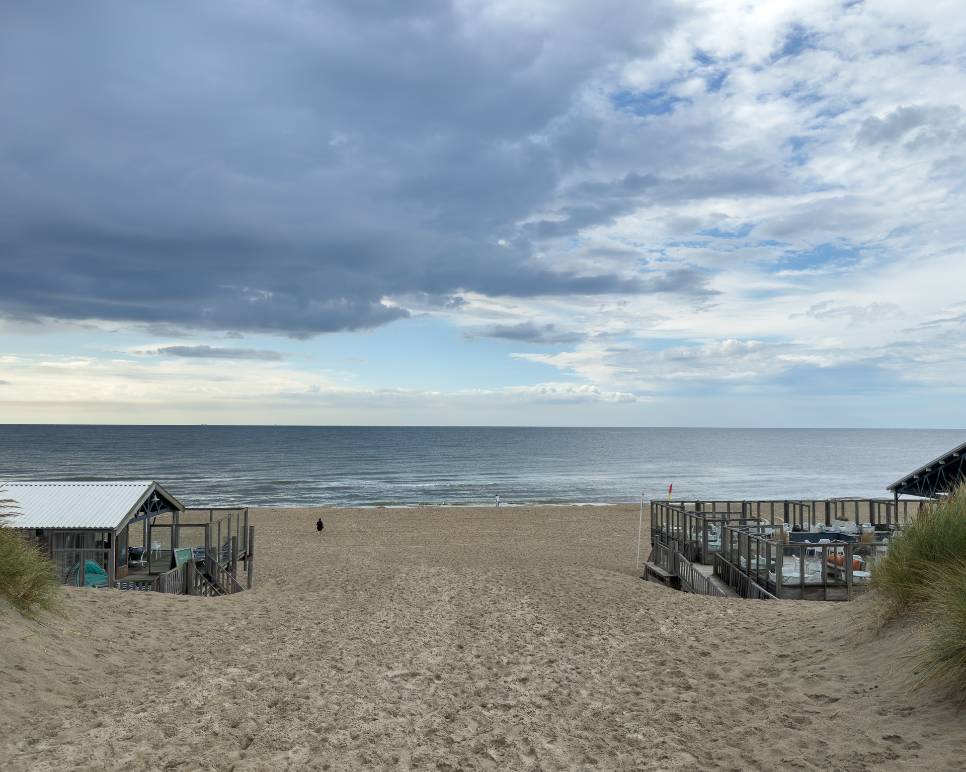 Aufgrund der Regenschauer am Horizont laufen wir nicht sehr weit am Strand entlang, sondern nur einen guten Kilometer südwärts bis zum „Pfahl 19“. Da gibt es wieder einen Übergang über die Dünen und wir schlagen die Richtung zurück ins Dorf ein. Zwei Fotos vom Strandzugang am Paal 19: