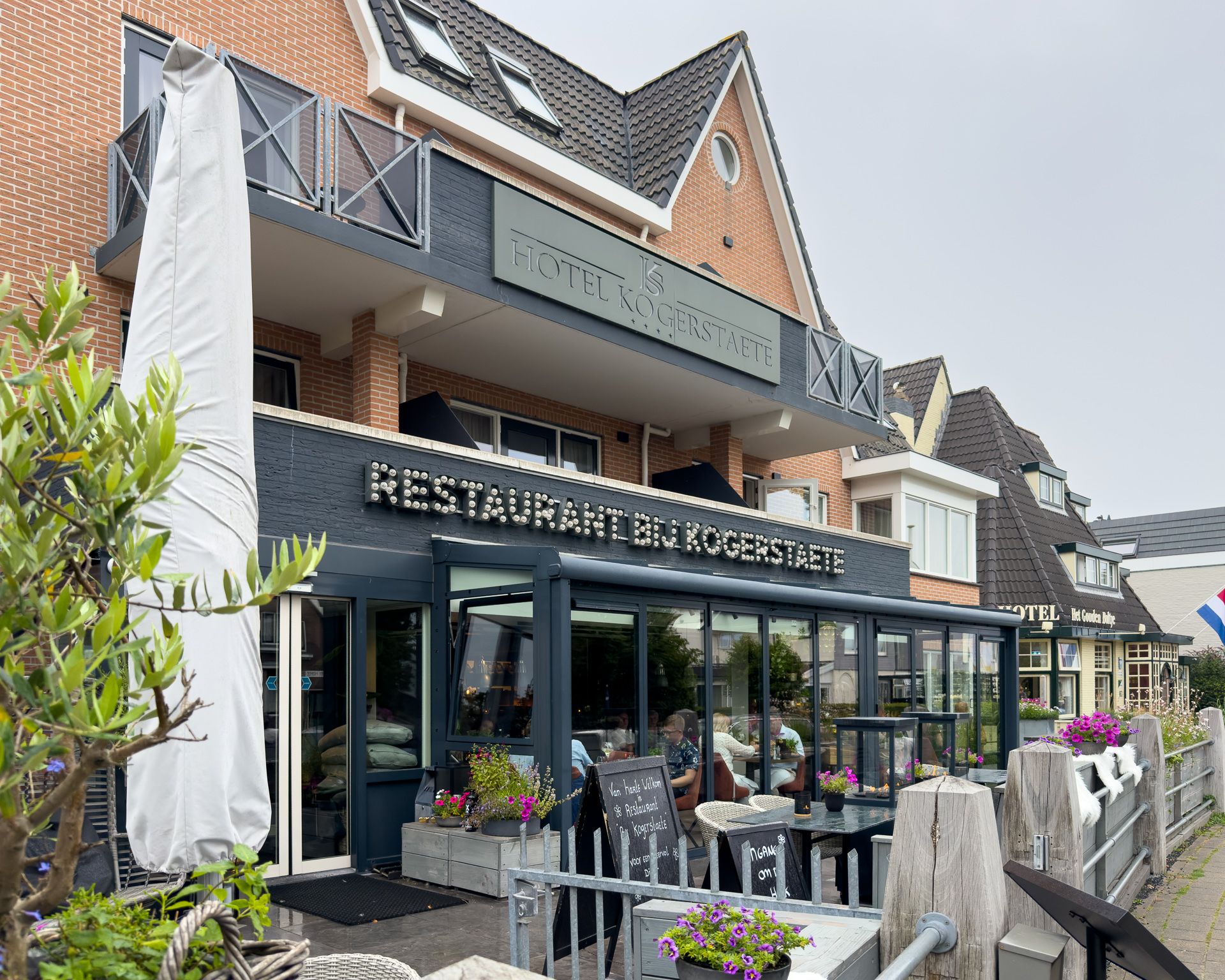 Die letzte Etappe der Fahrt, über die Insel nach De Koog, dauert keine 20 Minuten mehr und kurz nach 16 Uhr erreichen wir endlich unser Hotel. Gebucht haben wir im Hotel „Kogerstaete“, das ist recht gut mit ein paar „Aber“. Zum Beispiel liegt unser Zimmers direkt neben der Küche, und während der Abendessenzeit dringt immer ein bisschen Lärm von der Küche in unser Zimmer, und beim Verlassen des Zimmers mussten wir aufpassen, nicht von einem Kellner mit drei Tellern in der Hand umgerannt zu werden.