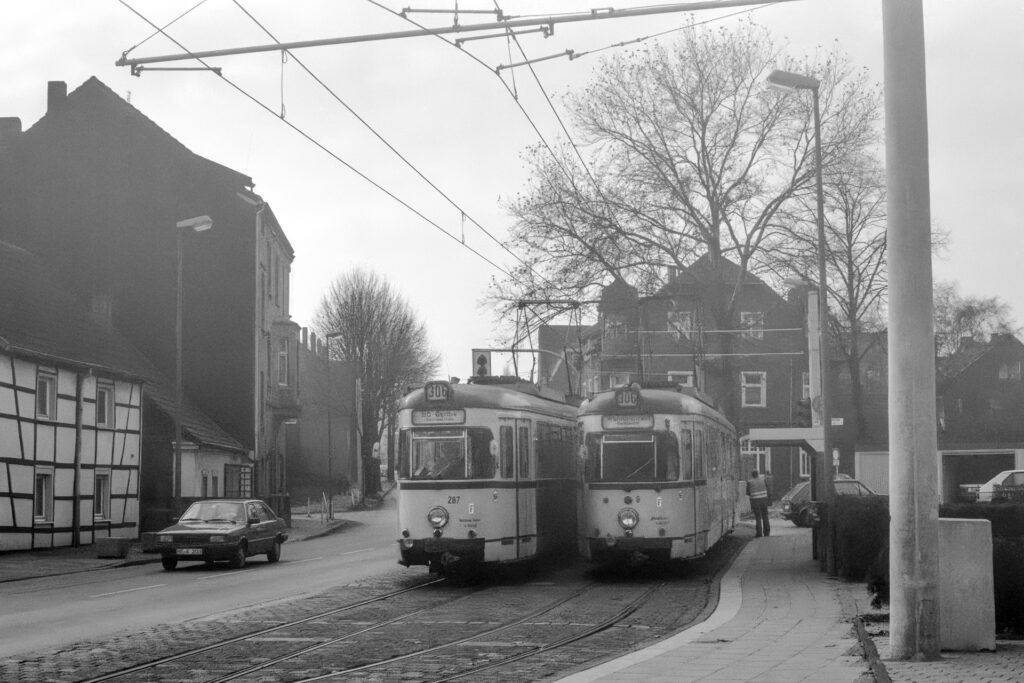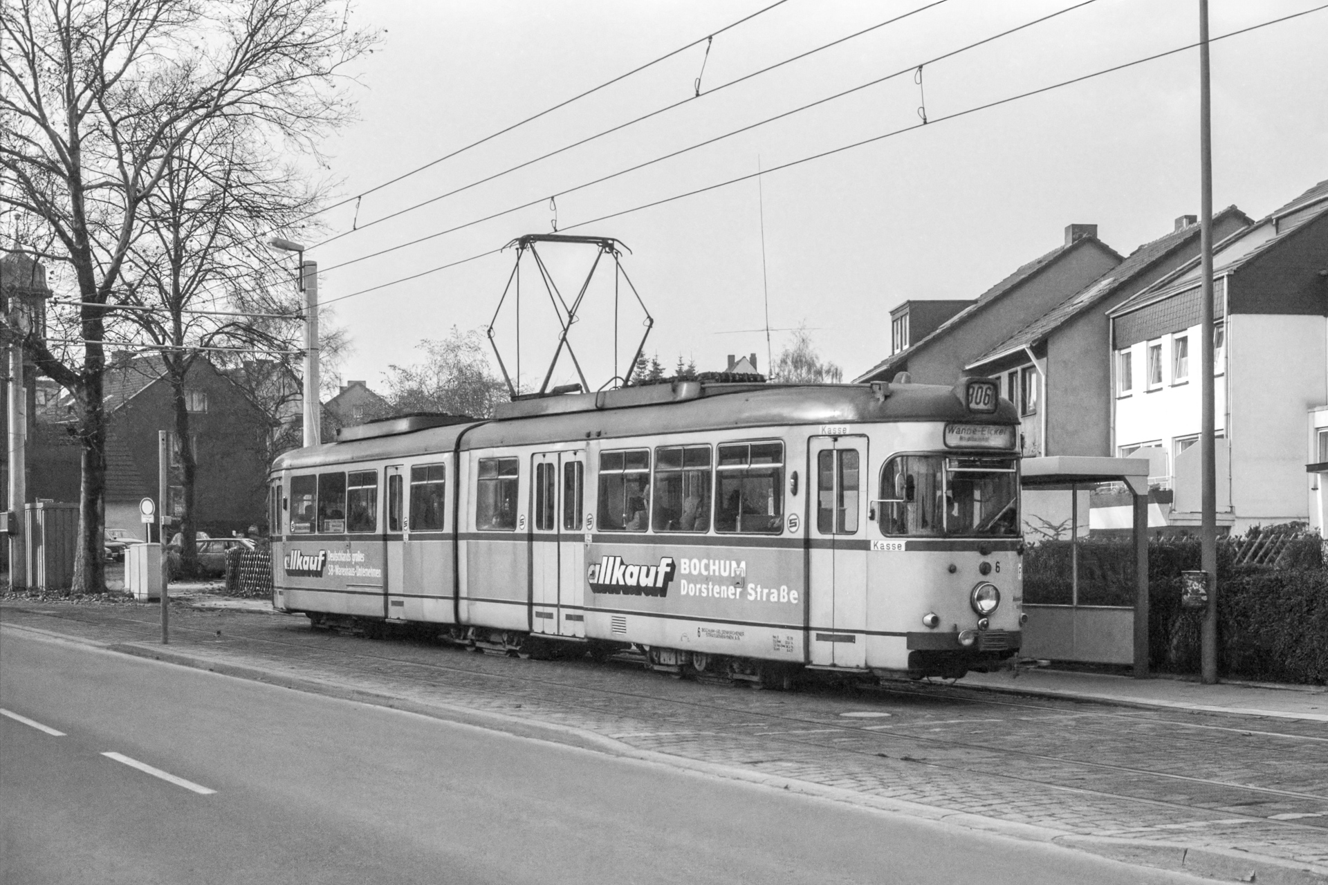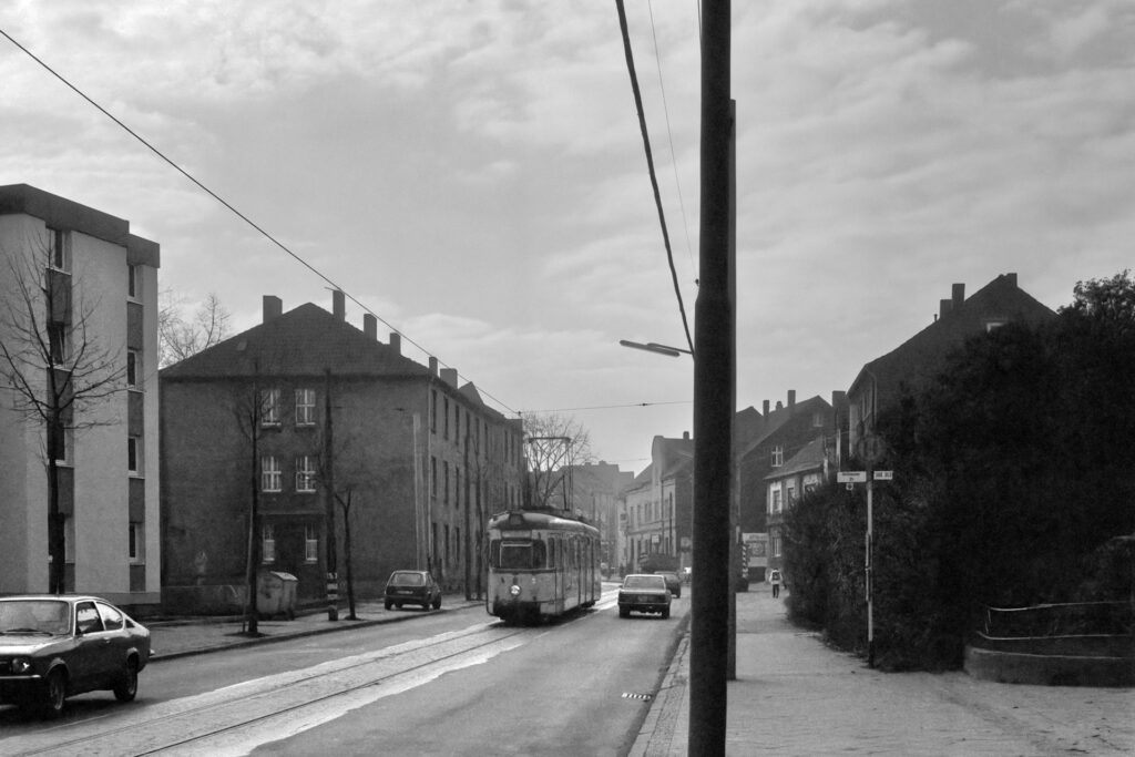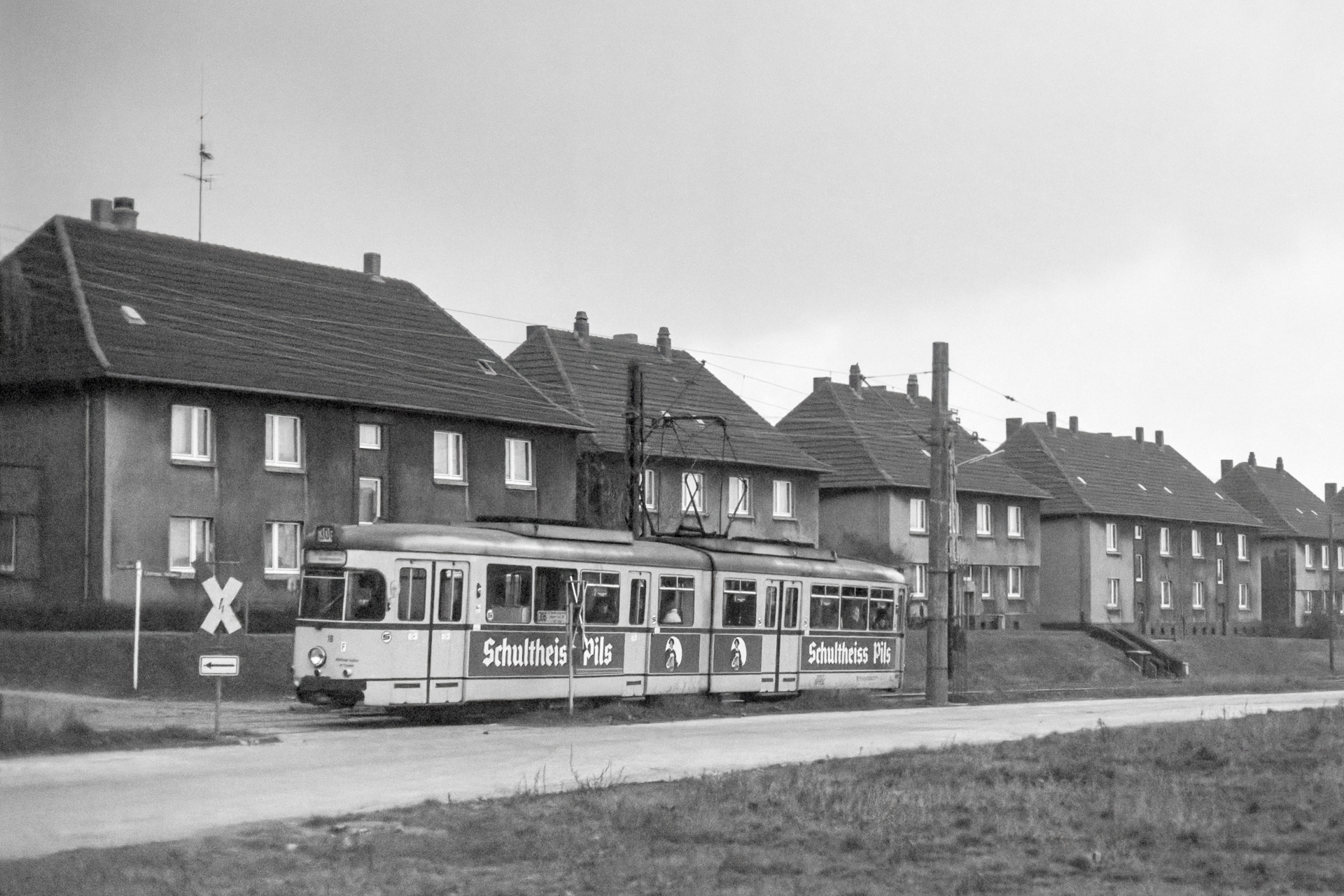 An einem Novembertag (vermutlich dem 16.) im Jahr 1981 habe ich mich an den Gleisen in Bochumer Stadtteil Gerthe, an der Stadtgrenze zu Castrop-Rauxel gelegen, wiedergefunden. Wenn mich das Gedächtnis nicht trügt (was allerdings wahrscheinlich ist), wollte ich die Bahnen vor den noch stehenden „Zechenhäusern“ (ich hab keine Ahnung wer sie wirklich erbaut hat) am Castroper Hellweg fotografieren.