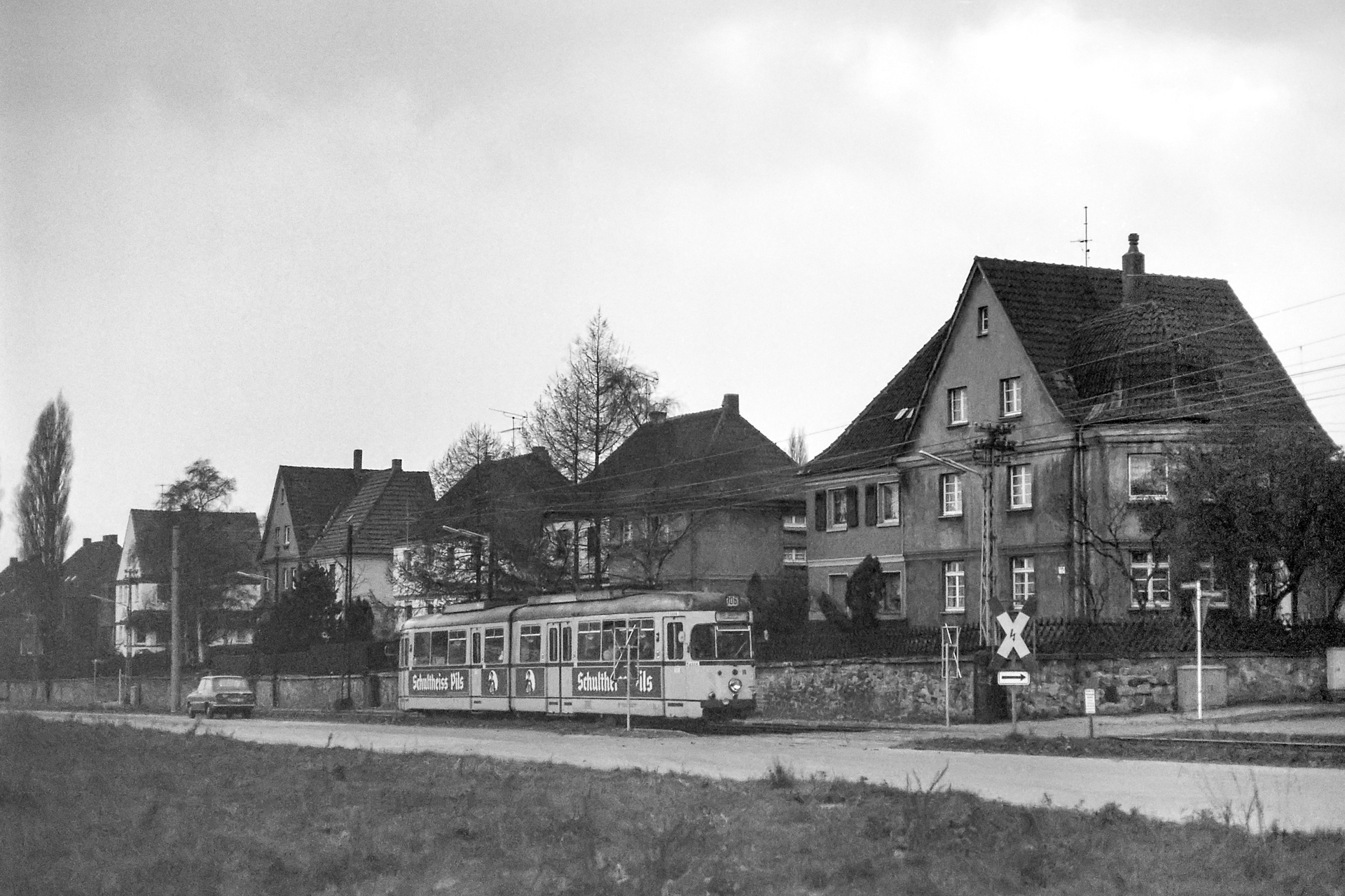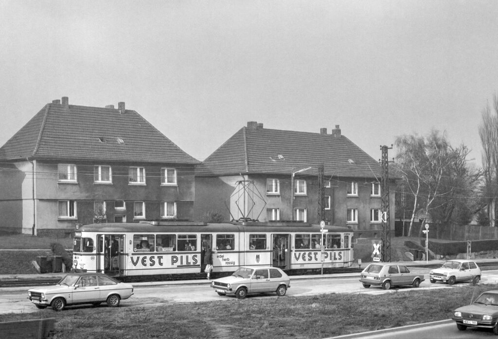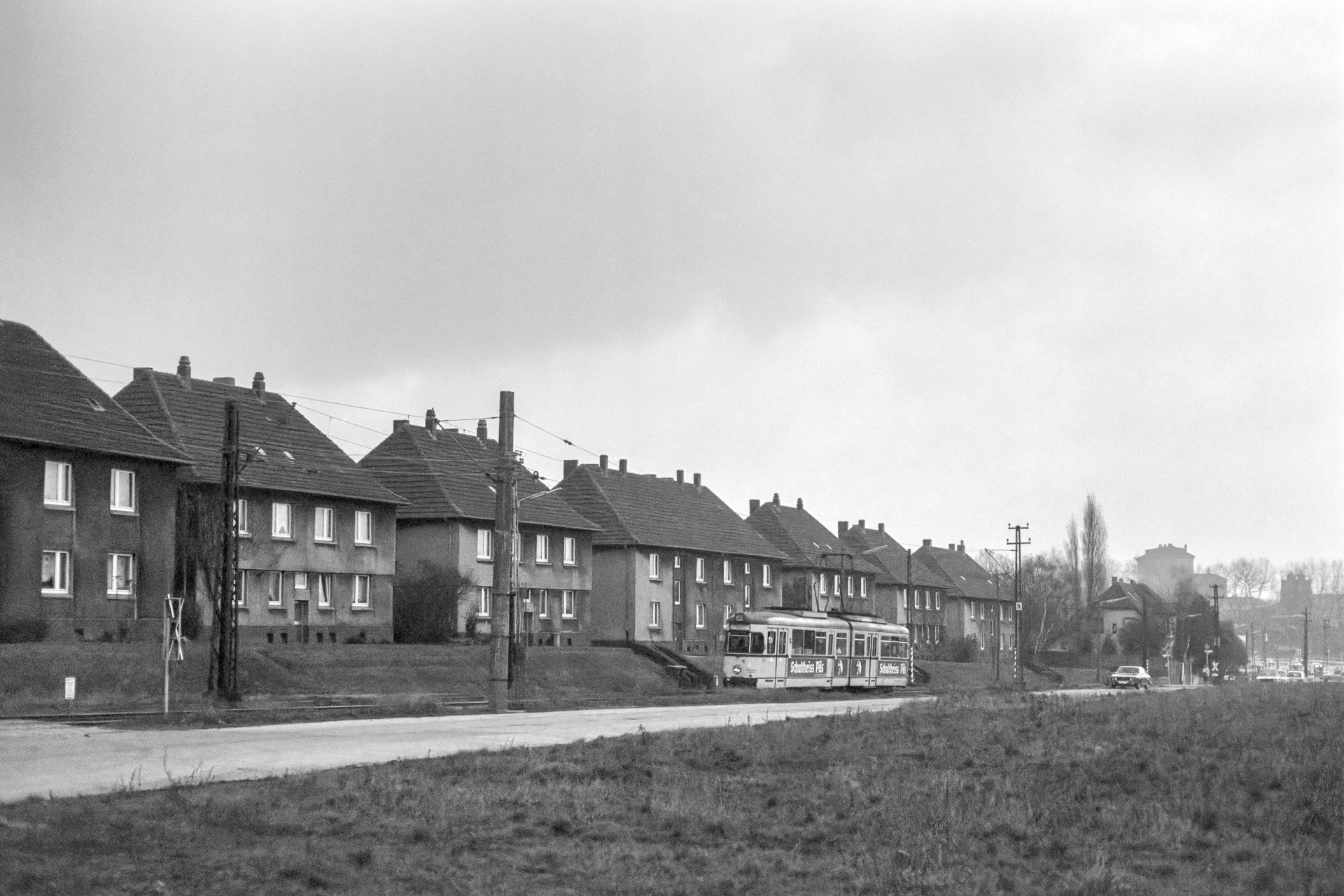 Vermutlich einen Tag später, am 17., war ich nochmal in Gerthe bzw. etwas südlich davon, in Hiltrop. Hier, etwas südlich des ehemaligen Betriebshofes Gerthe, gibt es entlang des Castroper Hellwegs ebenfalls noch Häuser aus den 30er Jahren, die sogar modernisiert wurden und heute noch stehen. Die Gesamtsituation hat sich allerdings stark verändert. Damals fuhr die Straßenbahn auf einem besonderen Bahnkörper neben der Straße, seit 1984 ist die Straße vierspurig mit den Gleisen der Straßenbahn in der Mitte.
