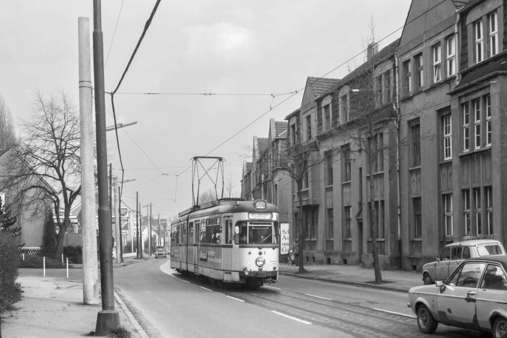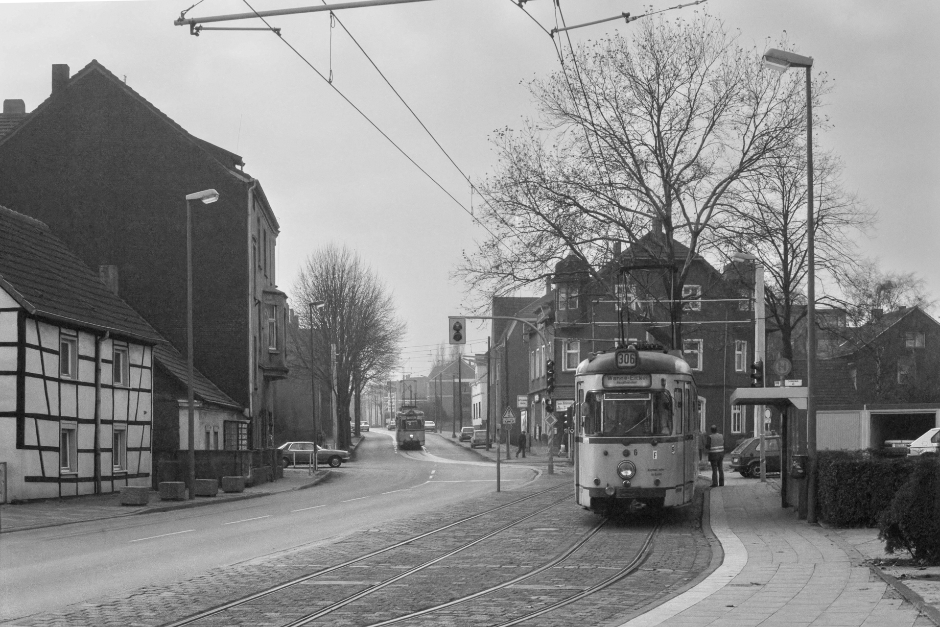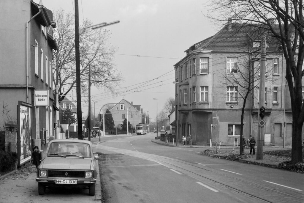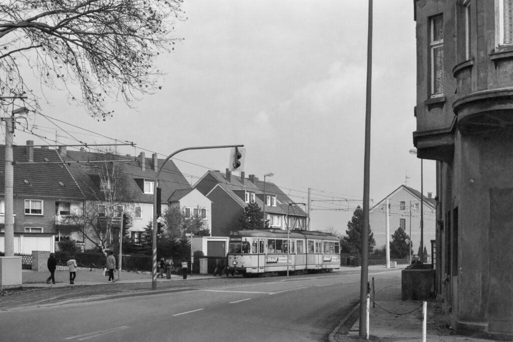 Vermutlich einen Tag später, am 17., war ich nochmal in Gerthe bzw. etwas südlich davon, in Hiltrop. Hier, etwas südlich des ehemaligen Betriebshofes Gerthe, gibt es entlang des Castroper Hellwegs ebenfalls noch Häuser aus den 30er Jahren, die sogar modernisiert wurden und heute noch stehen. Die Gesamtsituation hat sich allerdings stark verändert. Damals fuhr die Straßenbahn auf einem besonderen Bahnkörper neben der Straße, seit 1984 ist die Straße vierspurig mit den Gleisen der Straßenbahn in der Mitte.