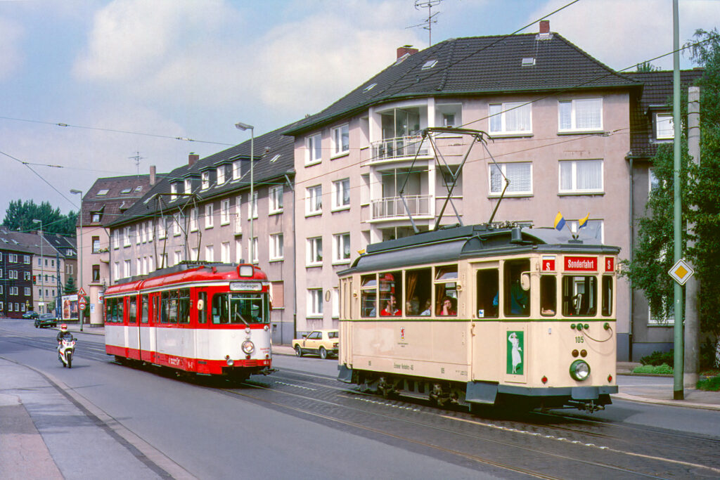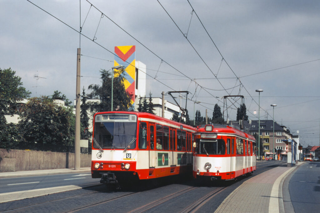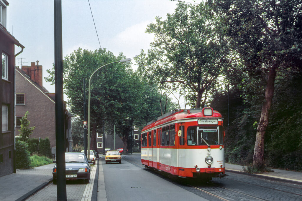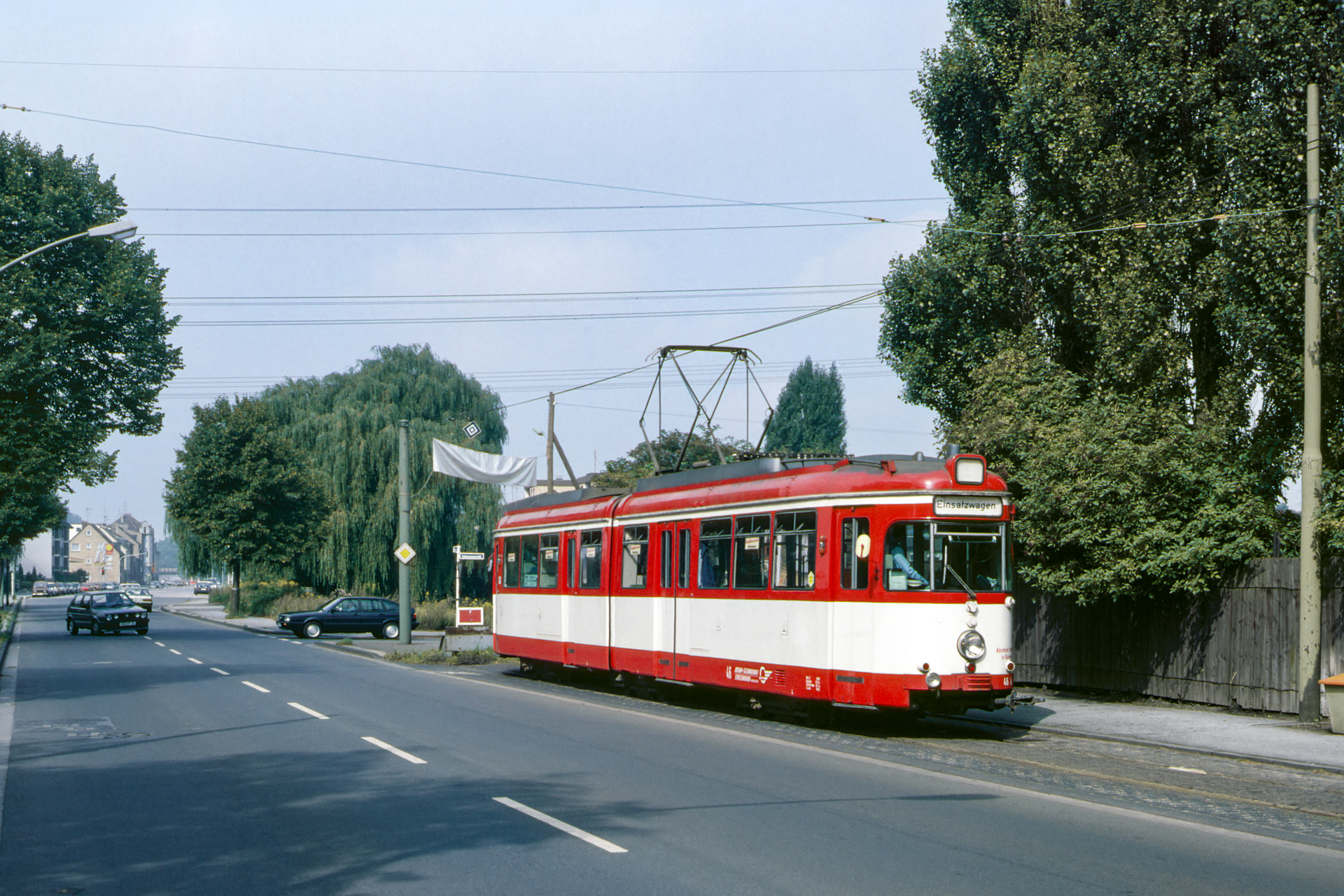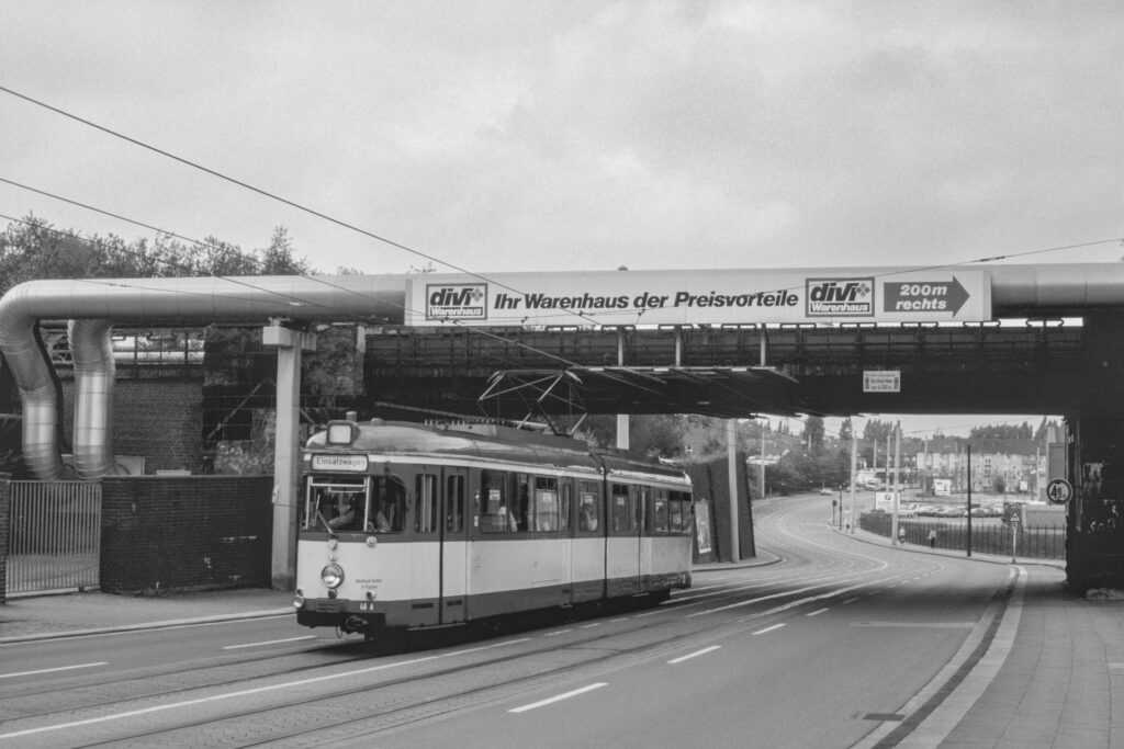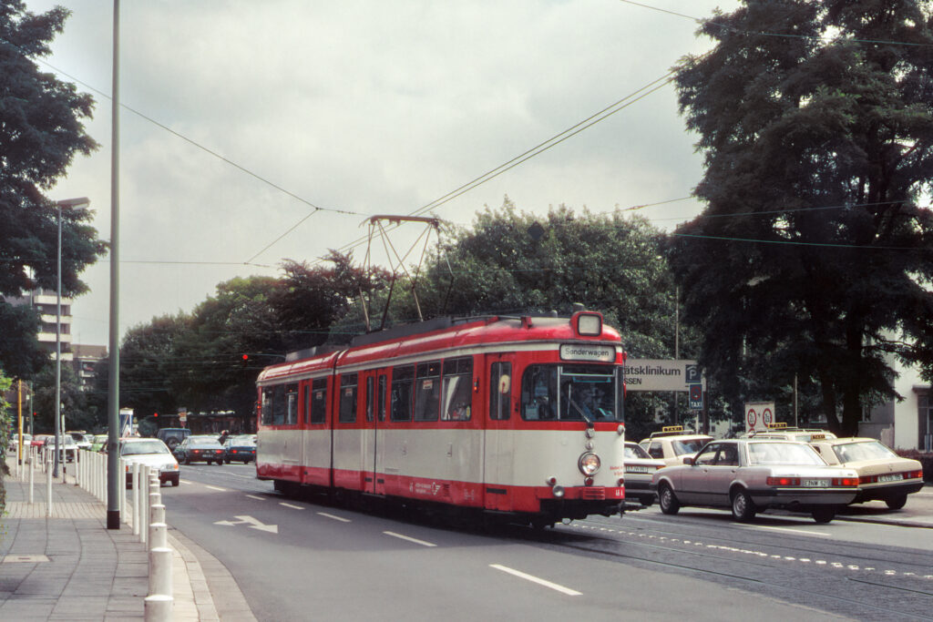 In Fahrtrichtung Rüttenscheid begegnet uns auf der Heinitzstraße kurz vor dem Bahnhof Essen West der Tw 105 der Bergischen Museumsbahnen. Der war damals nach Essen ausgeliehen und wurde auf den „Maitember“ Rundfahrten eingesetzt.Noch ein Foto dieser BegegnungJetzt sind wir in die andere Richtung unterwegs, und zwar vor dem Universitätsklinikum kurz vor der Einfahrt in die Schleife Holsterhauser Platz
